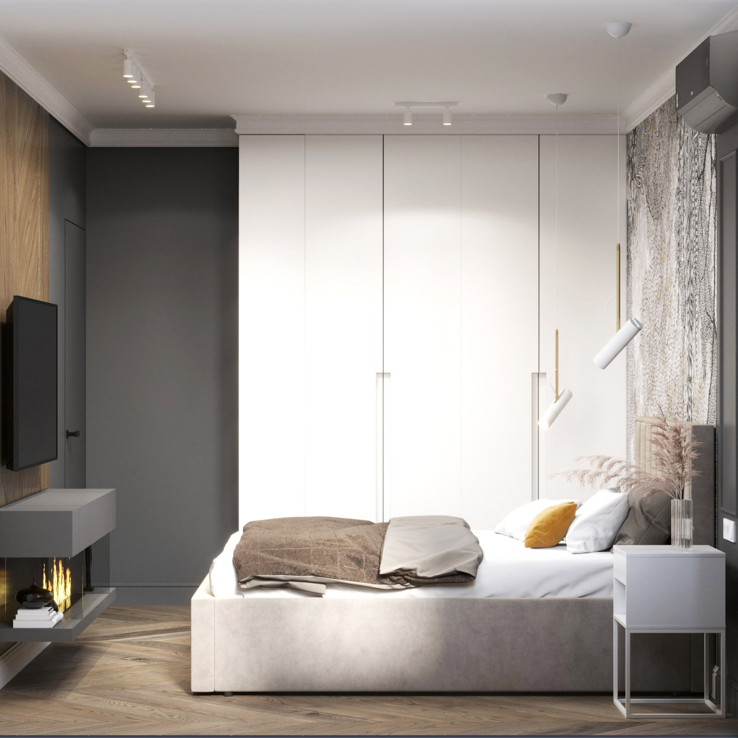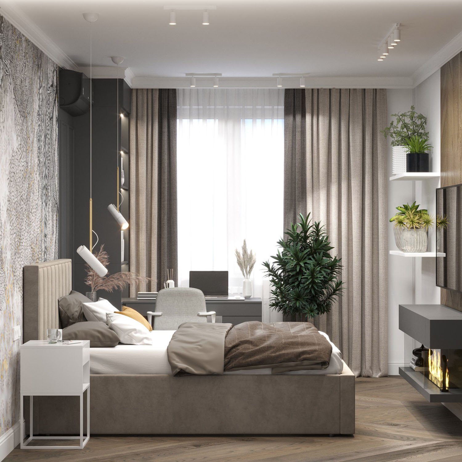 Спальня в однокомнатной квартире общей площадью 38 м² в Московской области. Заказчик делал ее для своих родителей. Пожелания по дизайну – просто и стильно, нейтральная цветовая гамма, мебель из бюджетных вариантов на заказ. Акцентами в отделке стали обои у изголовья и деревянная панель напротив. Комната вместила зону отдыха, зону хранения, рабочее место и зону для растений.