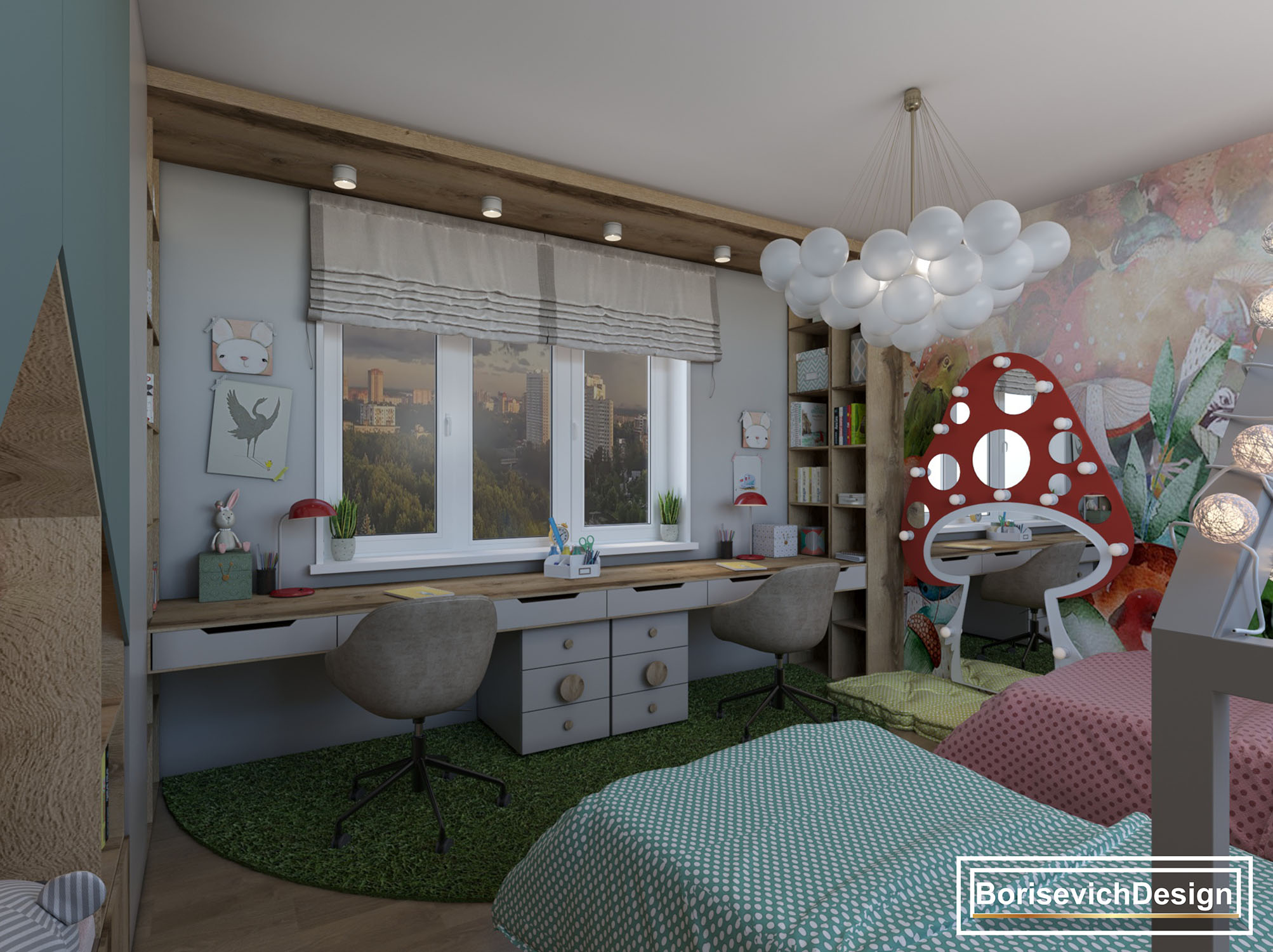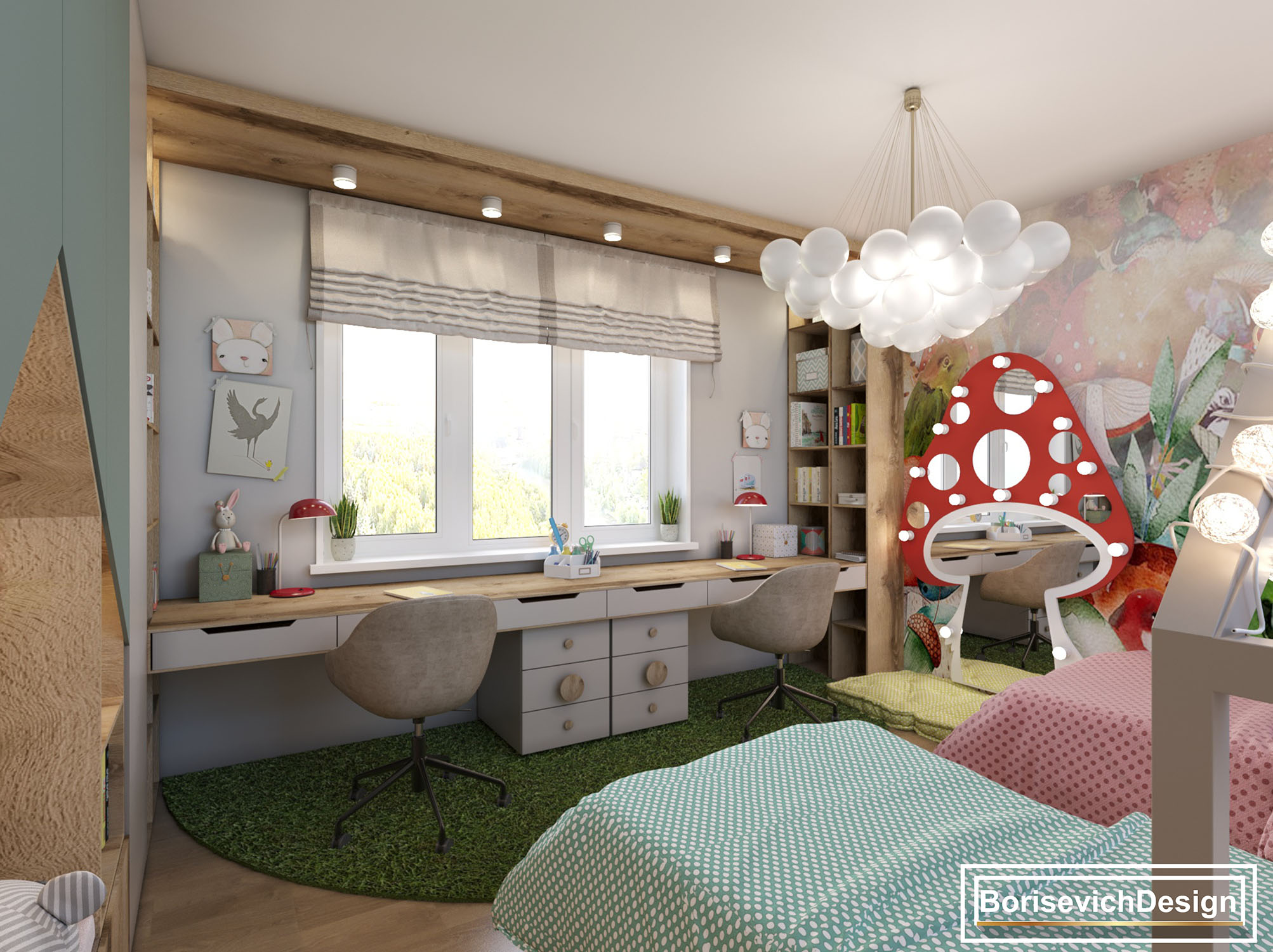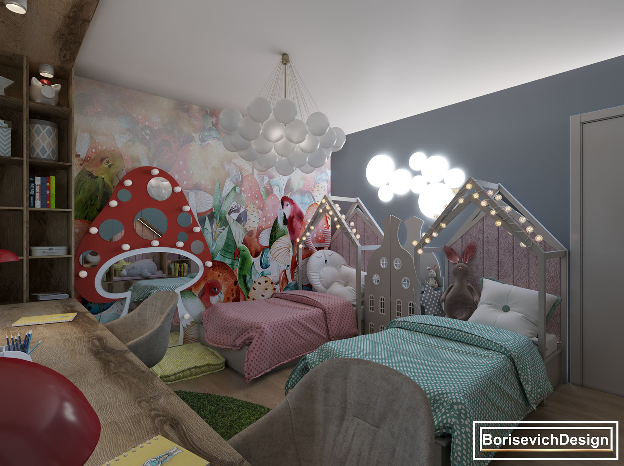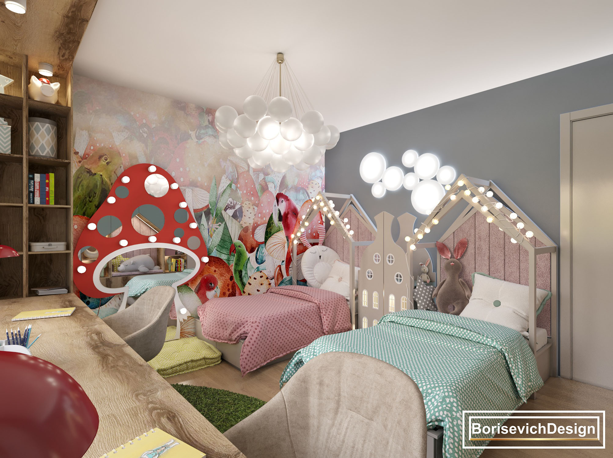 Заказчикам очень понравились коллекция Wonderland, с которой дизайнеры скопировали грибочек и сделали из него зеркало с подсветкой. Благодаря обоям это стало изюминкой комнаты и самым любимым местом для игр у девочек.