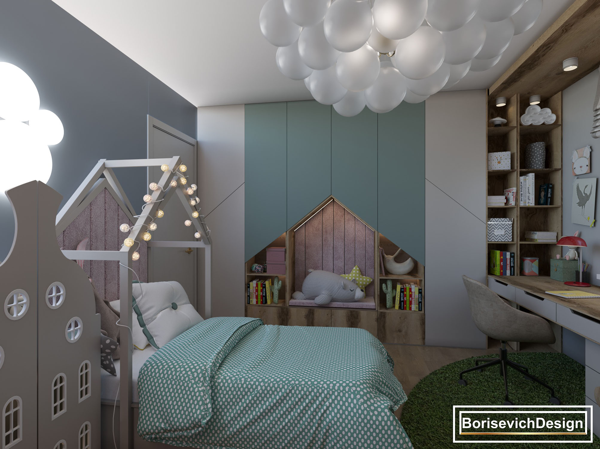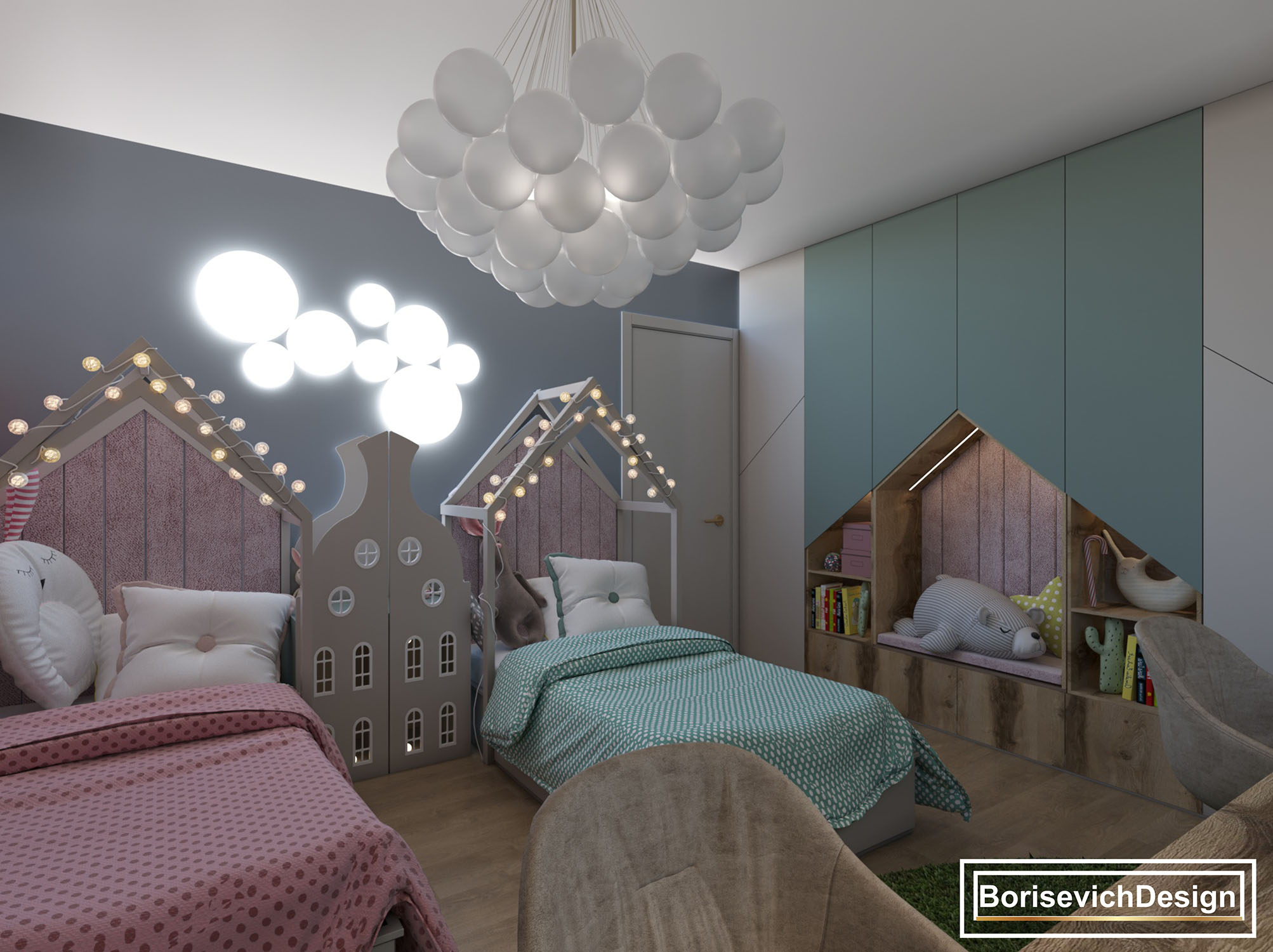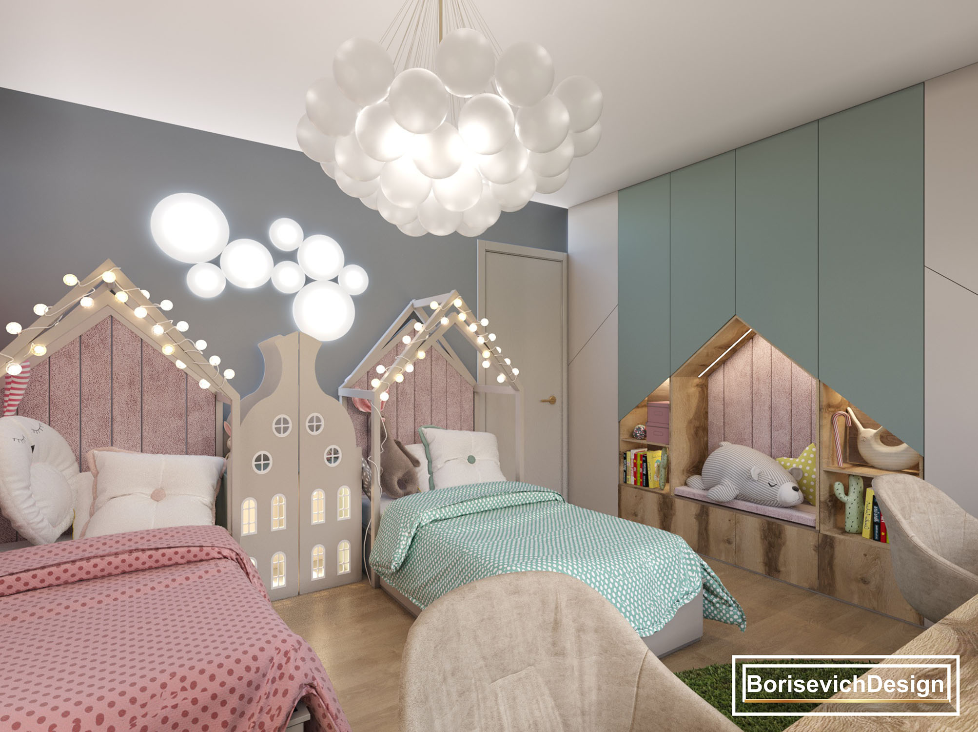 Спальня для двух девочек возрастом 2 и 4 года, г. Сочи. Площадь детской — 21 м². Задача была сделать детскую как для дошкольного возраста, так и на начальную школу. В комнате должно быть все функционально, раздельные кровати и обязательно место для игр.