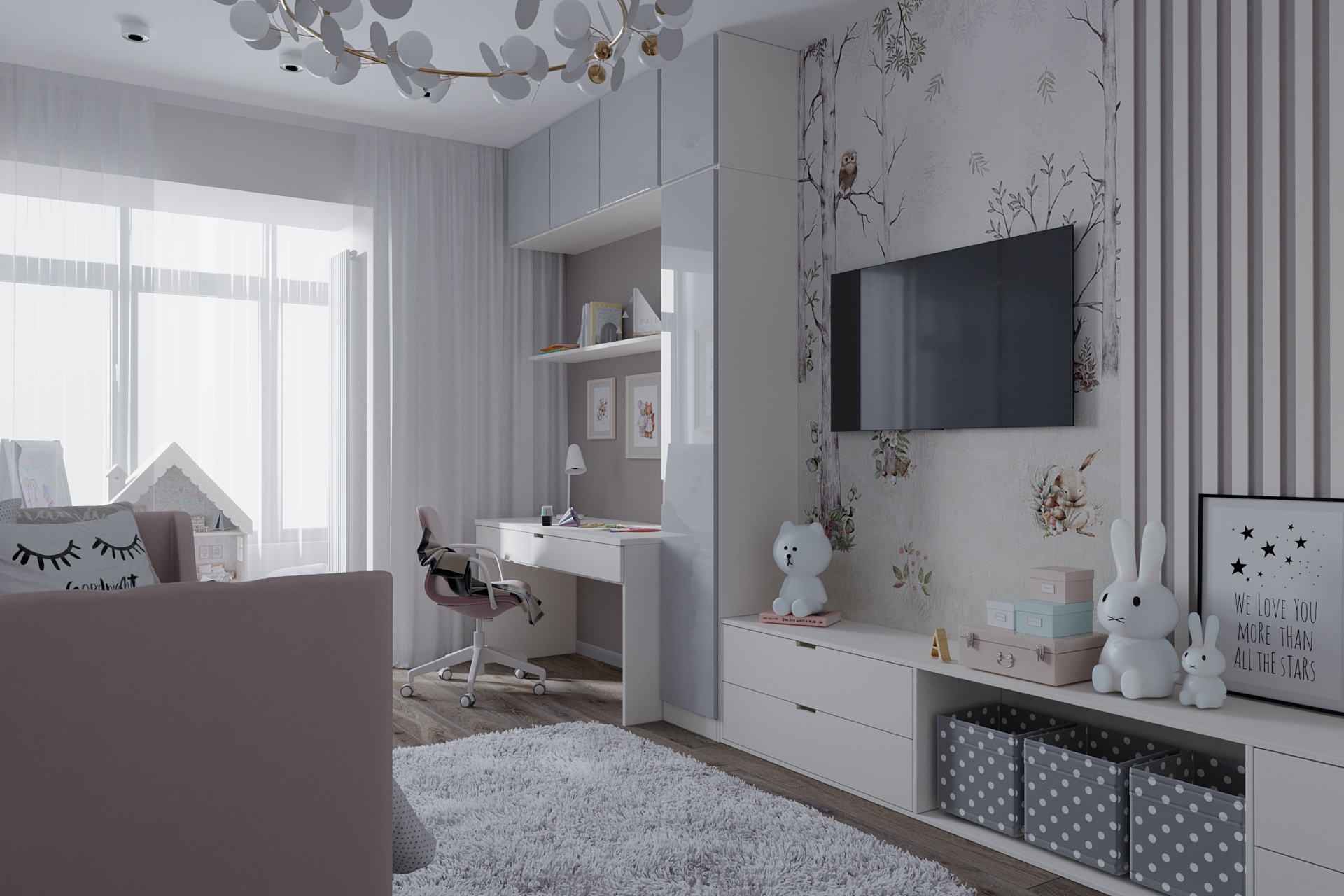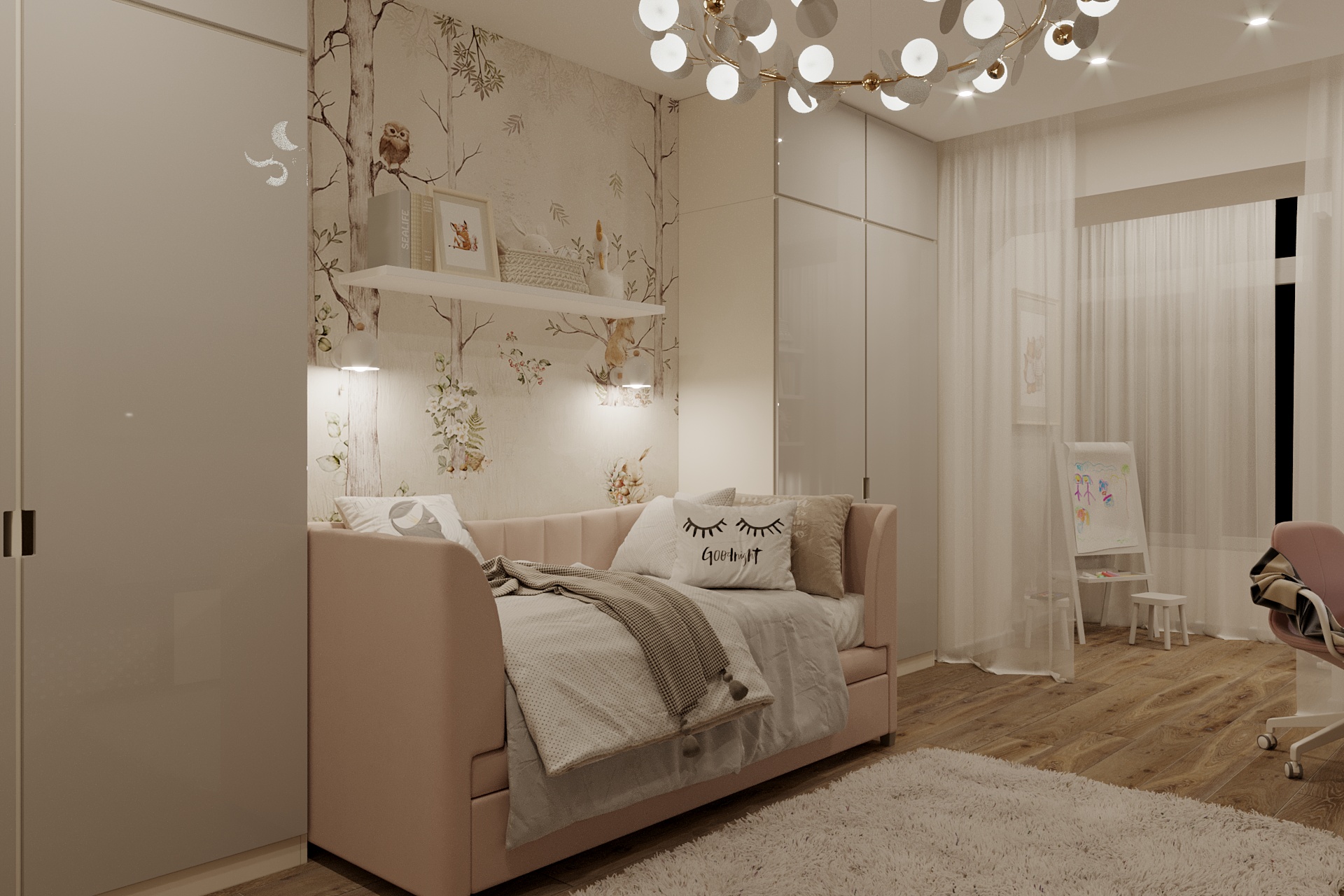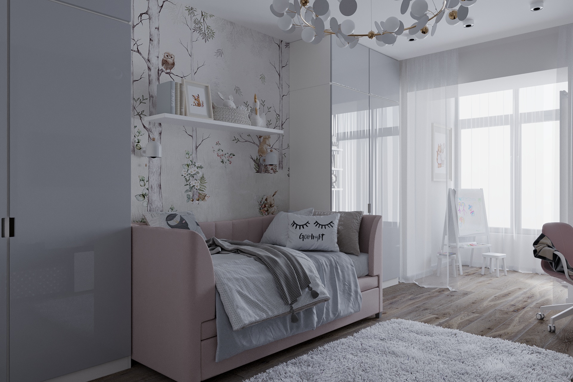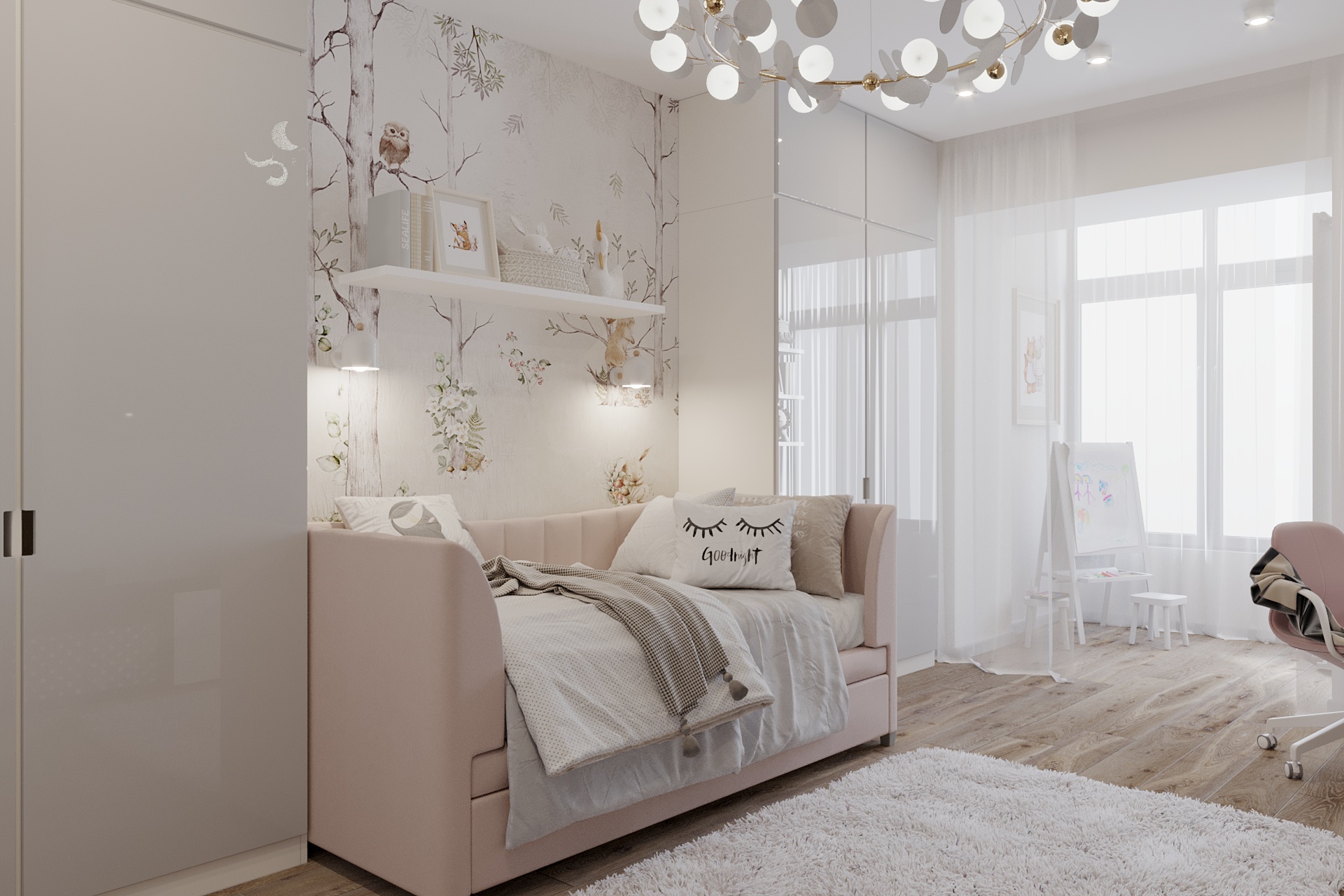 Детская комната площадью 15 м² в г. Благовещенск Амурской области. Здесь будет жить маленькая девочка Вера, которой 4 годика. Пожеланием заказчиков было сделать комнату нежной и чтобы она осталась актуальной, когда девочка подрастет.