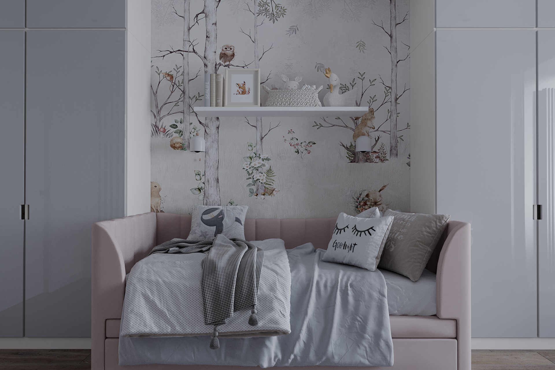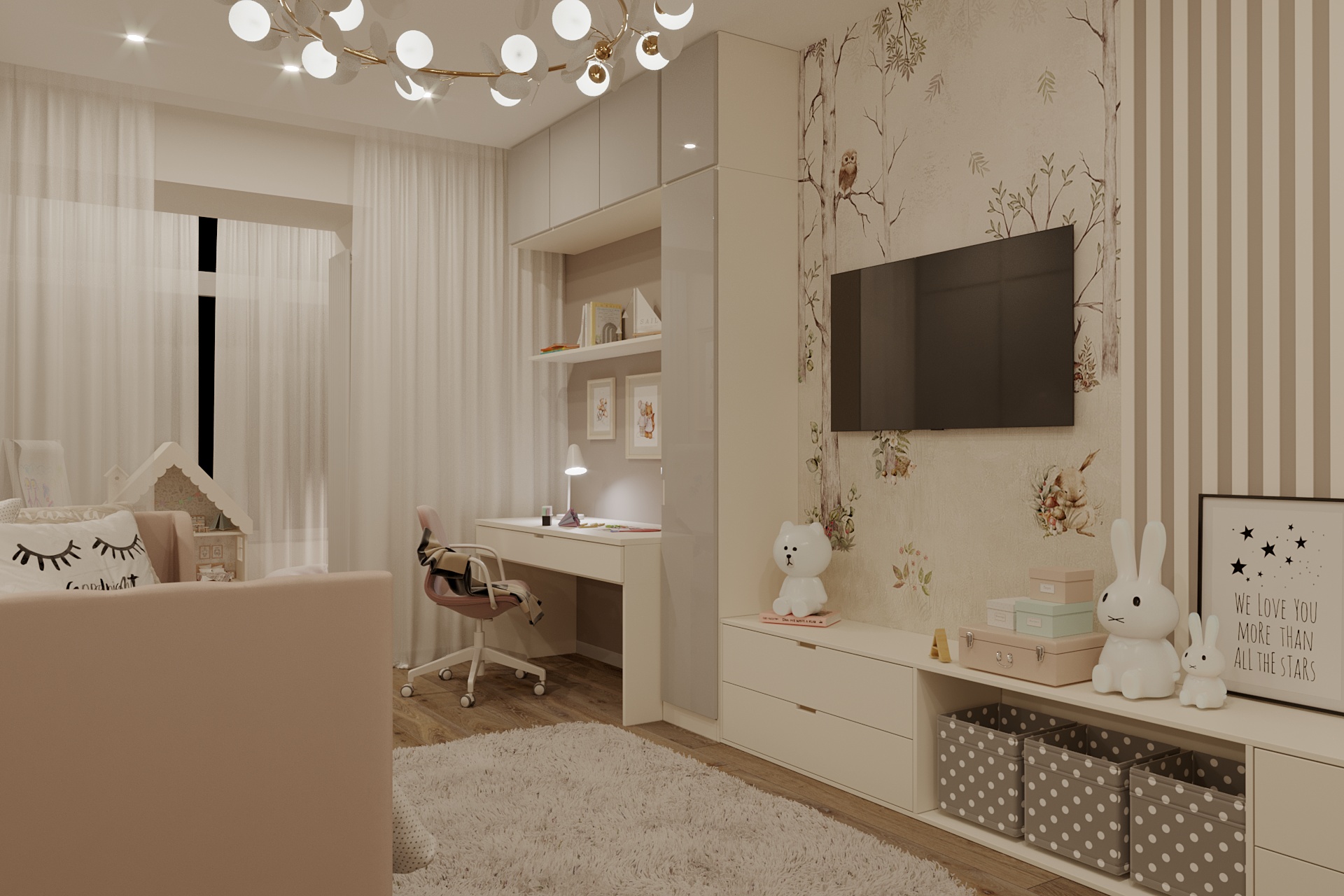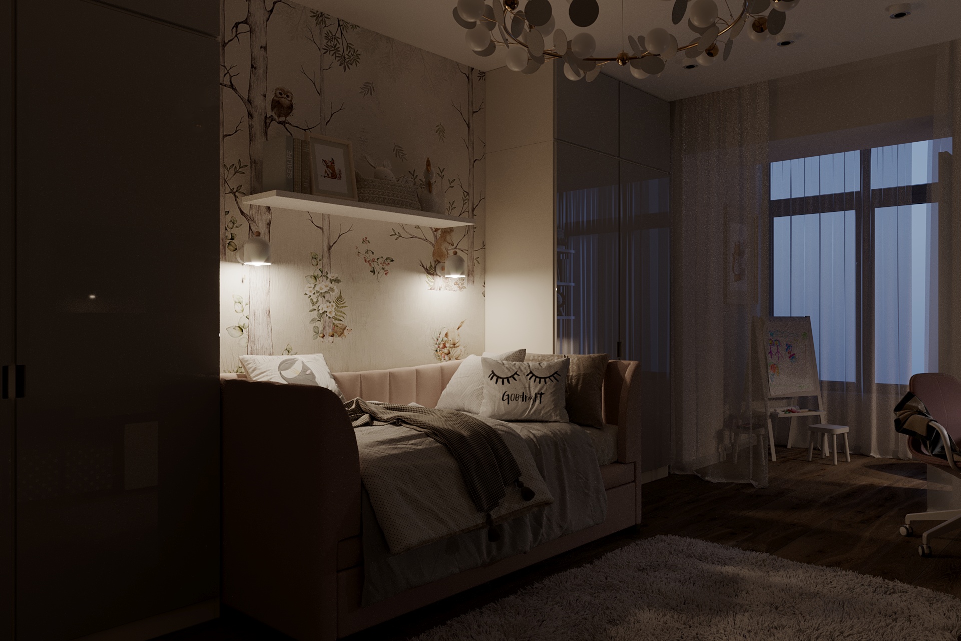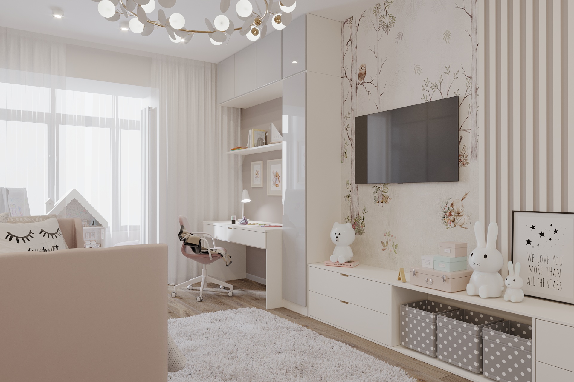 Детская комната площадью 15 м² в г. Благовещенск Амурской области. Здесь будет жить маленькая девочка Вера, которой 4 годика. Пожеланием заказчиков было сделать комнату нежной и чтобы она осталась актуальной, когда девочка подрастет.