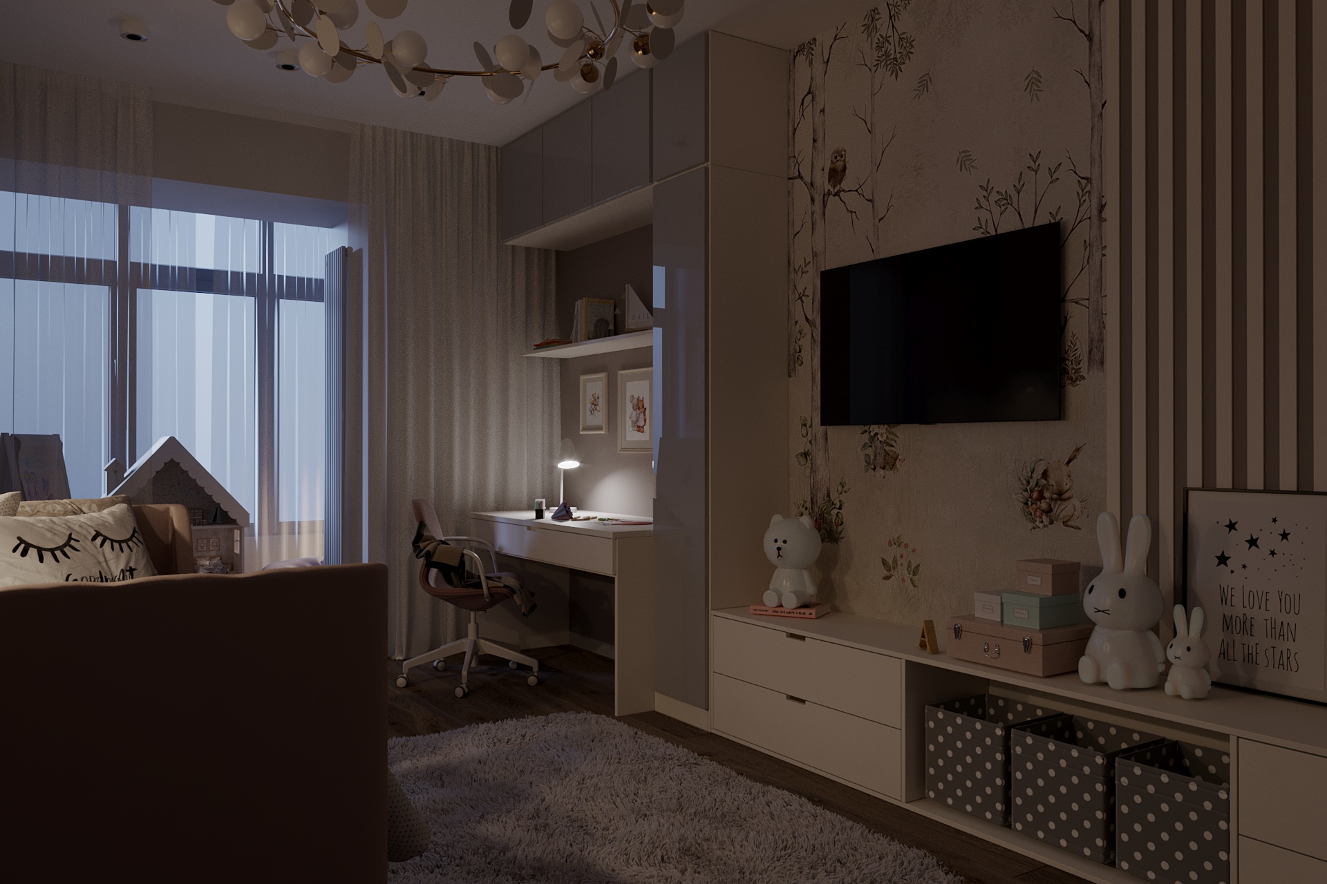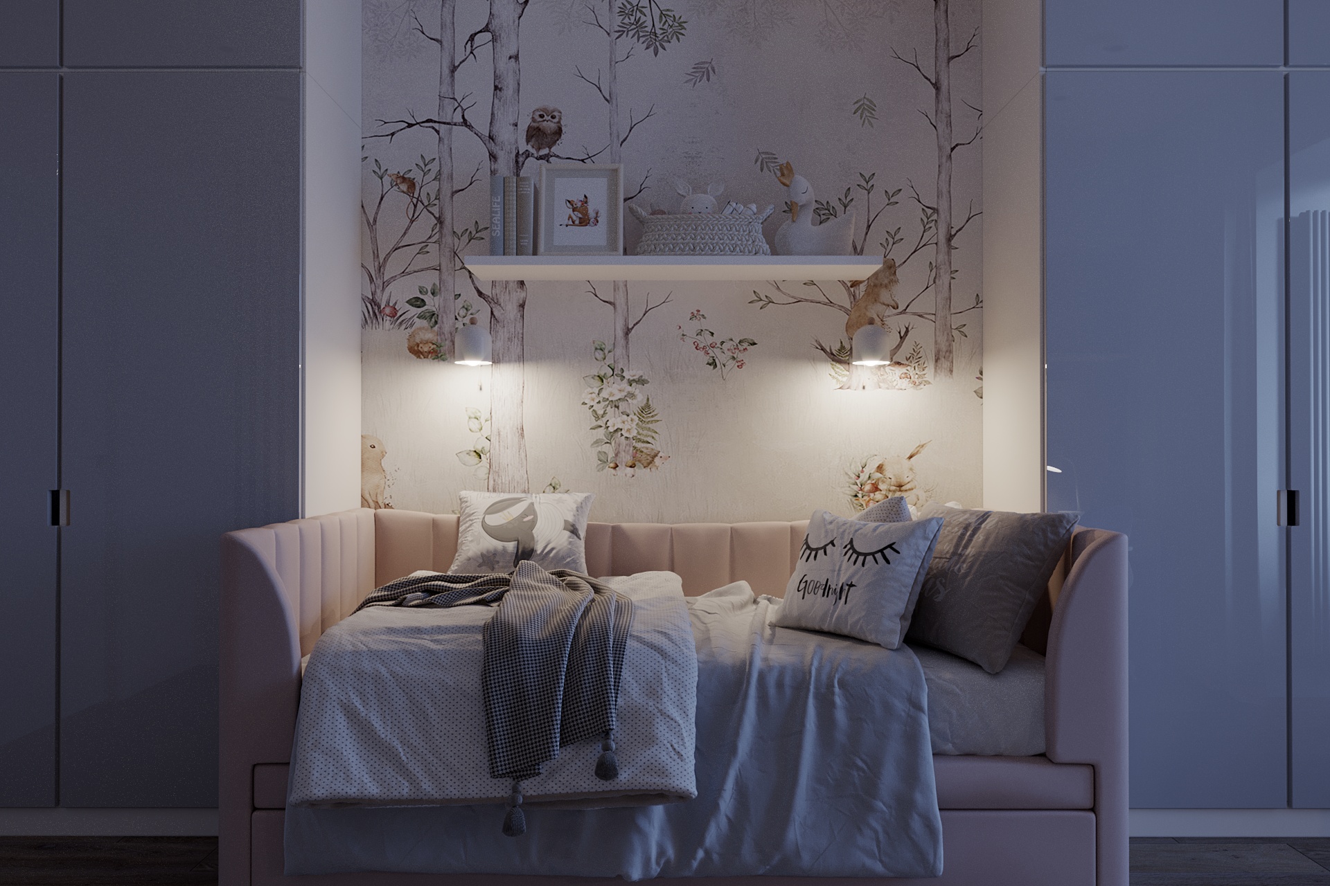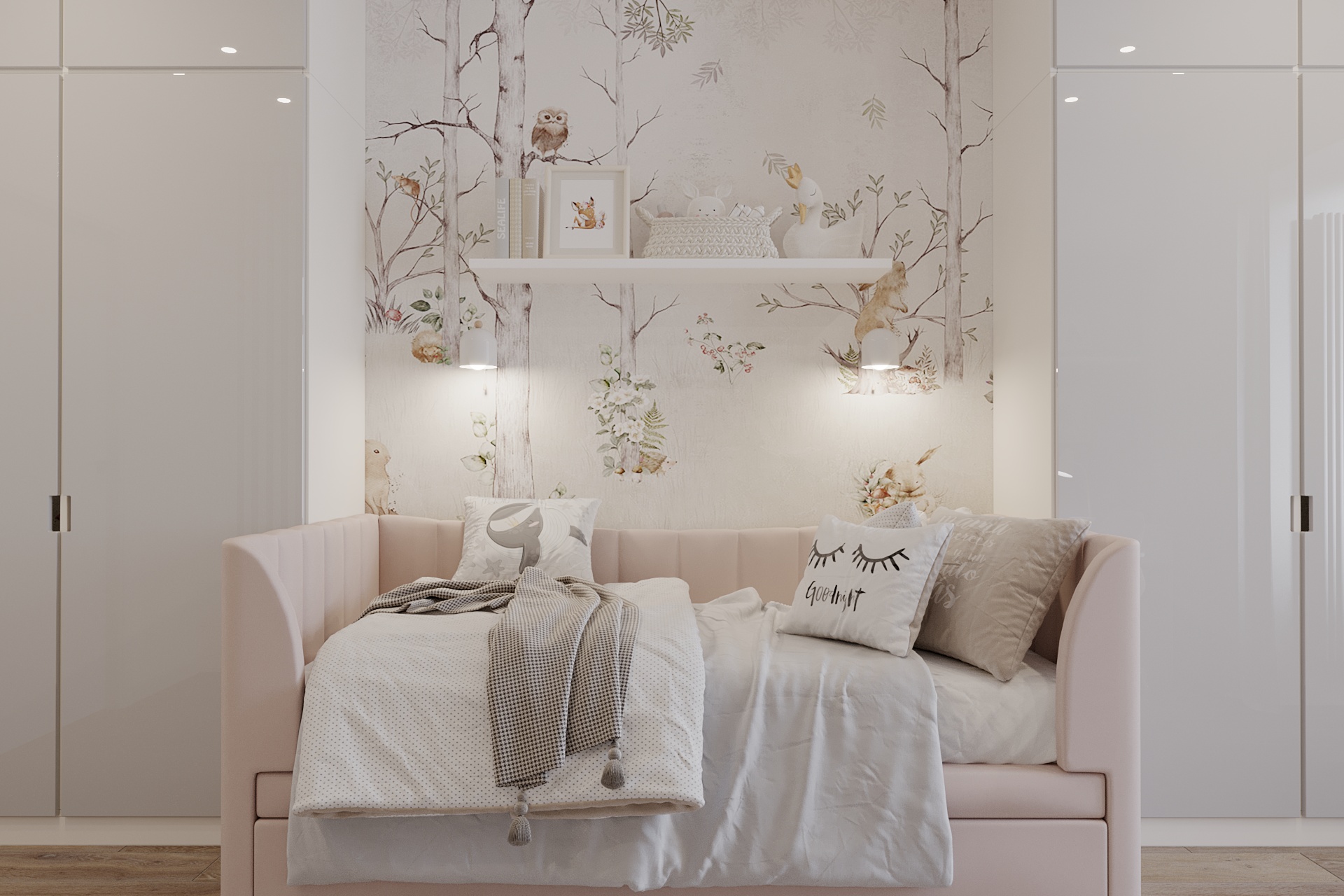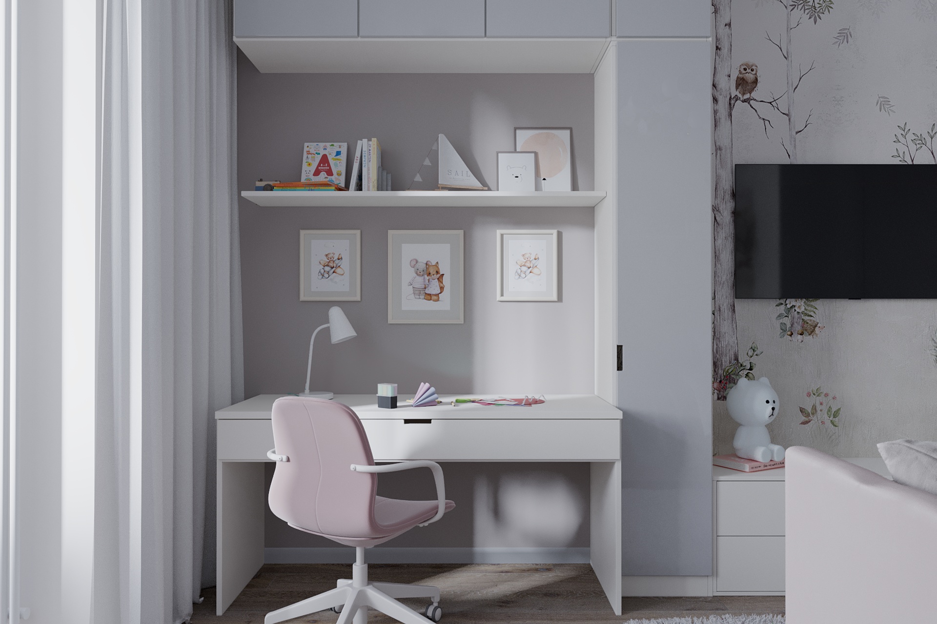 Детская комната площадью 15 м² в г. Благовещенск Амурской области. Здесь будет жить маленькая девочка Вера, которой 4 годика. Пожеланием заказчиков было сделать комнату нежной и чтобы она осталась актуальной, когда девочка подрастет.