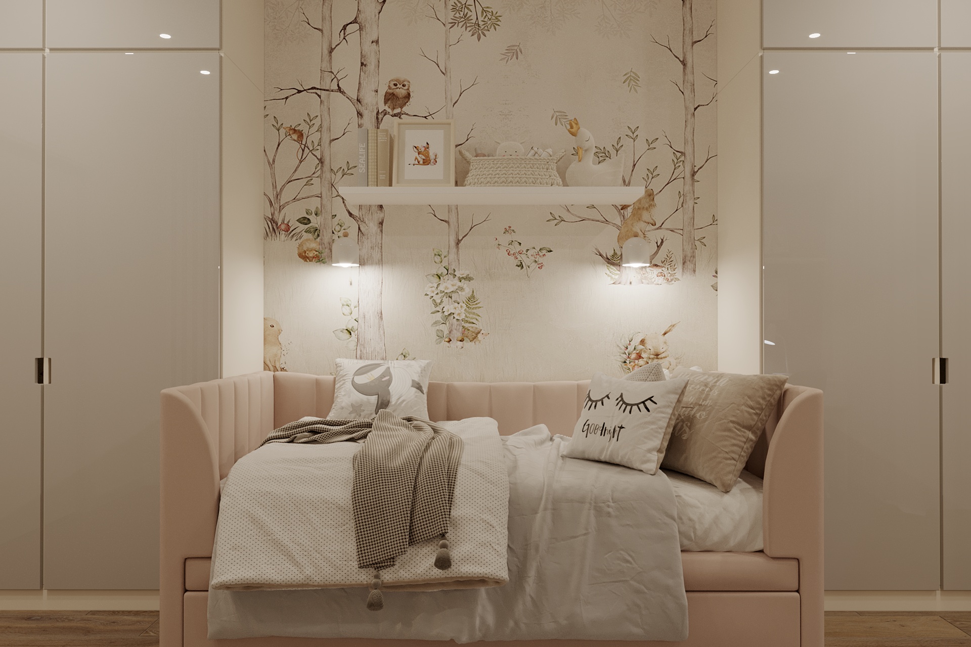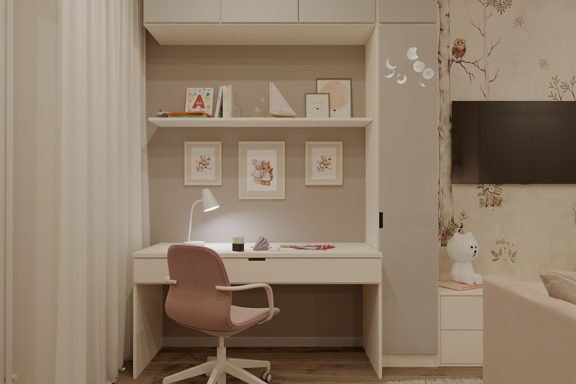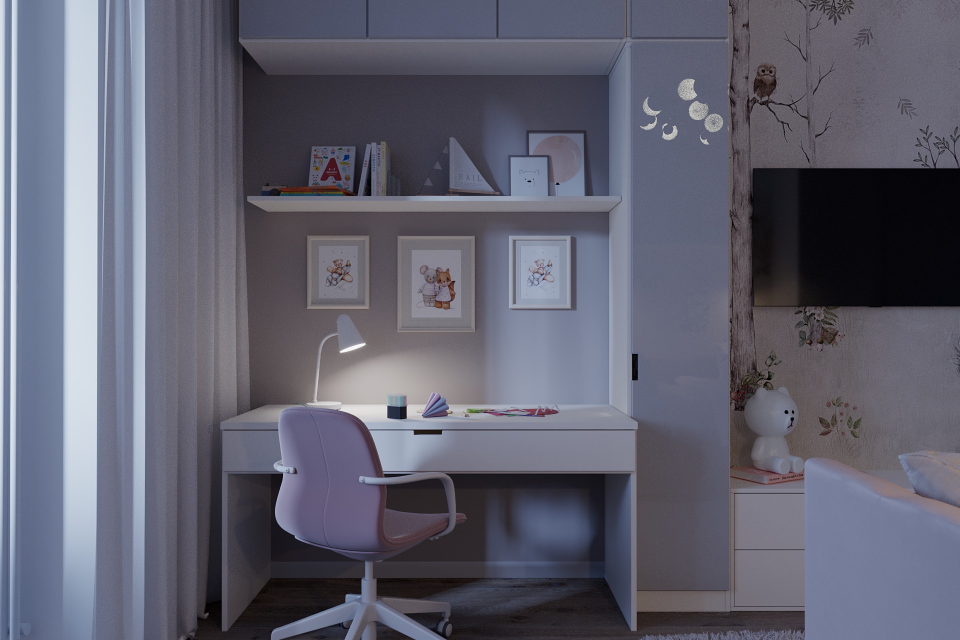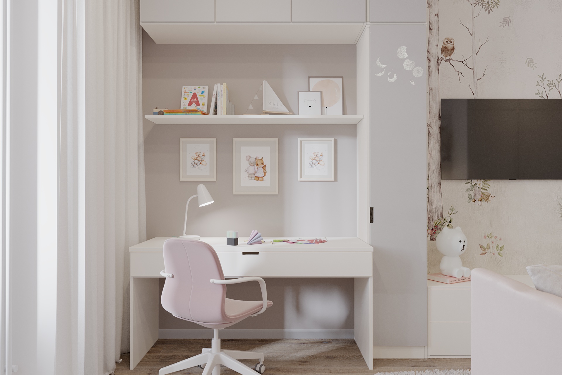 Детская комната площадью 15 м² в г. Благовещенск Амурской области. Здесь будет жить маленькая девочка Вера, которой 4 годика. Пожеланием заказчиков было сделать комнату нежной и чтобы она осталась актуальной, когда девочка подрастет.