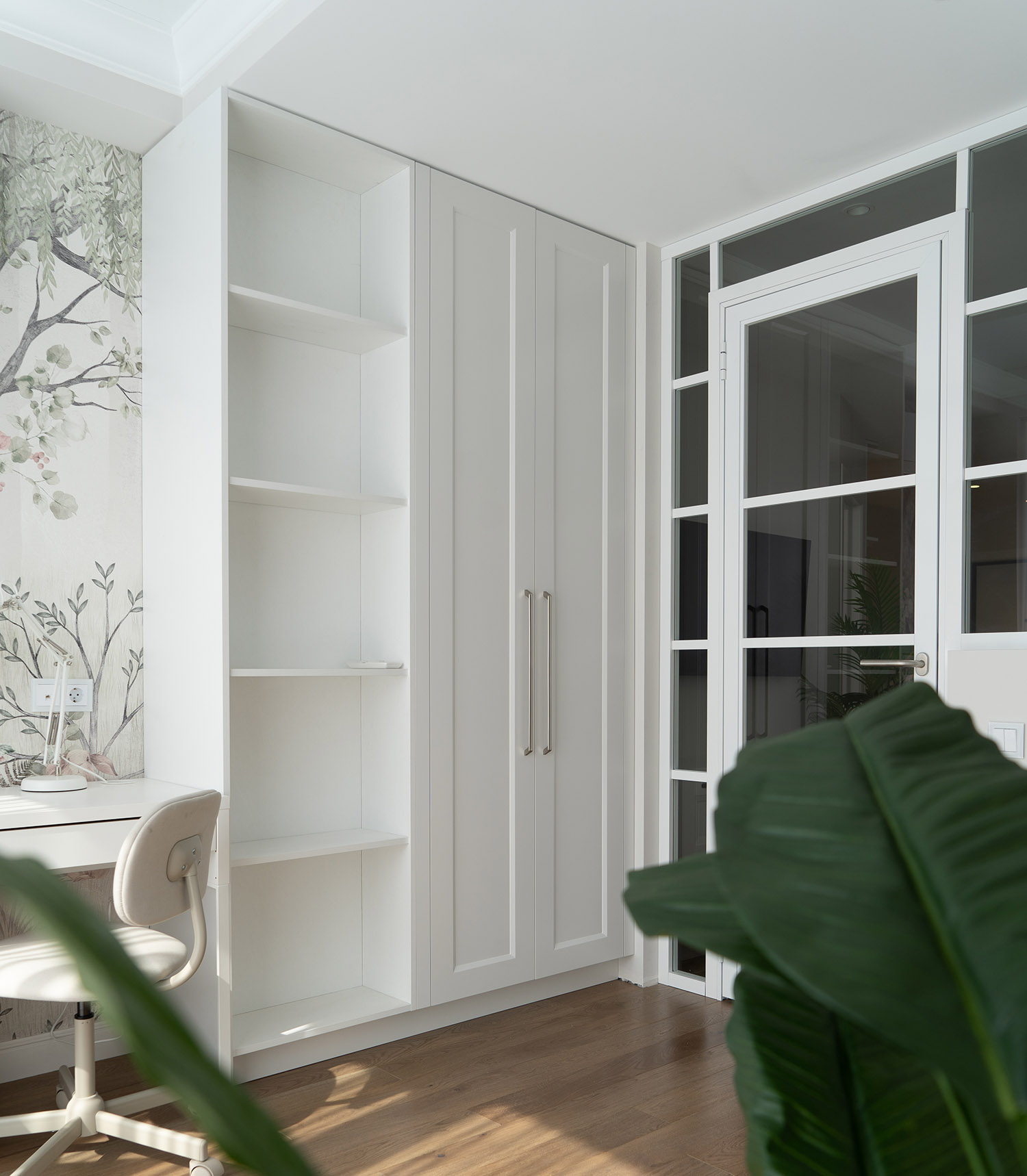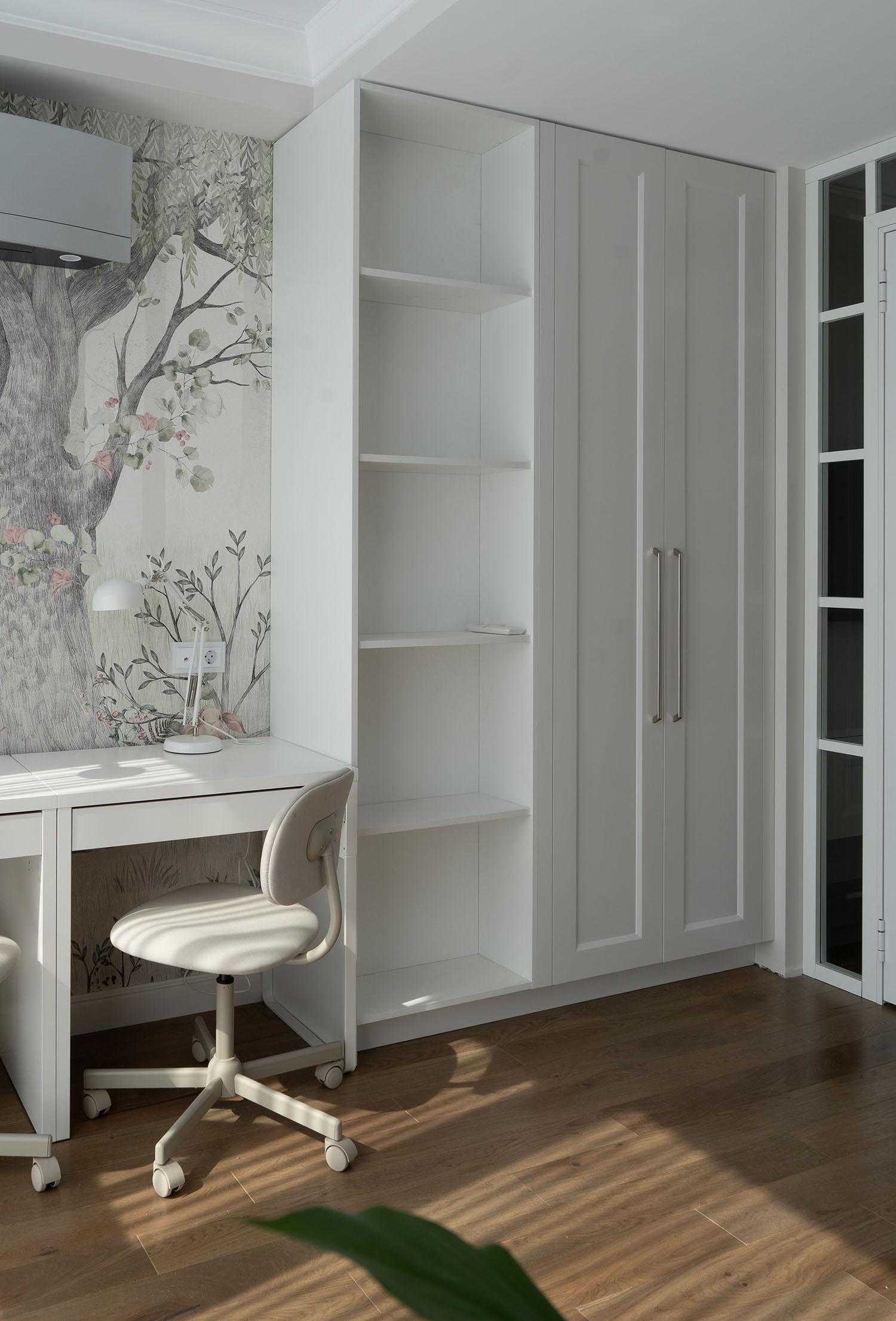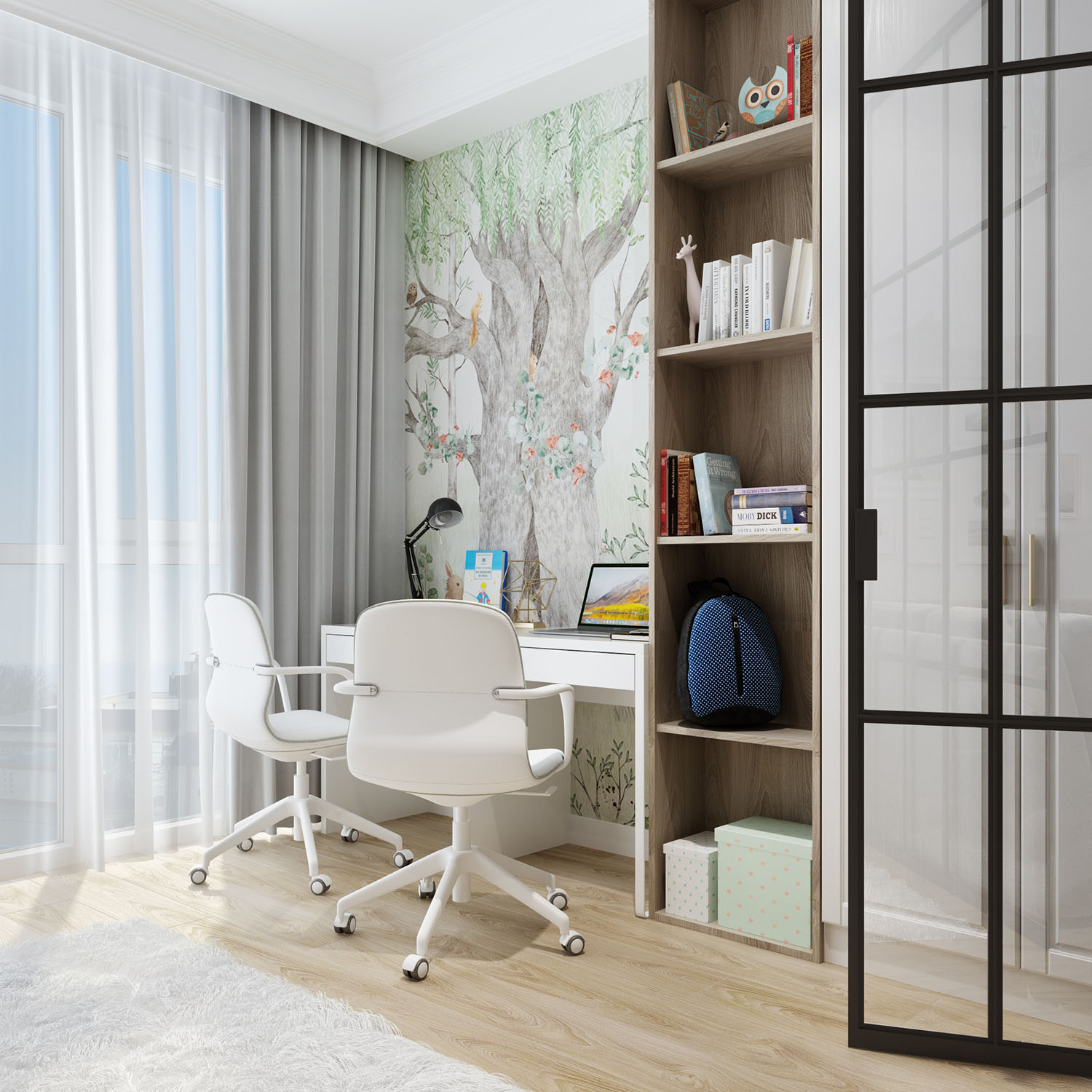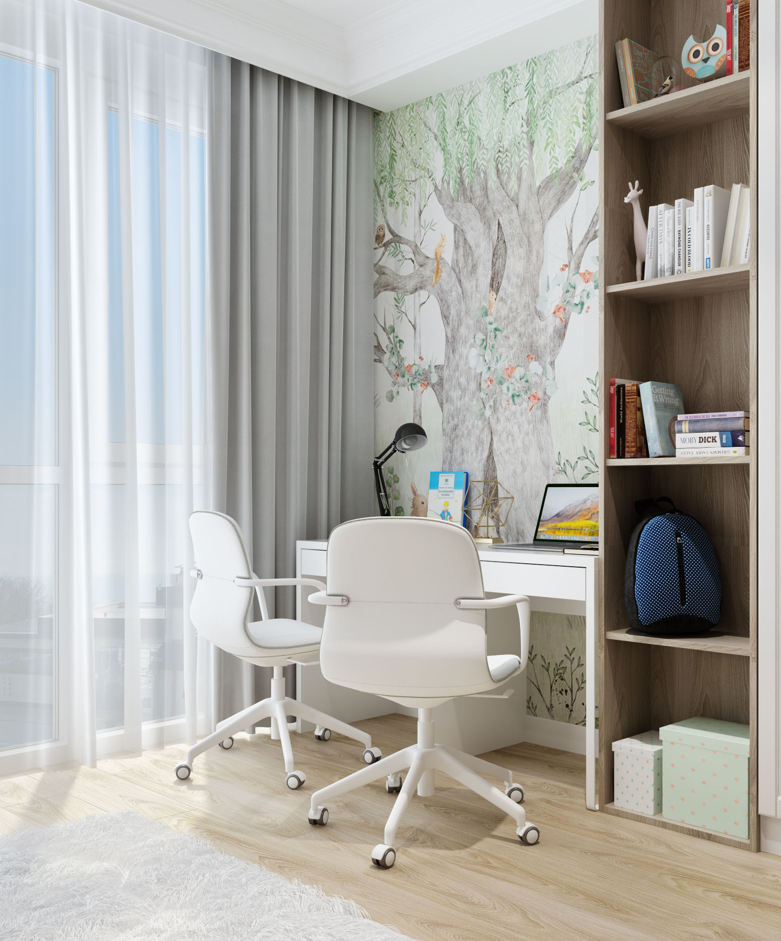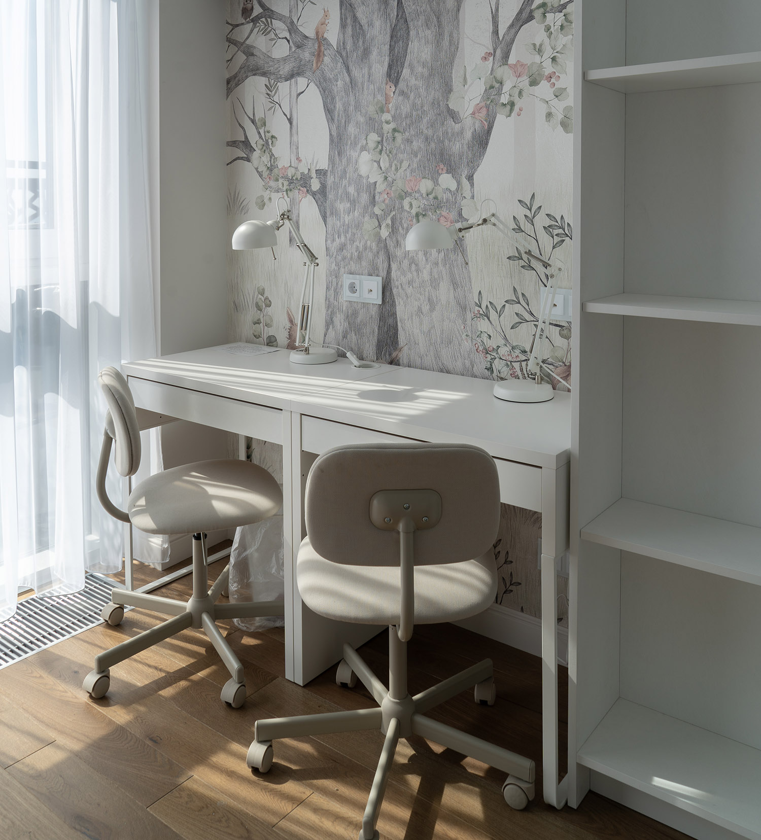 Детская комната в светлых тонах. Обои из коллекции Woody. Мишка косолапый, зайка-побегайка и другие любимые персонажи сказок помогут ребенку познакомиться с окружающим миром, а пастельные тона и лесной пейзаж создают психологически комфортную атмосферу.
