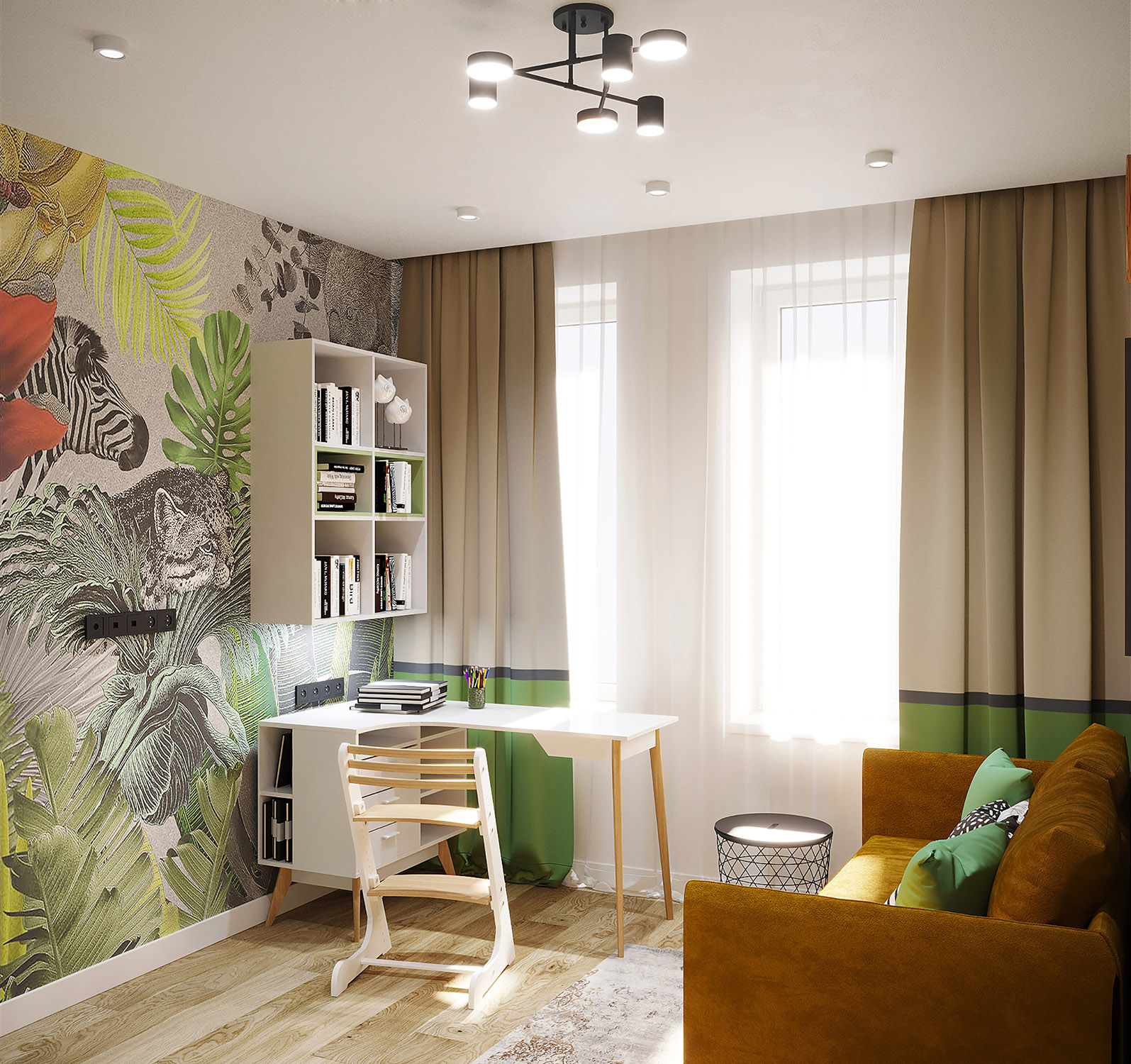Комната зонирована так, что у каждой зоны есть свое место, а это значит, что ни одна из зон не будет мешать учебному процессу, отдыху и играм.