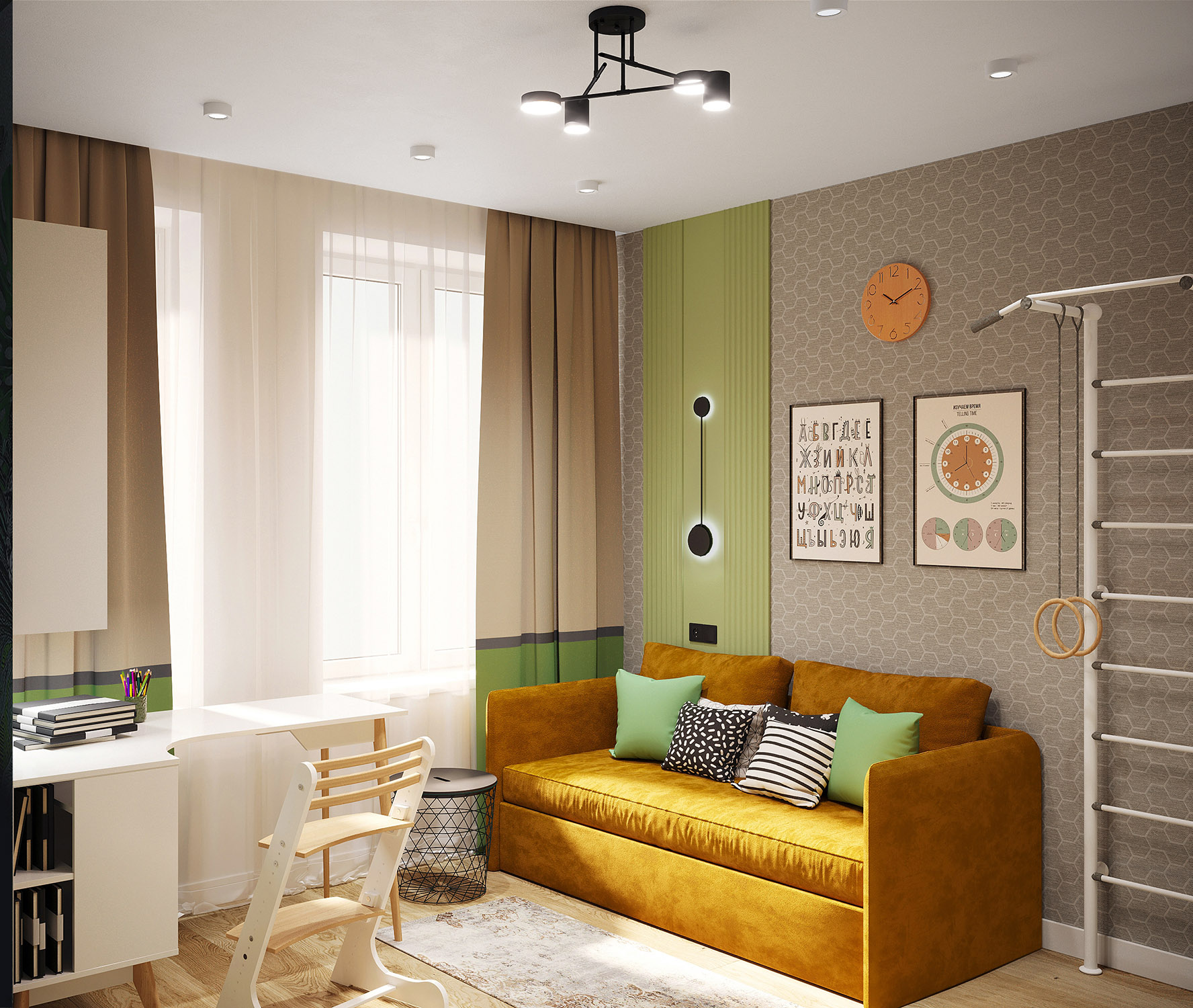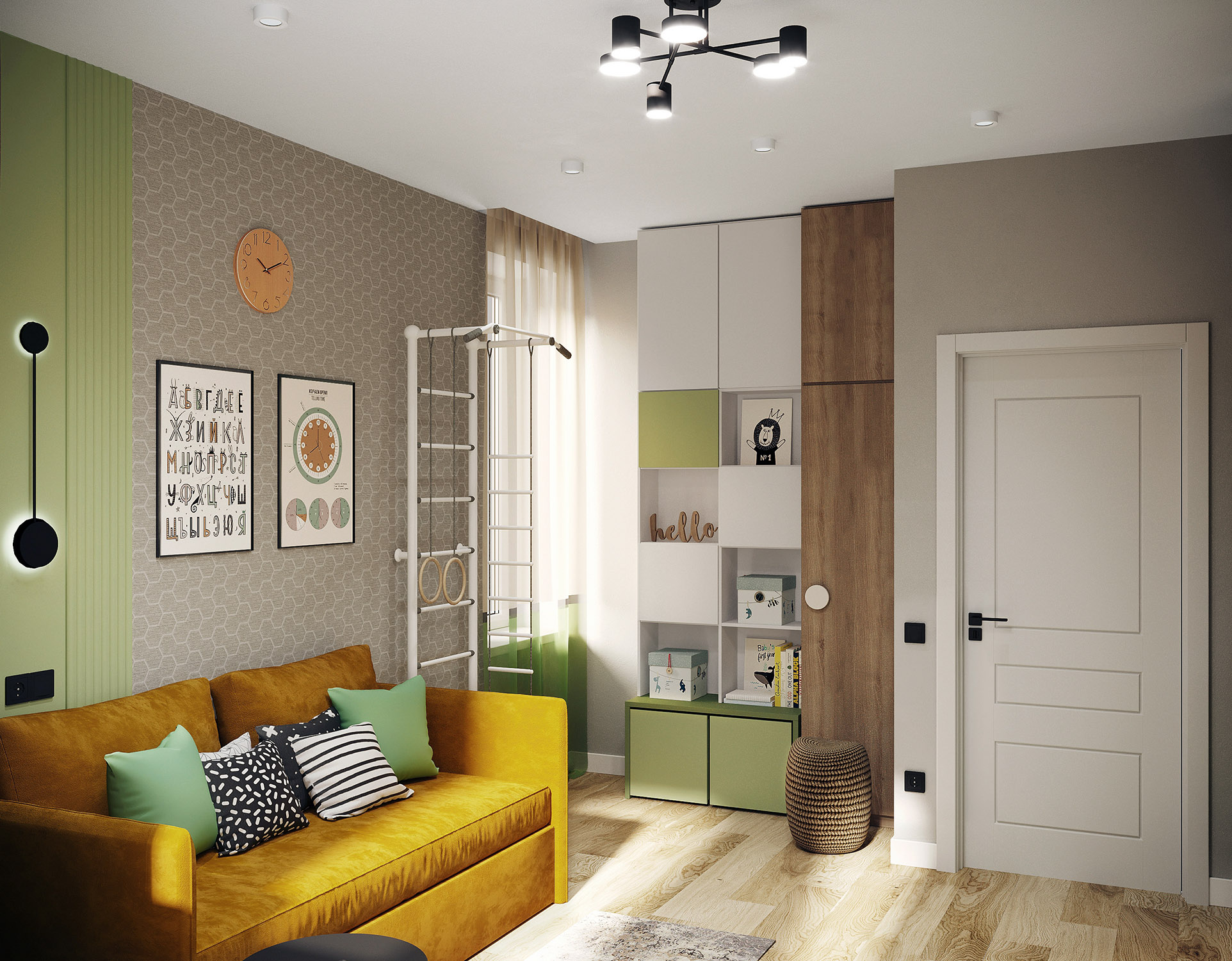 Детская комната в спокойных тонах с зелеными акцентами