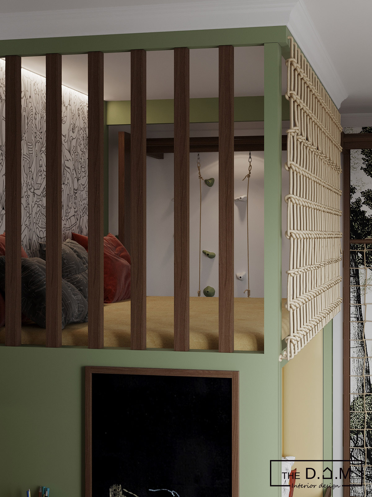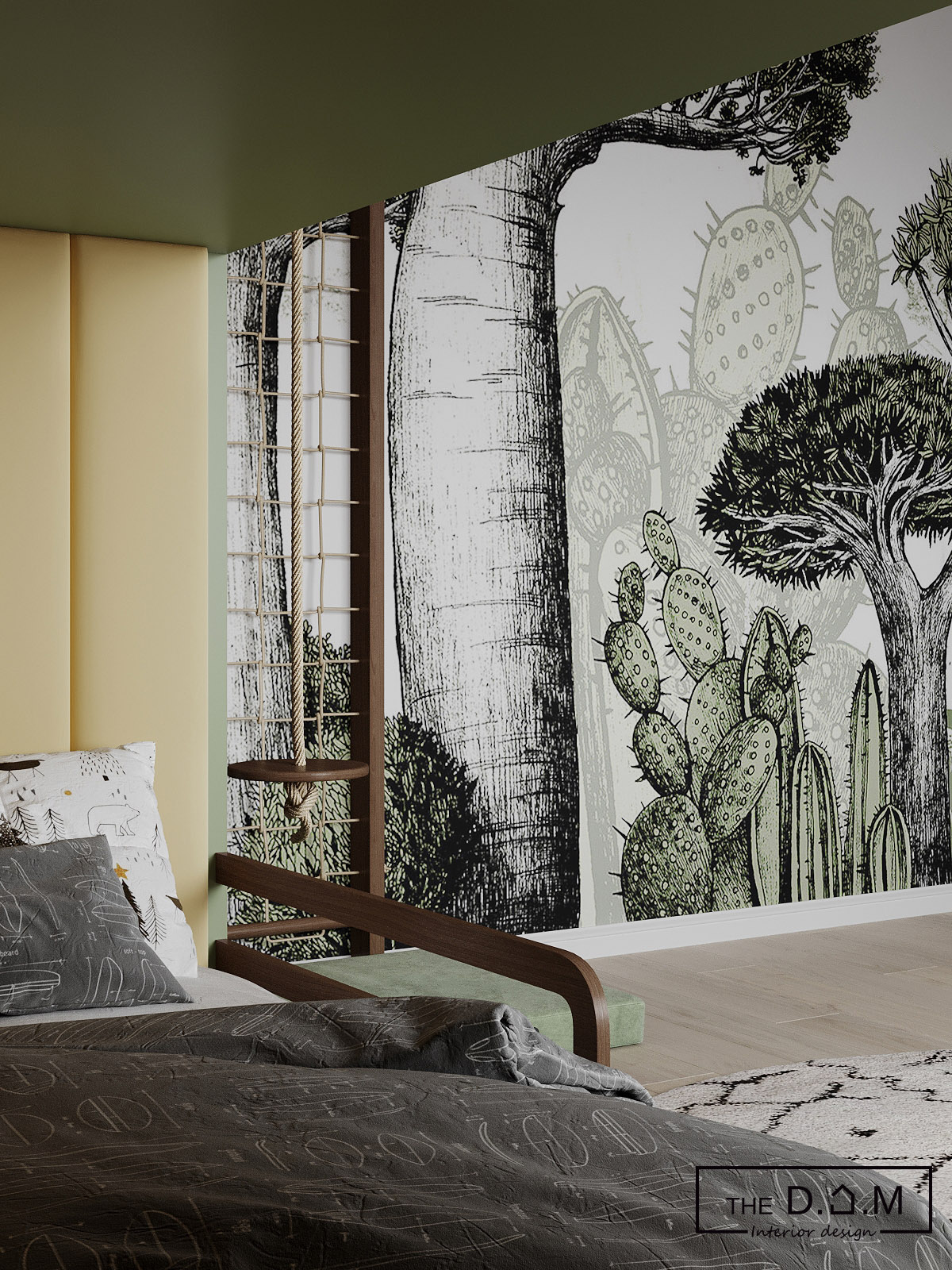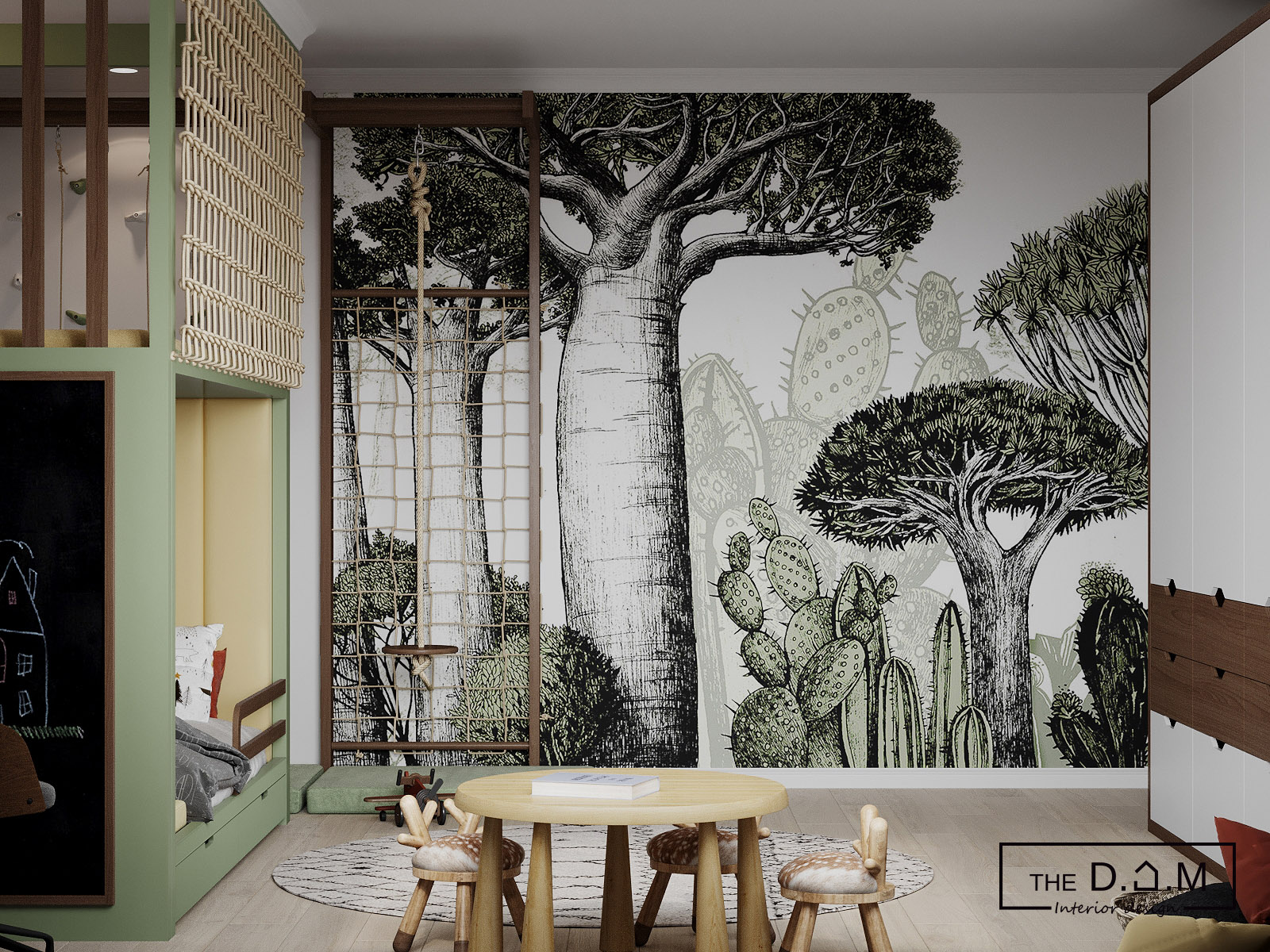 Обязательным было использование природных текстур оттенков и материалов. Изюминкой данной детской стали обои с необъятными баобабами из коллекции «Zoo».