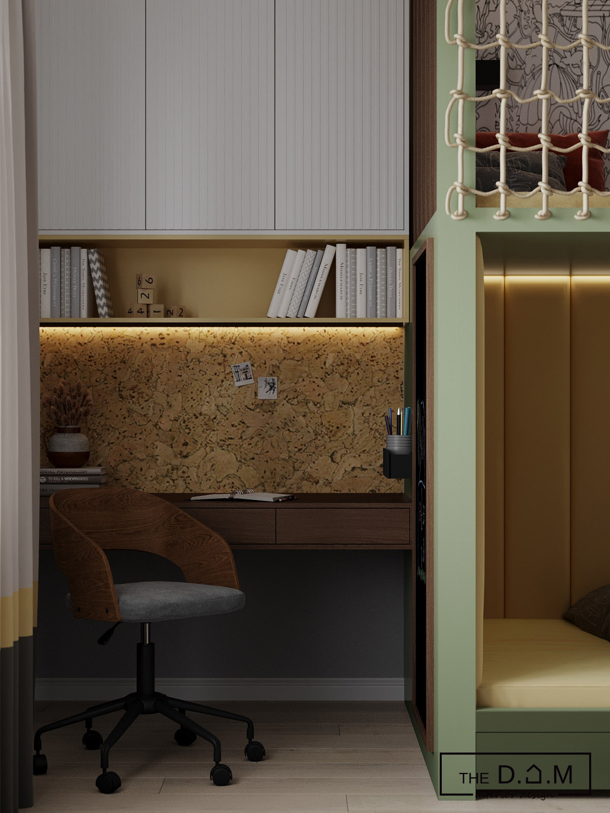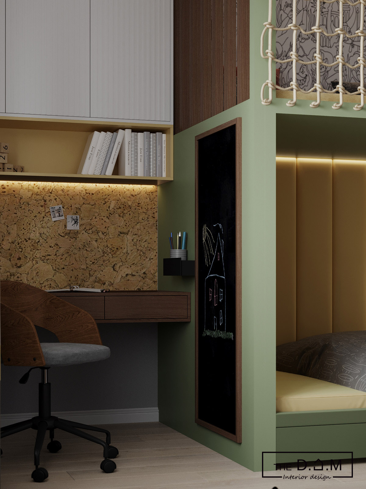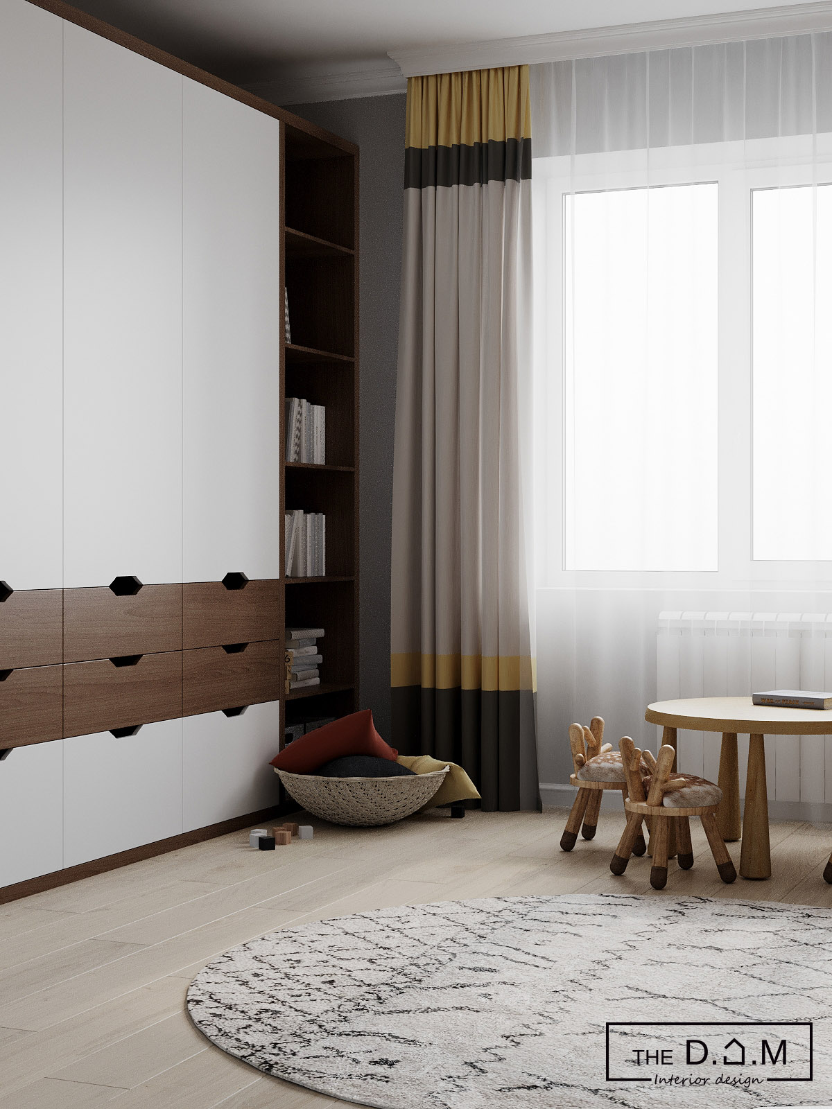 Проект детской комнаты площадью 24 м², г.Барнаул. Задачей было сделать детскую для мальчика, в которой ему будет интересно проводить время. Нужно было выбрать нейтральные оттенки, т.к. в планах у родителей ещё малыш, и предусмотреть ему спальное место. Также на будущее нужно запланировать рабочее место школьника и вписать существующий шкаф и шторы в интерьер.