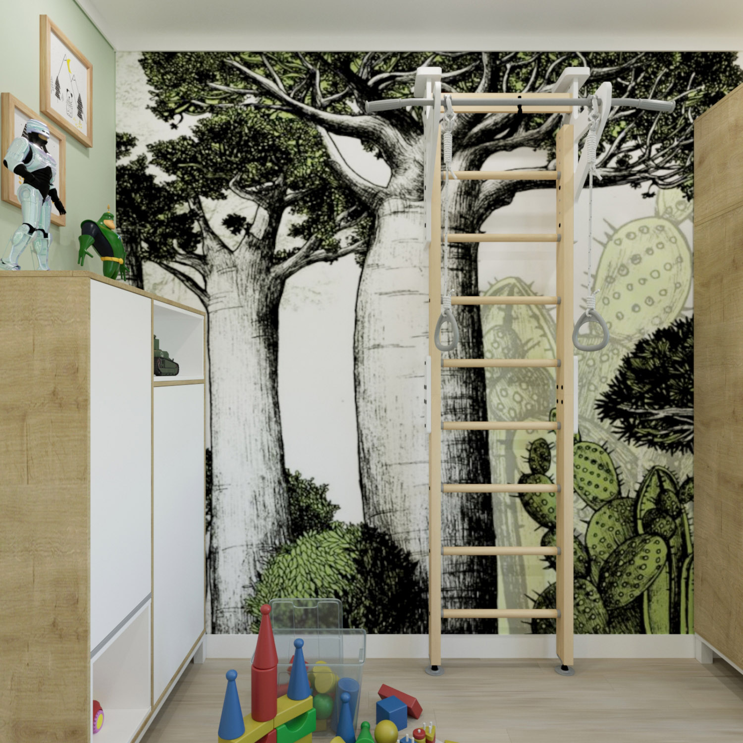 Это вторая детская проекта. В ней — волшебный лес из коллекции «Zoo». У большого дерева расположилась лестница, ребенок может забираться вверх и представлять, что он сидит на большом сказочном дереве в своем волшебном лесу.