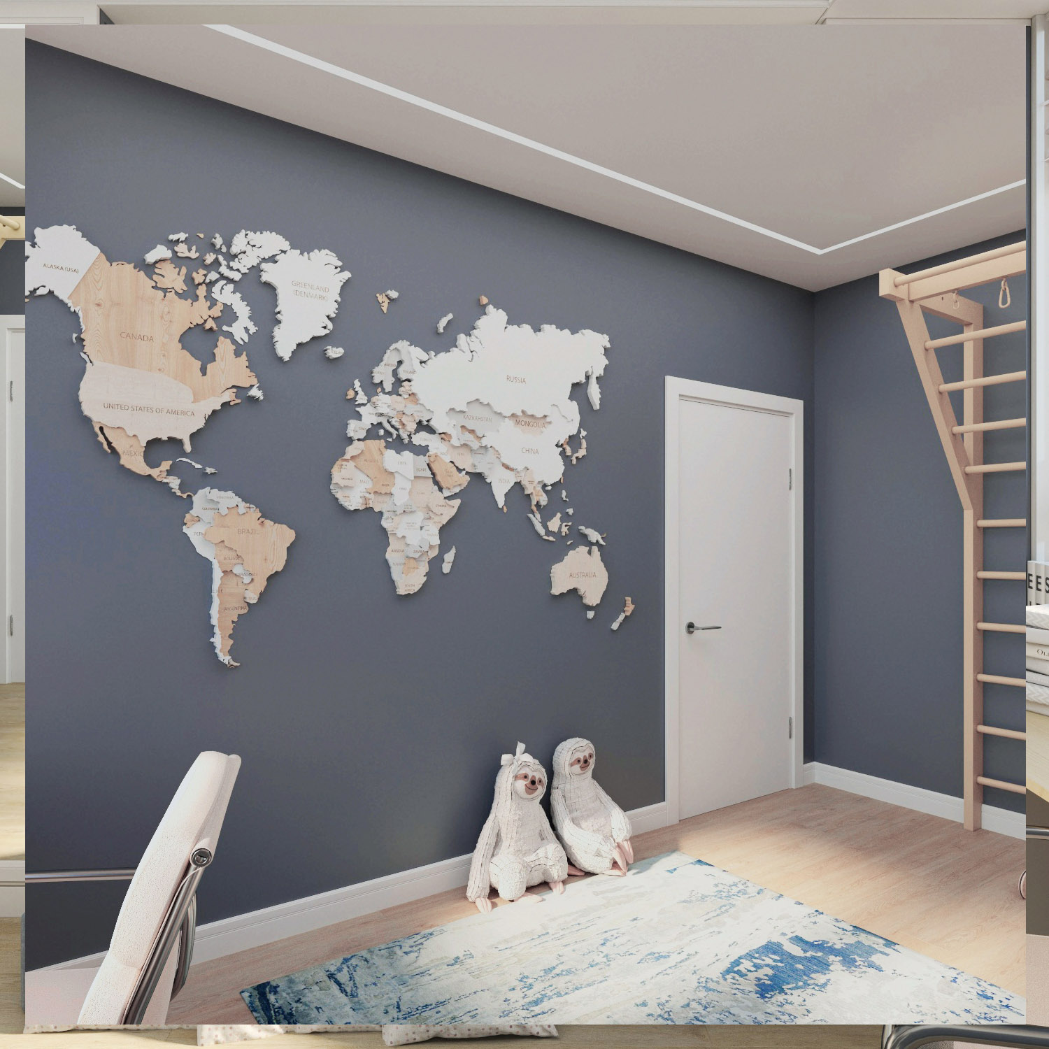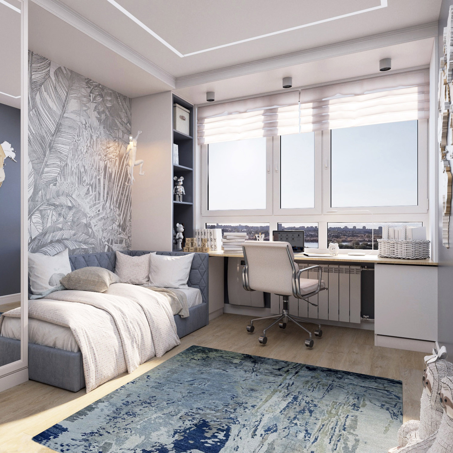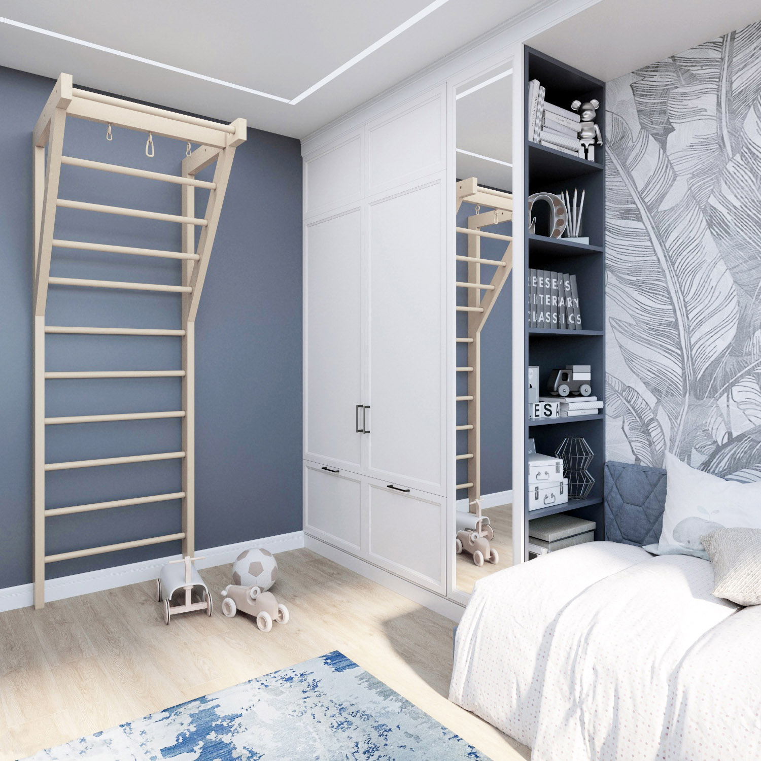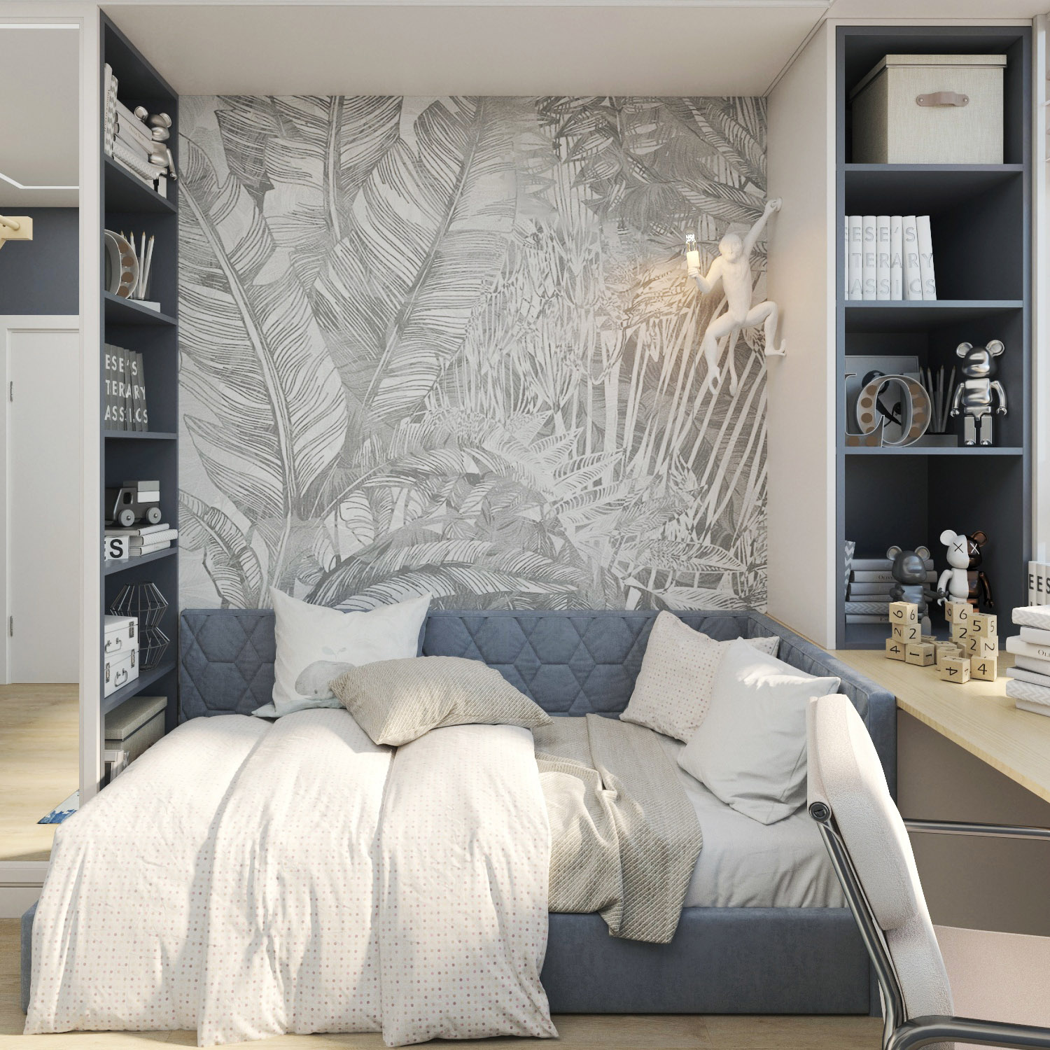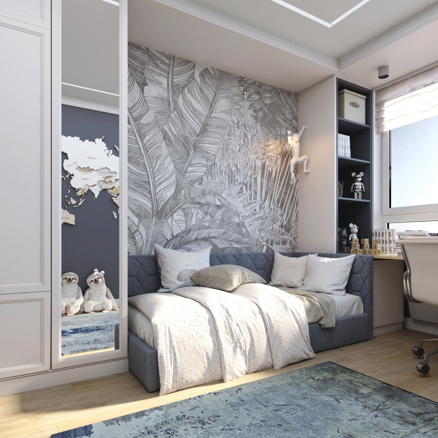 Интерьер детской комнаты для мальчика 5 лет. Площадь помещения — 13,8 м². Обои из коллекции «Zoo» создают атмосферу тропиков, а нейтральный цвет отлично вписывается в общую концепцию комнаты, не перегружая ее.