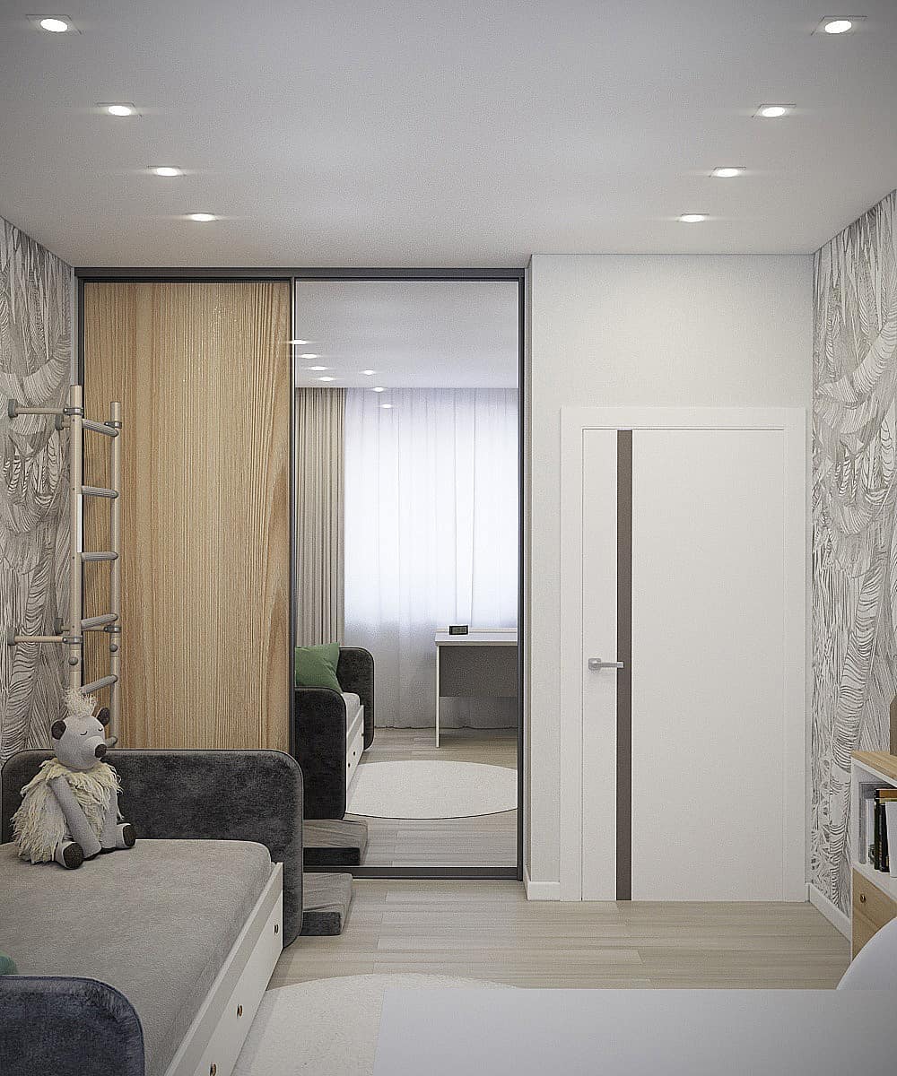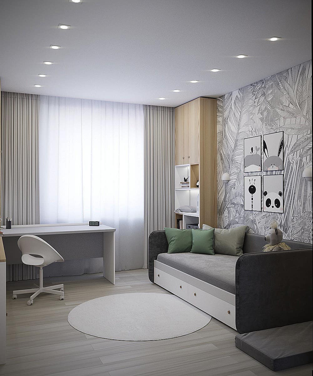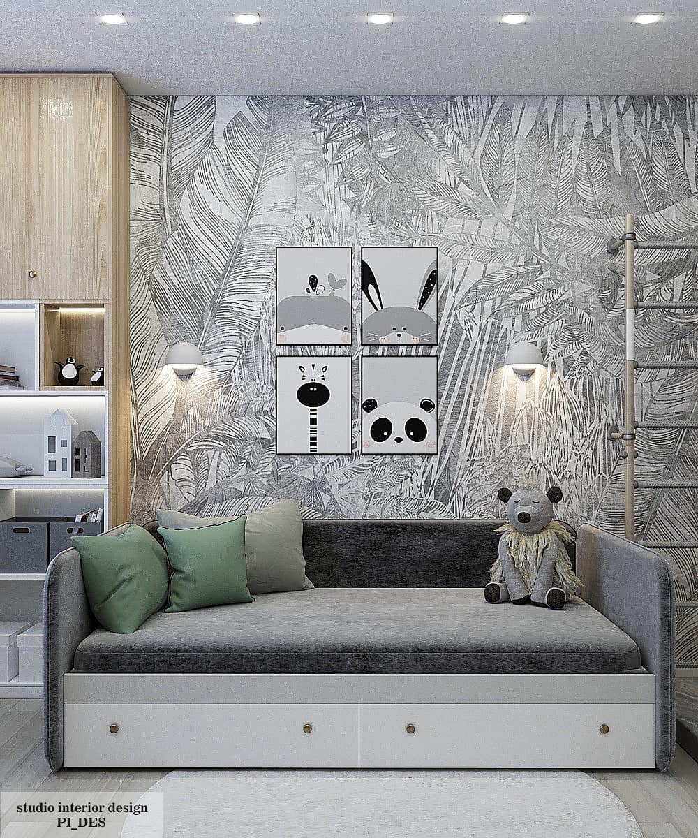 Гостевая комната, которая планируется в будущем стать детской. Обои из коллекции ZOO. Яркие розовые фламинго, семейство леопардов и интересующиеся зебры обязательно понравятся юным искателям приключений и откроют детям новый загадочный мир! Также в коллекции присутствуют более нейтральные принты для детишек постарше.