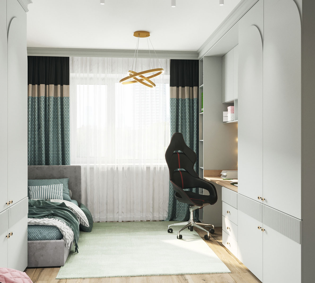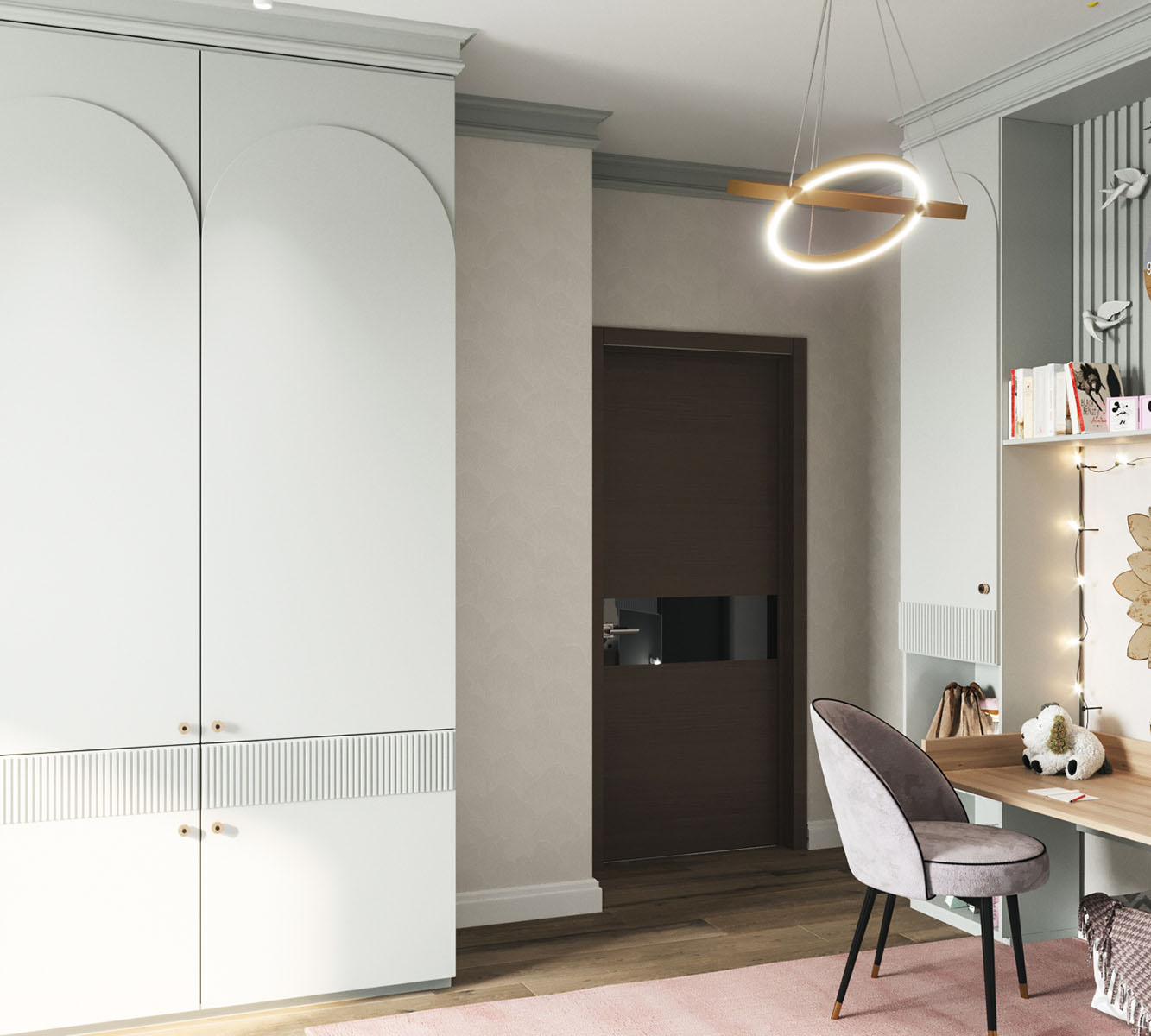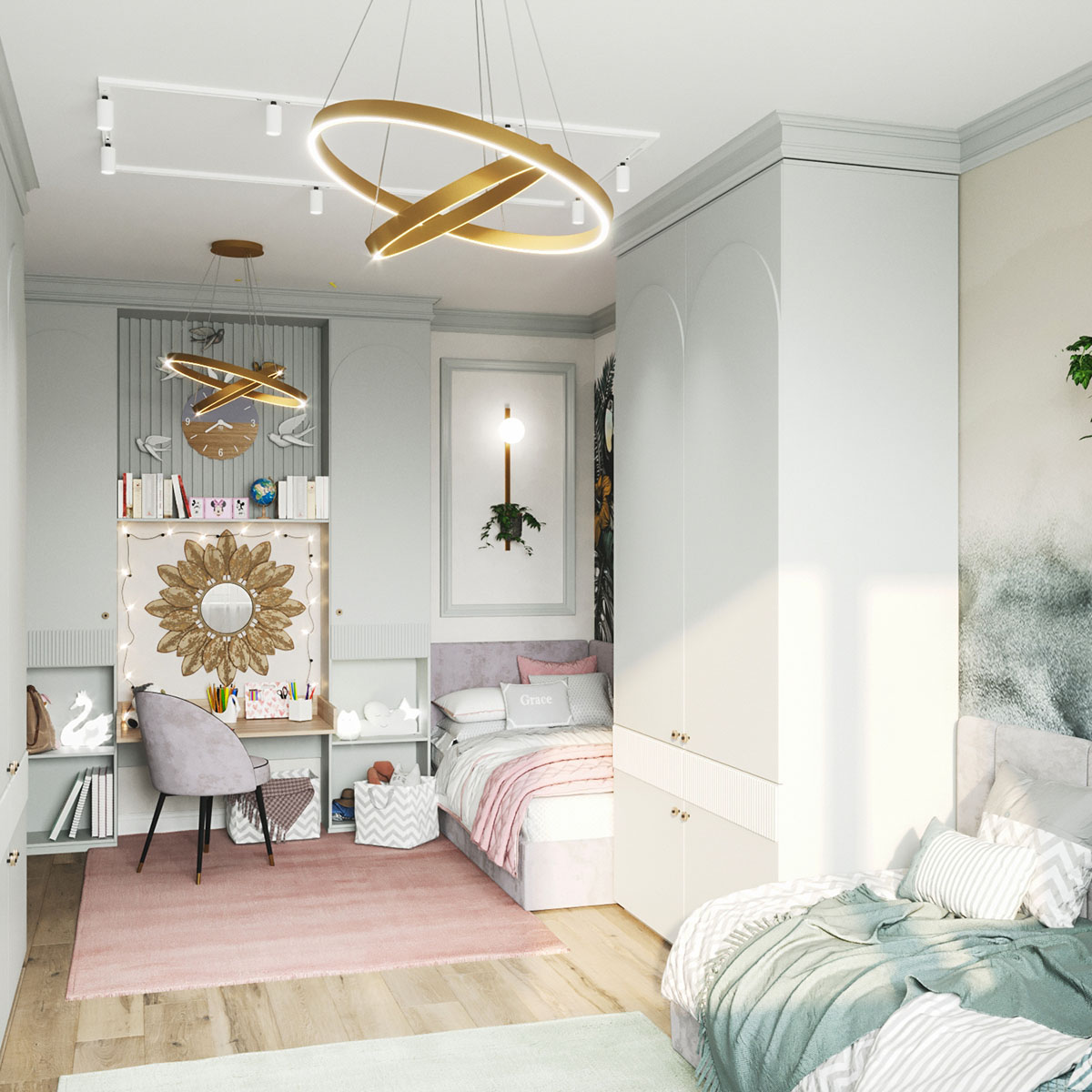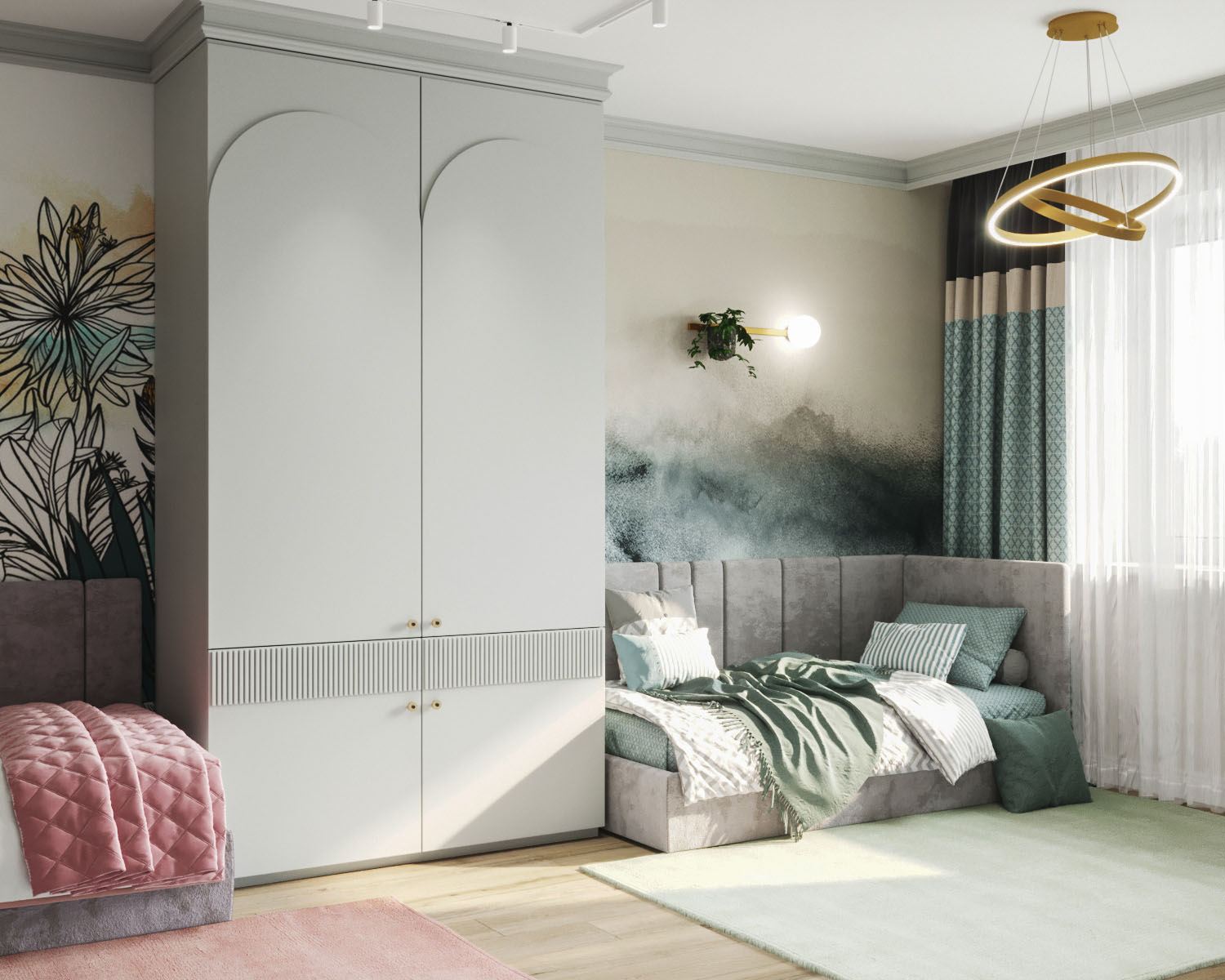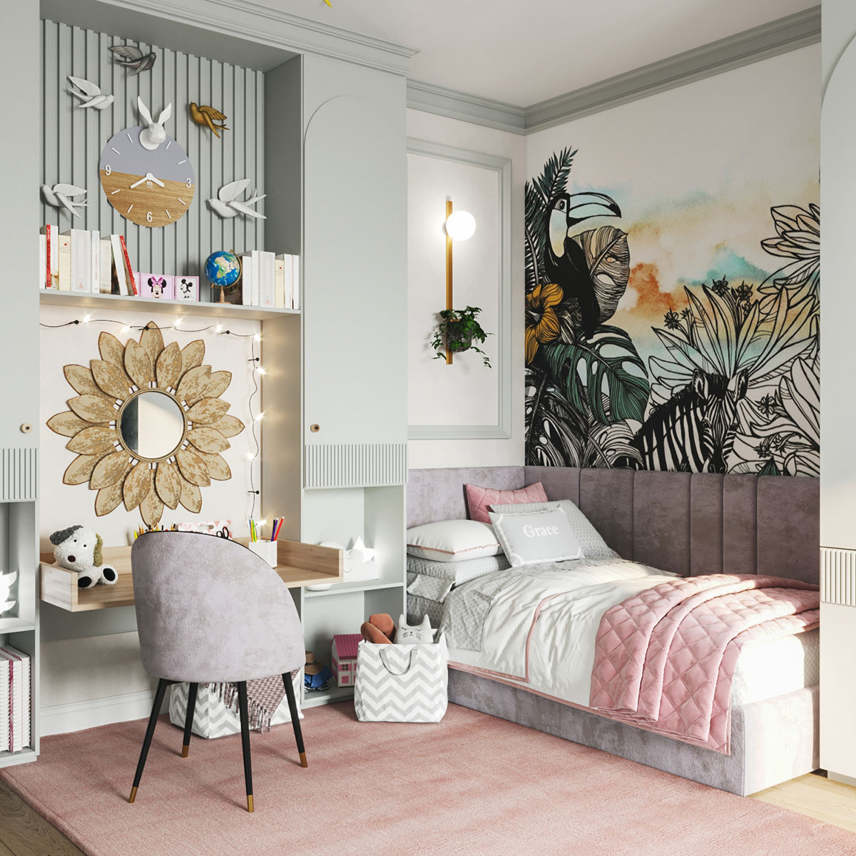 Для этого проекта детской комнаты выбрали две коллекции: ZOO и EUPHORIA. Тропические джунгли, туканы и интересующиеся зебры коллекции ZOO обязательно понравятся юным искателям приключений и откроют детям новый загадочный мир! А обои EUPHORIA добавят интерьеру акварельной лёгкости и абстрактной неопределенности.