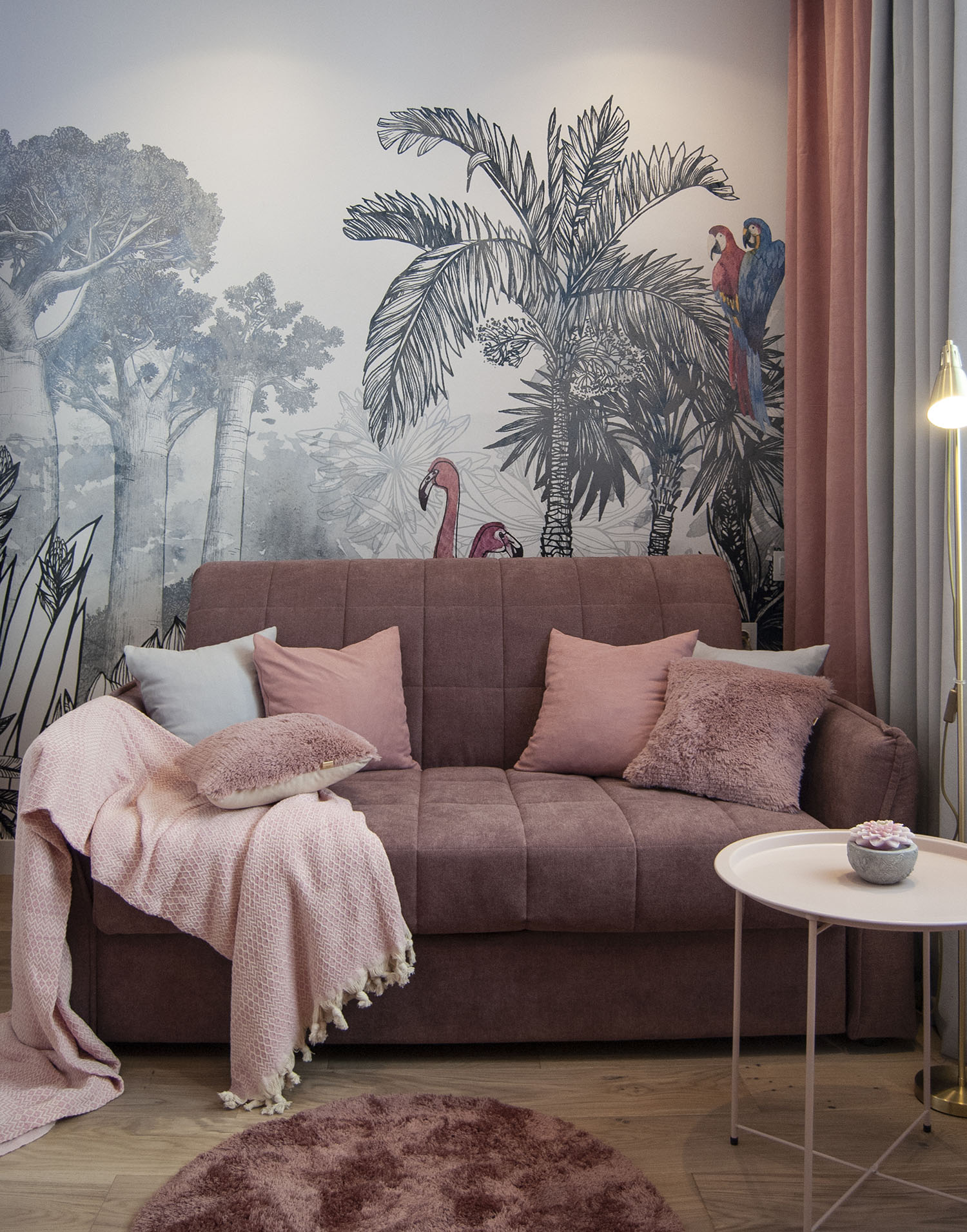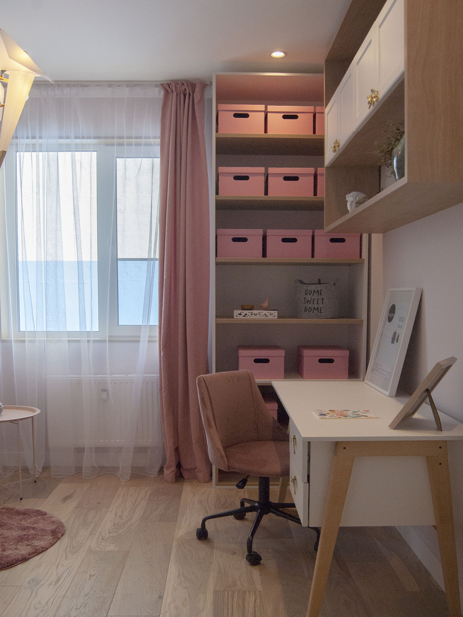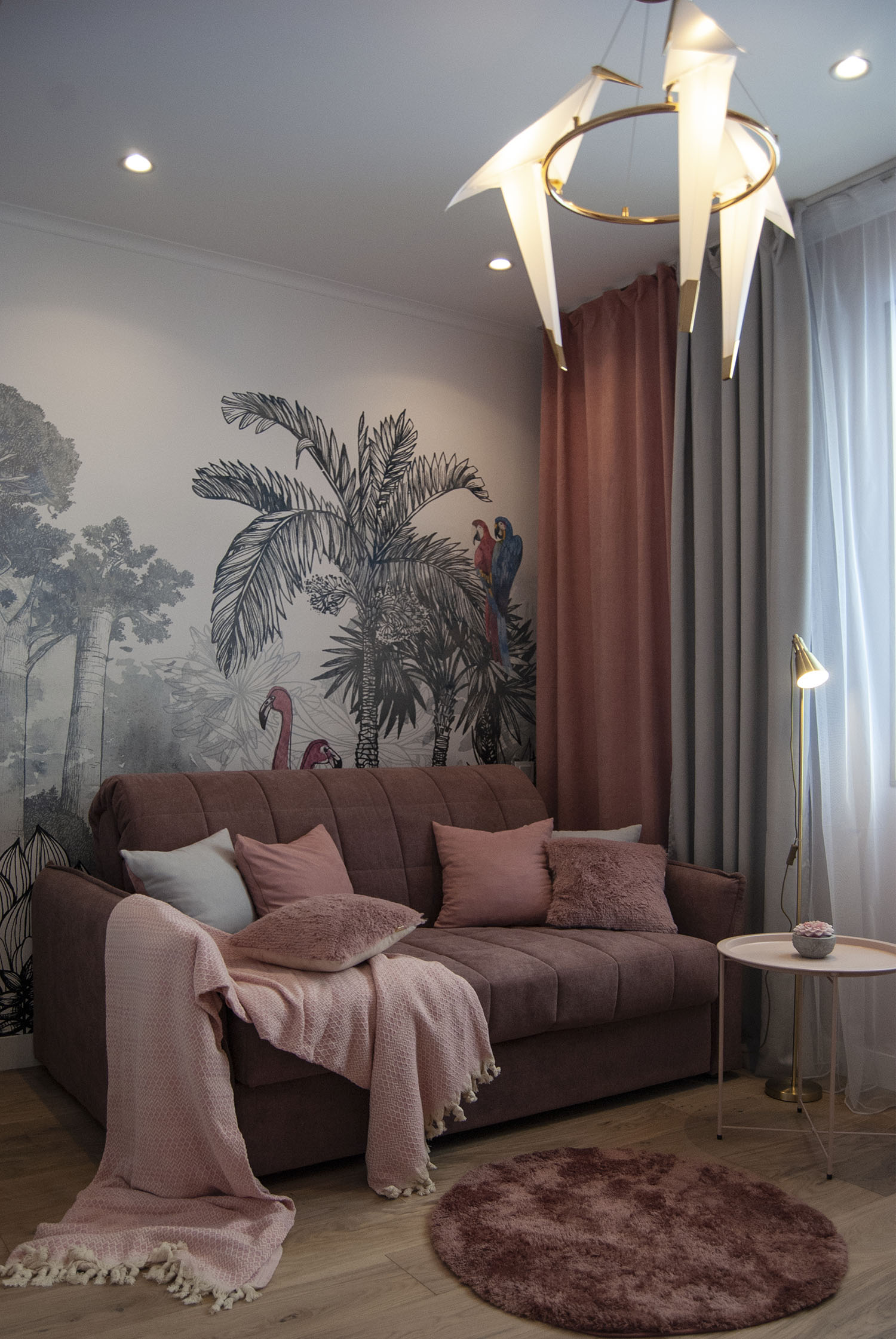 Детская комната с одним окном, выходящим в стену соседнего дома, поэтому пространство нужно было сделать светлым, тёплым и уютным. Основной цвет — пыльно-розовый в сочетании с белым, текстурой дерева и милыми деталями. Обои с тропическим рисунком навевают приятное настроение лета в любое время года. Ручки на мебели в виде цветов и стрекоз поддерживают тематику обоев. А светильник в виде птиц прекрасно дополнил дизайн комнаты и наполнил её тёплым мягким светом.