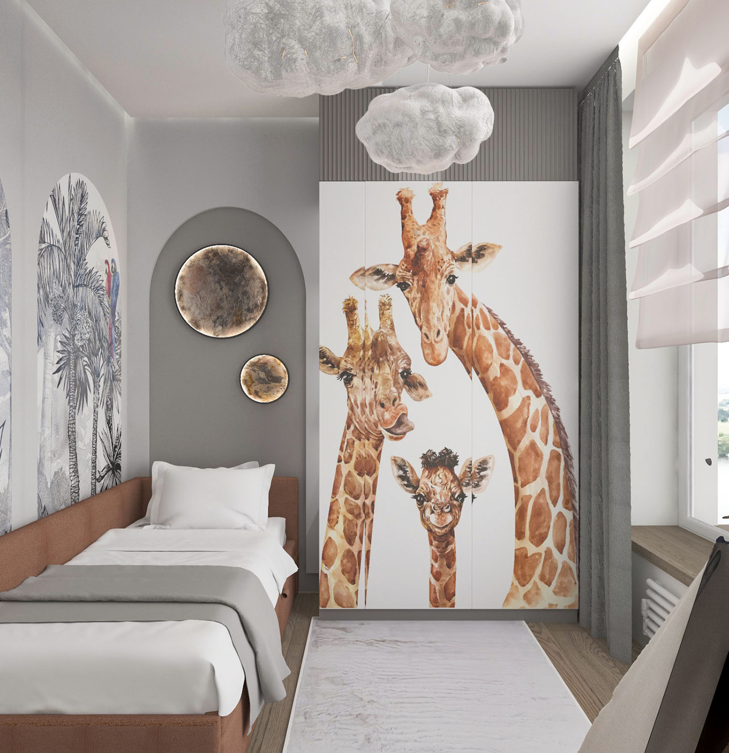 Детская комната для мальчика площадью 11 м² в ЖК River Park Коломенское. Задача стояла — с помощью обоев расширить помещение и сделать комнату интересной для ребенка 4 лет.