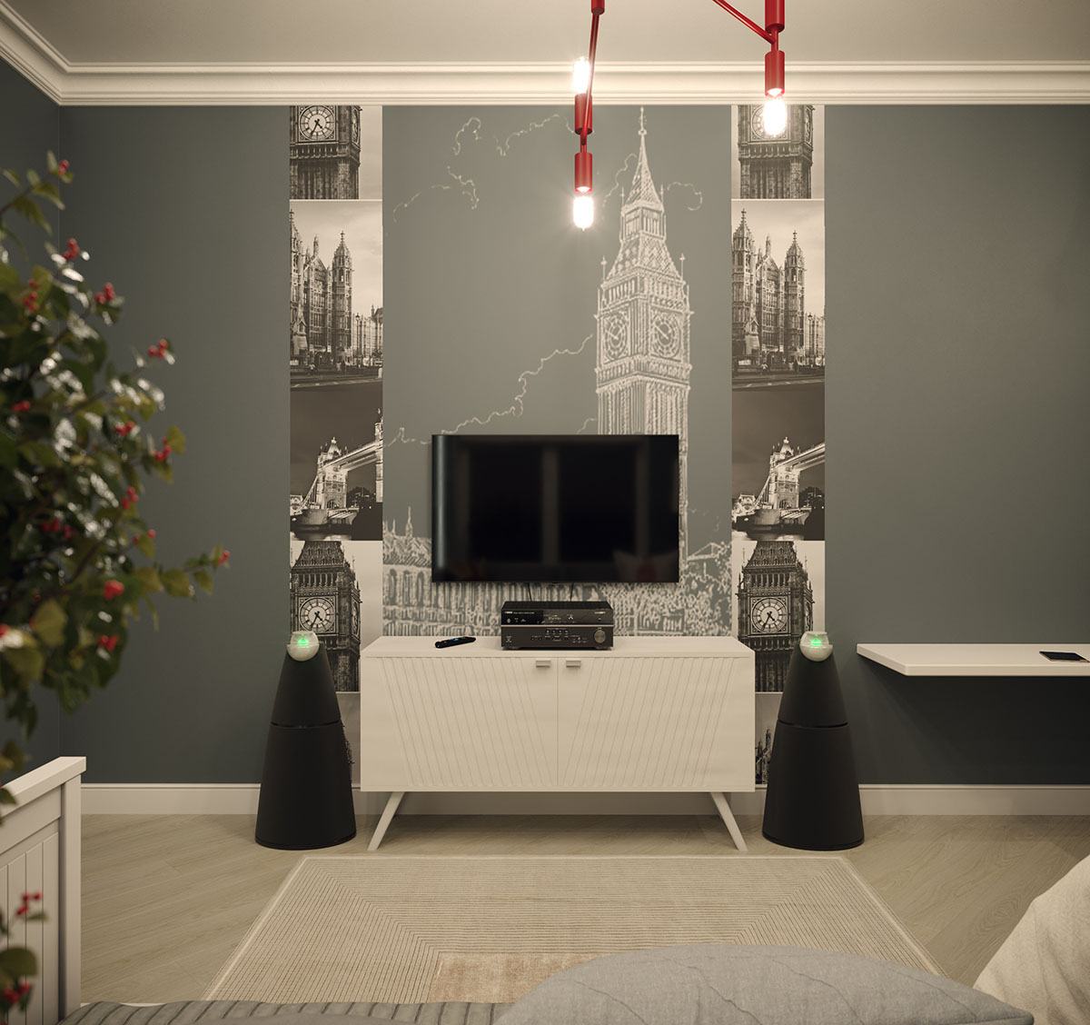 Проект взрослой детской в стиле «Лондон» для мальчика-подростка. Юноша занимается изучением нескольких иностранных языков и, возможно, в будущем станет дипломатом. Дизайнеру очень хотелось каким-то образом отразить его увлечения в интерьере, и поэтому возникли мысли добавить фреску в стиле «Лондон».