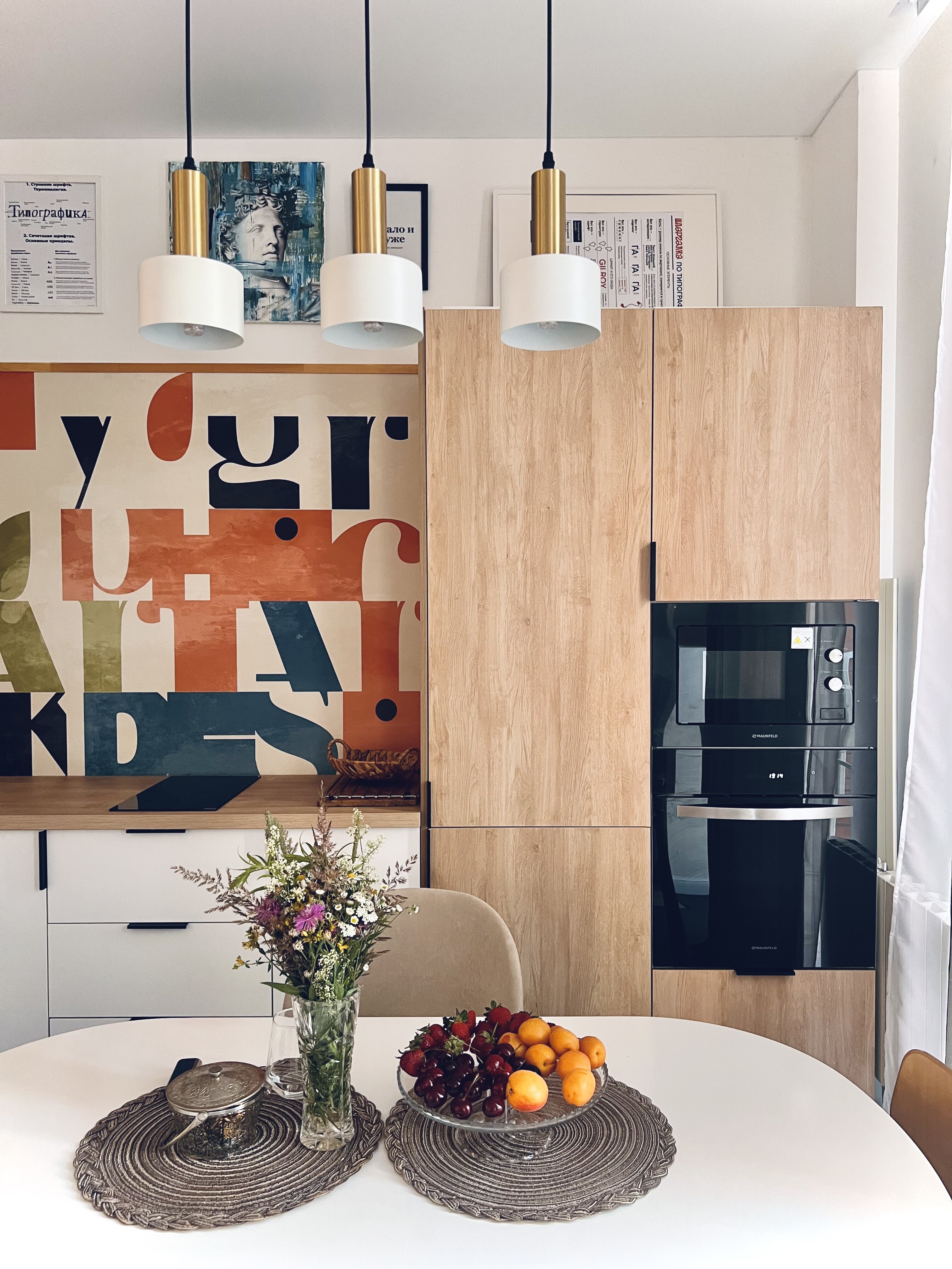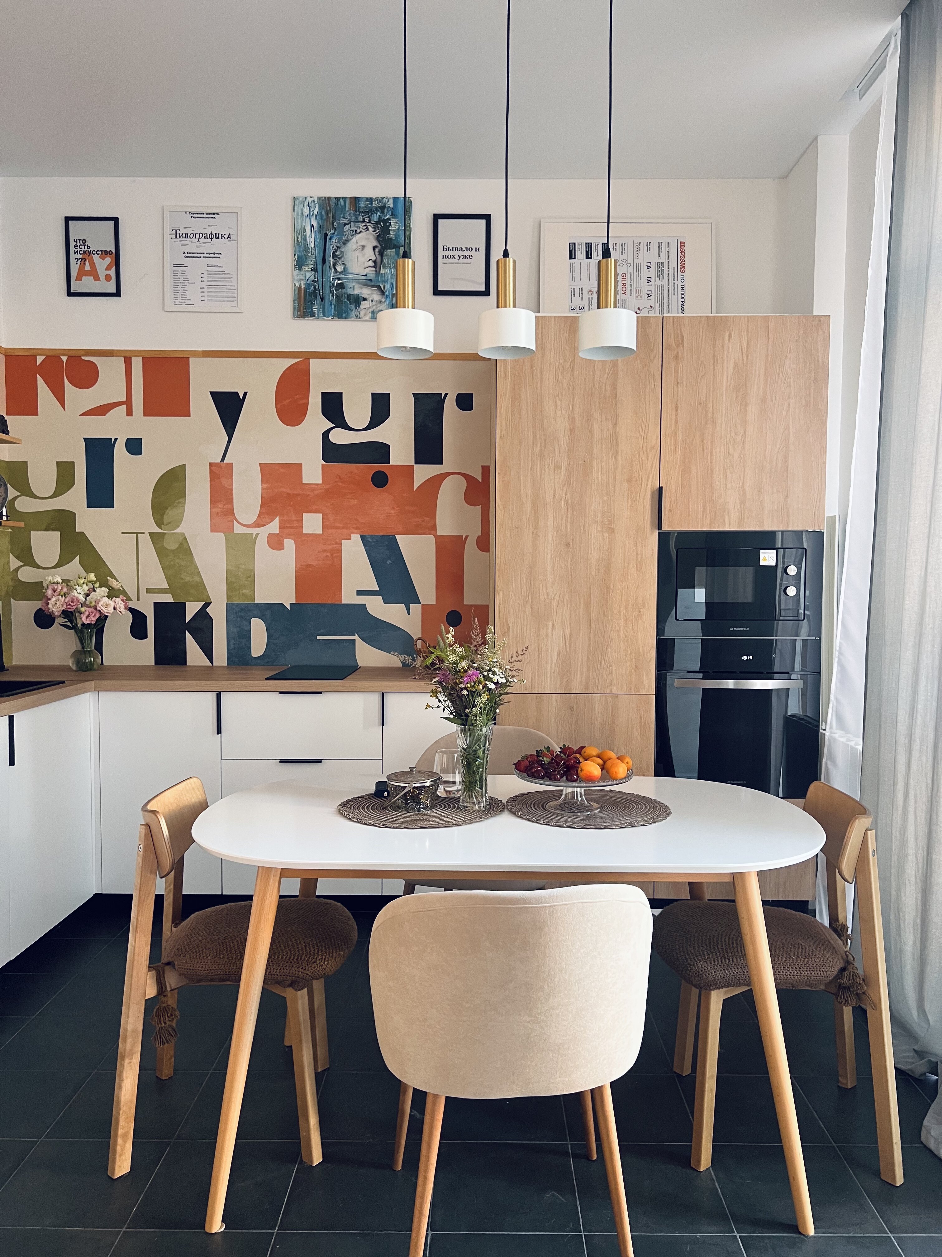 Обои для кухни Екатерина отрисовала сама. Она хотела, чтобы рисунок имитировал плитку и отражал её увлечение типографикой. Так появился сюжет из разноцветных букв и кубиков. Материал SICILY с защитным покрытием отлично подошел для рабочей зоны на кухне.
