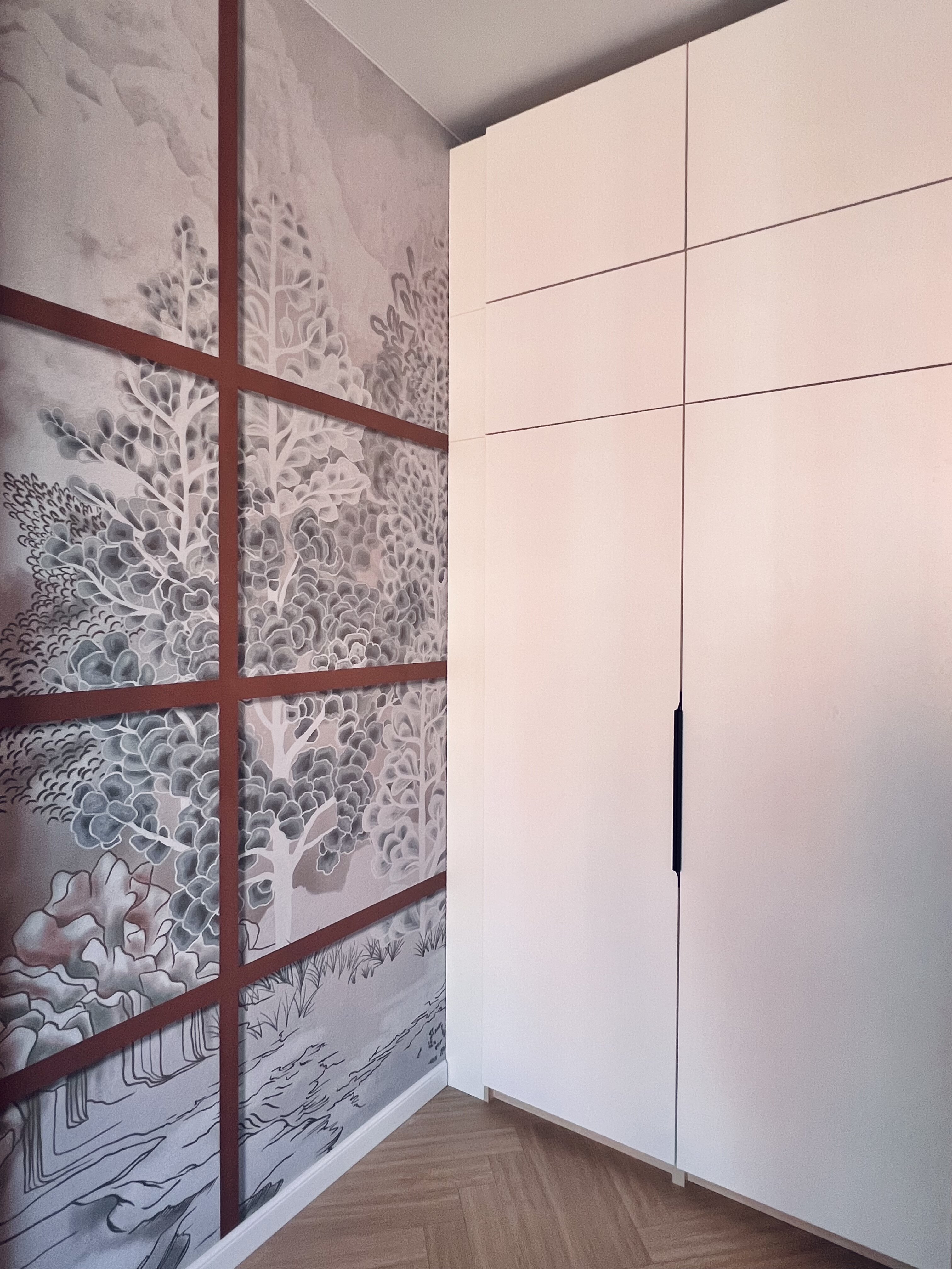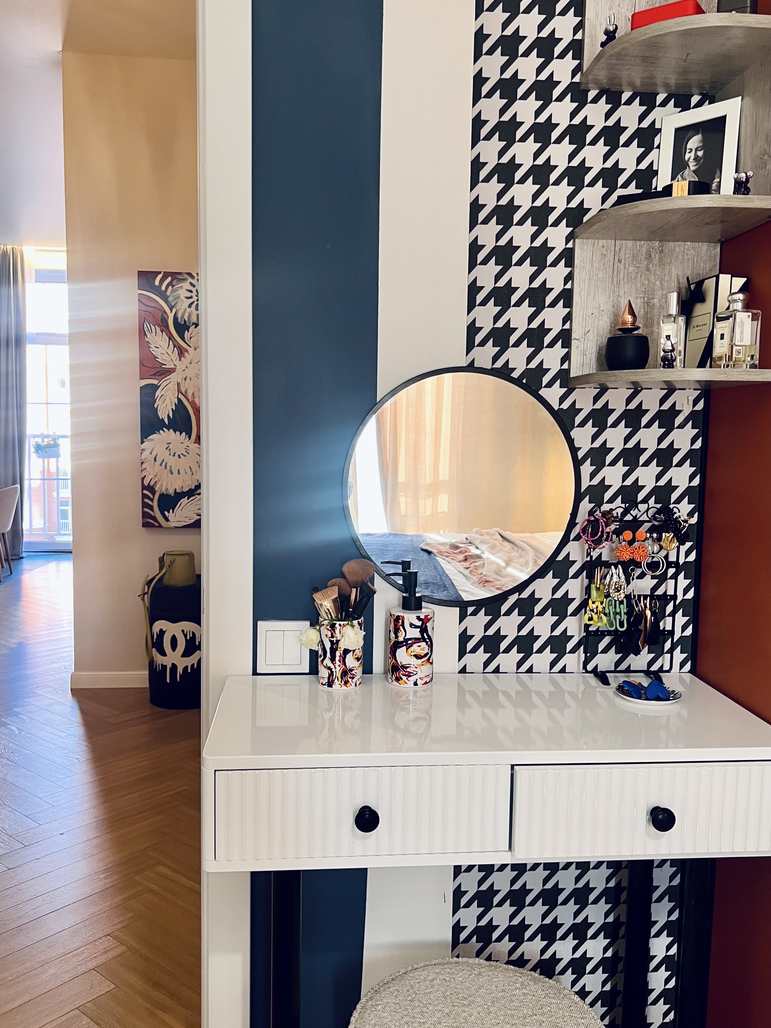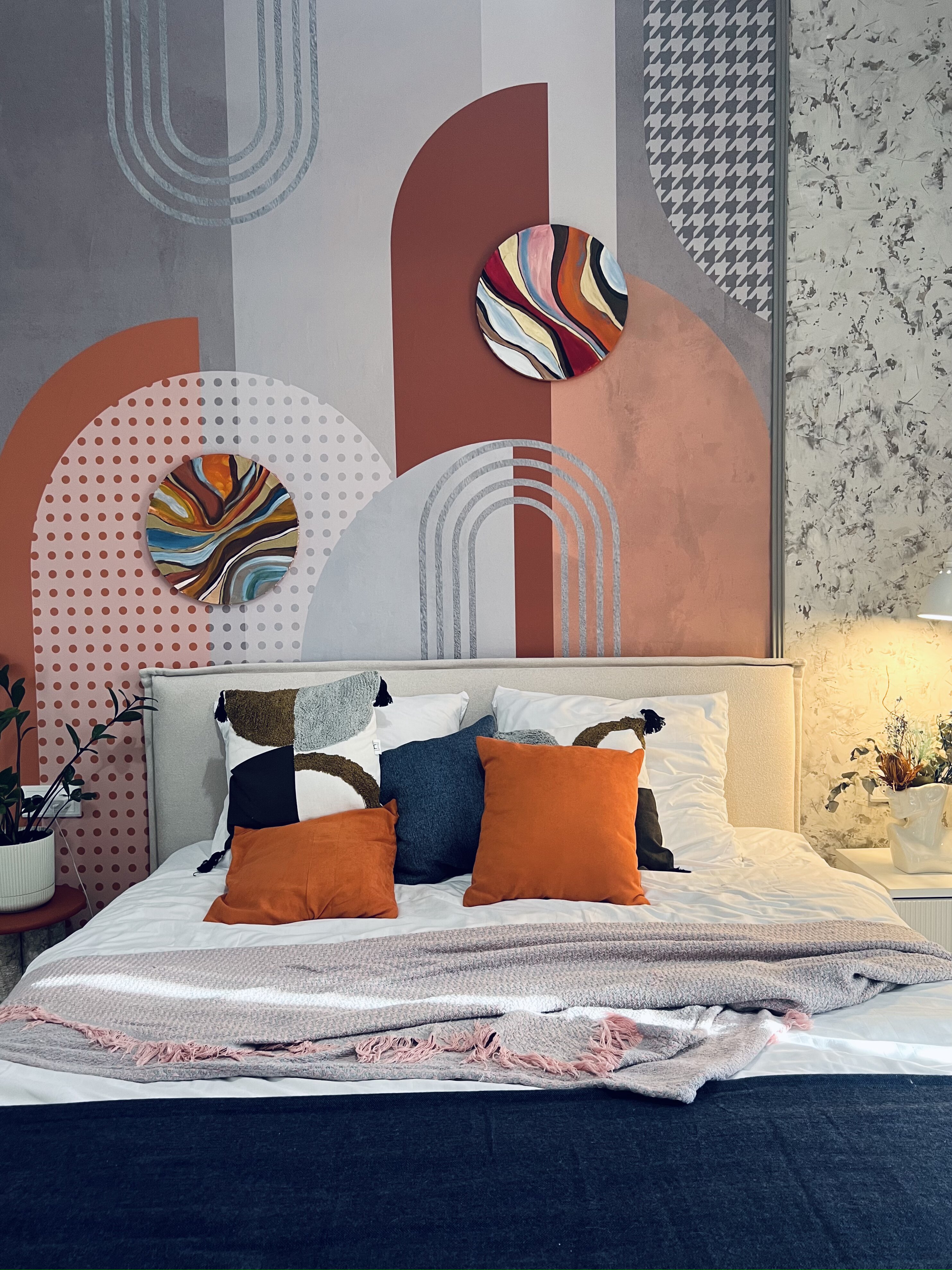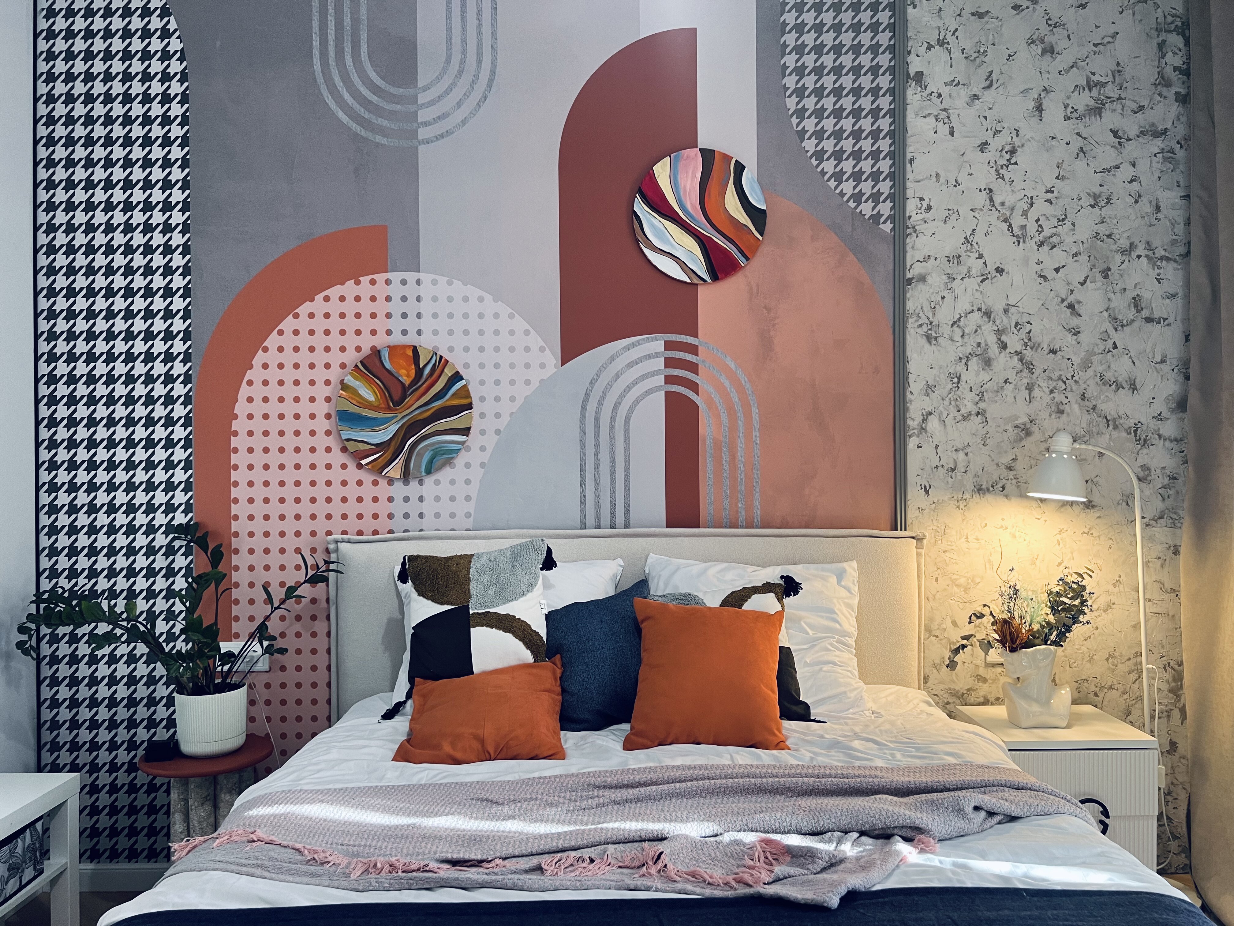 Спальня — это яркая и геометричная комната. Екатерина доработала изображение из коллекции DECO и использовала геометрические фигуры с оттенками, которые встречаются в её интерьере. Также она добавила принт «гусиная лапка», чтобы сделать комнату особенной.