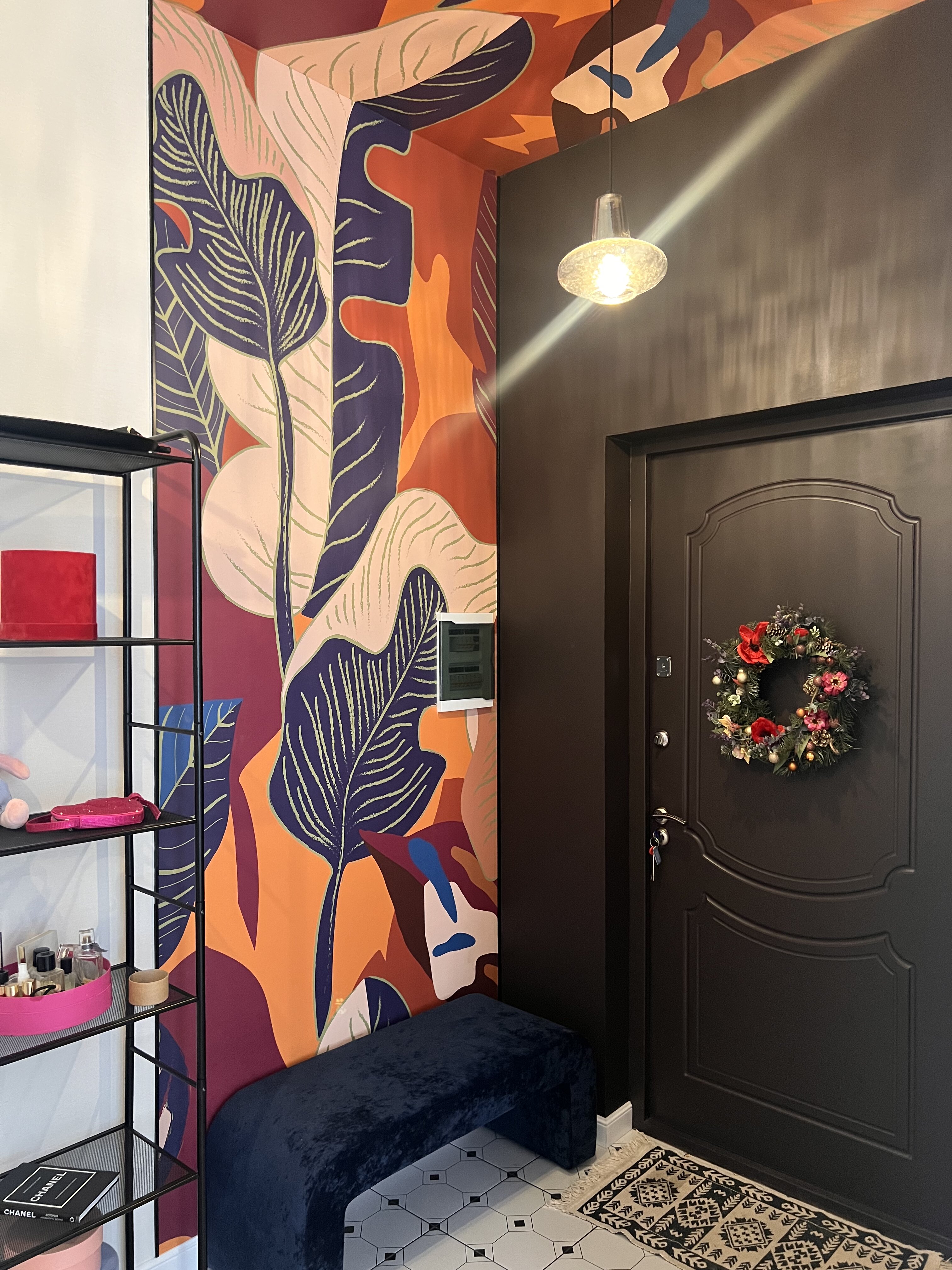В прихожей Екатерина использовала яркие обои из коллекции SUMMER, чтобы сразу удивить и впечатлить гостей. Одна стена и потолок оклеены акцентными обоями, а стена напротив выкрашена в яркий цвет фуксия.