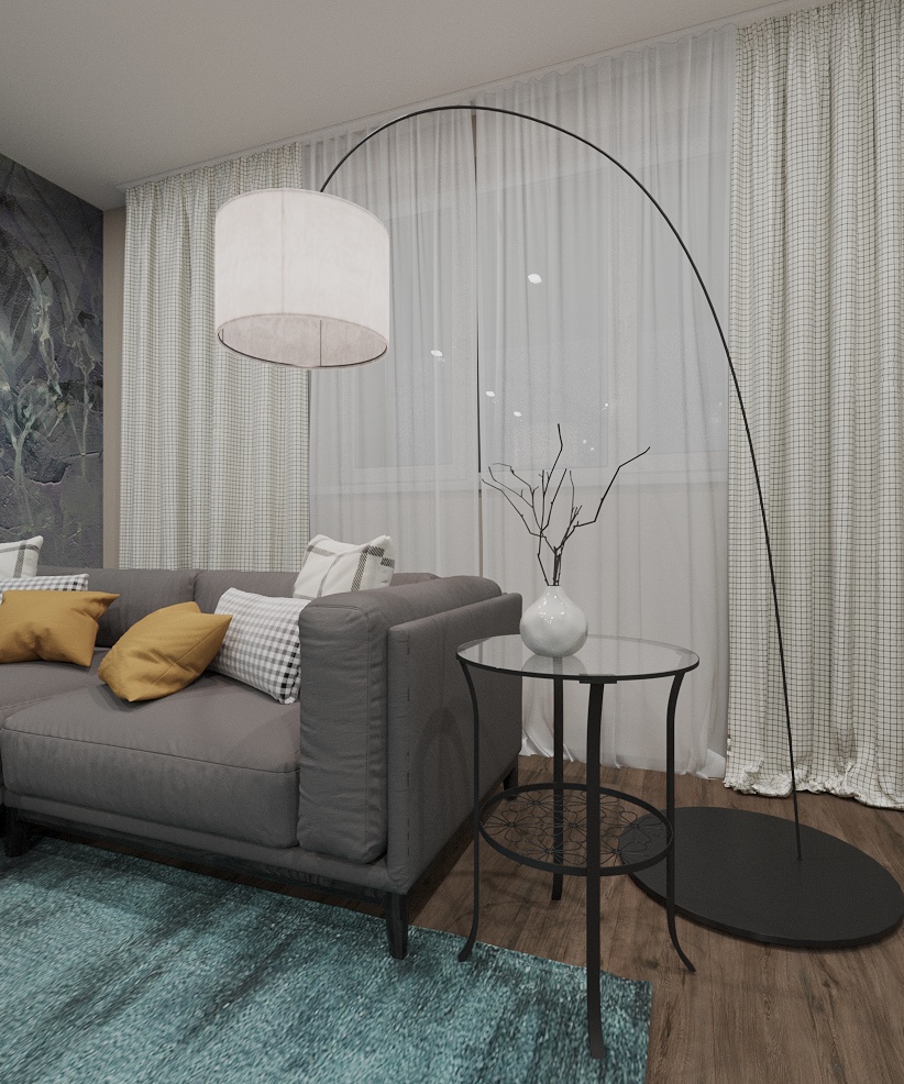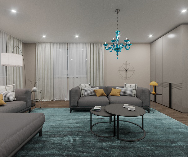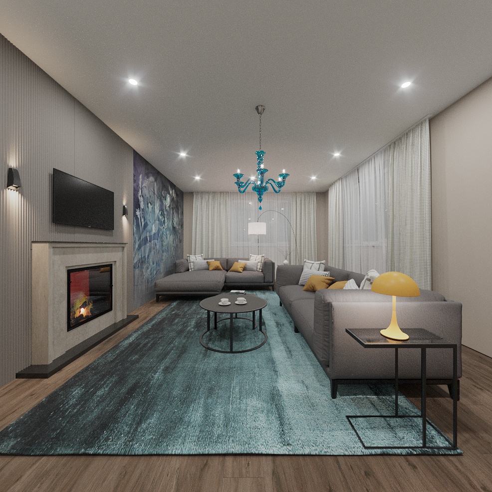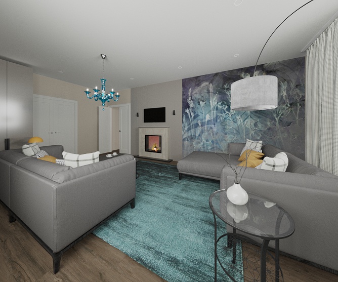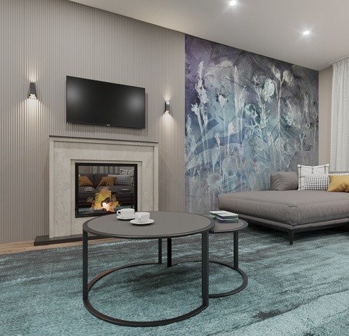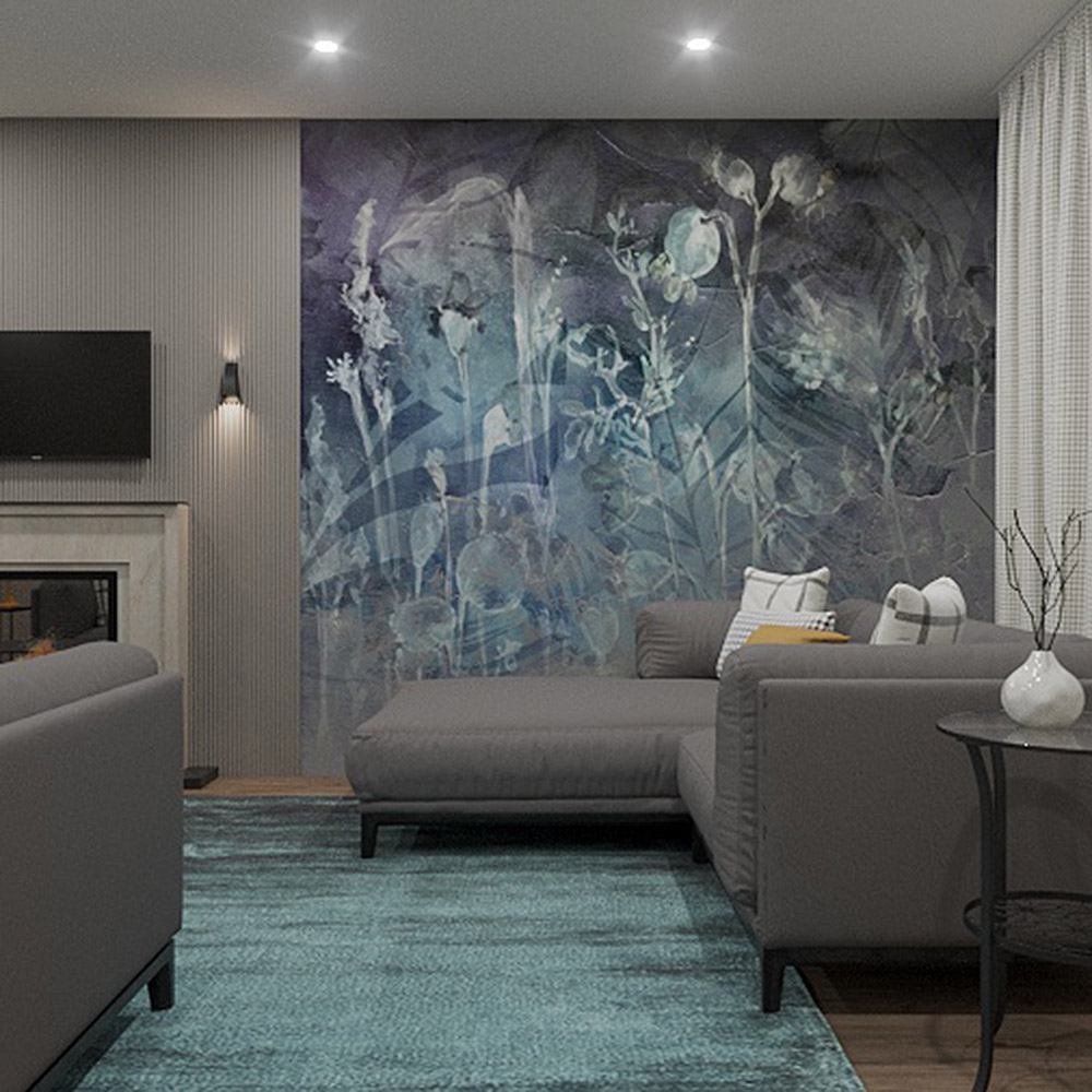Это проект гостиной в жилом доме для семейной пары и их 14-летней дочери. Площадь гостиной 29 м². Главной задачей было создать просторную лаундж зону с удобными диванами для уютных посиделок возле камина. Камин двухсторонний со сквозной топкой, вторая его часть обращена в холл. В проекте использовались обои из коллекции «Aquarelle».