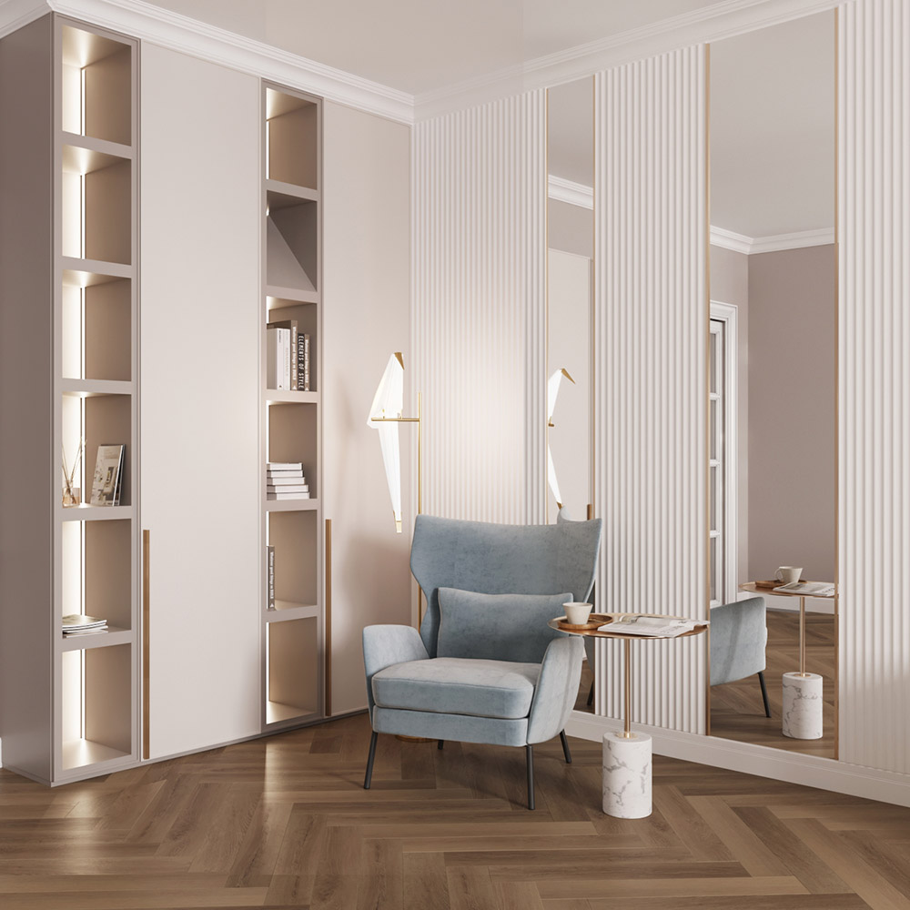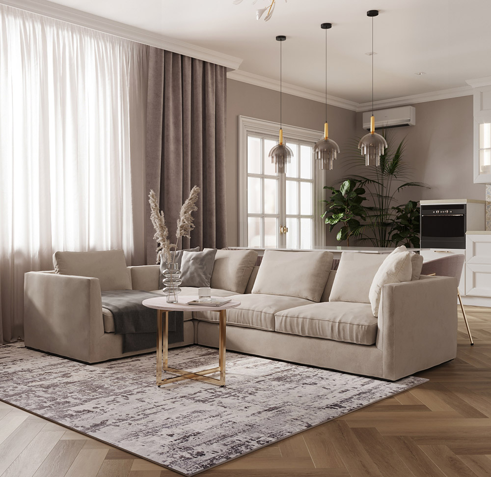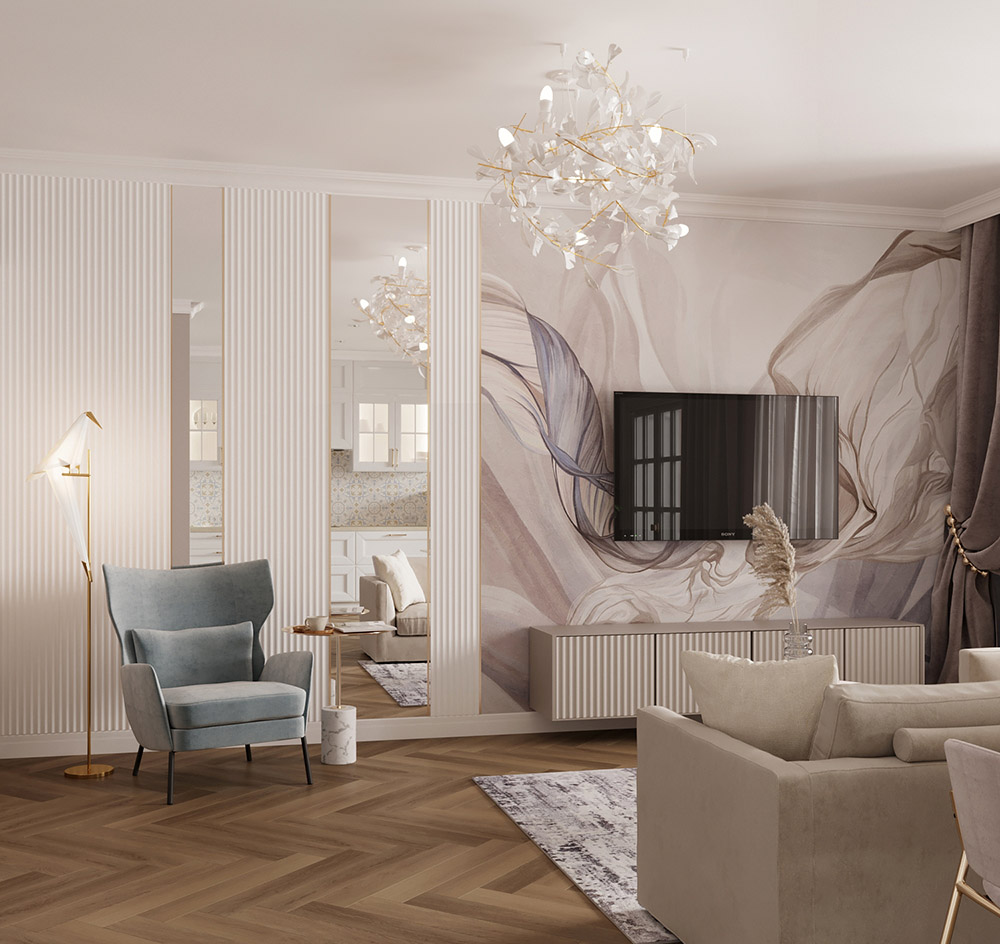 Гостиная, совмещенная с кухней, из проекта квартиры в г. Москва. Квартира для мамы заказчика. Площадь помещения — 38 м². Главным пожеланием был нескучный однотонный интерьер. Обои из коллекции «Breeze» добавили комнате легкости и воздушности.