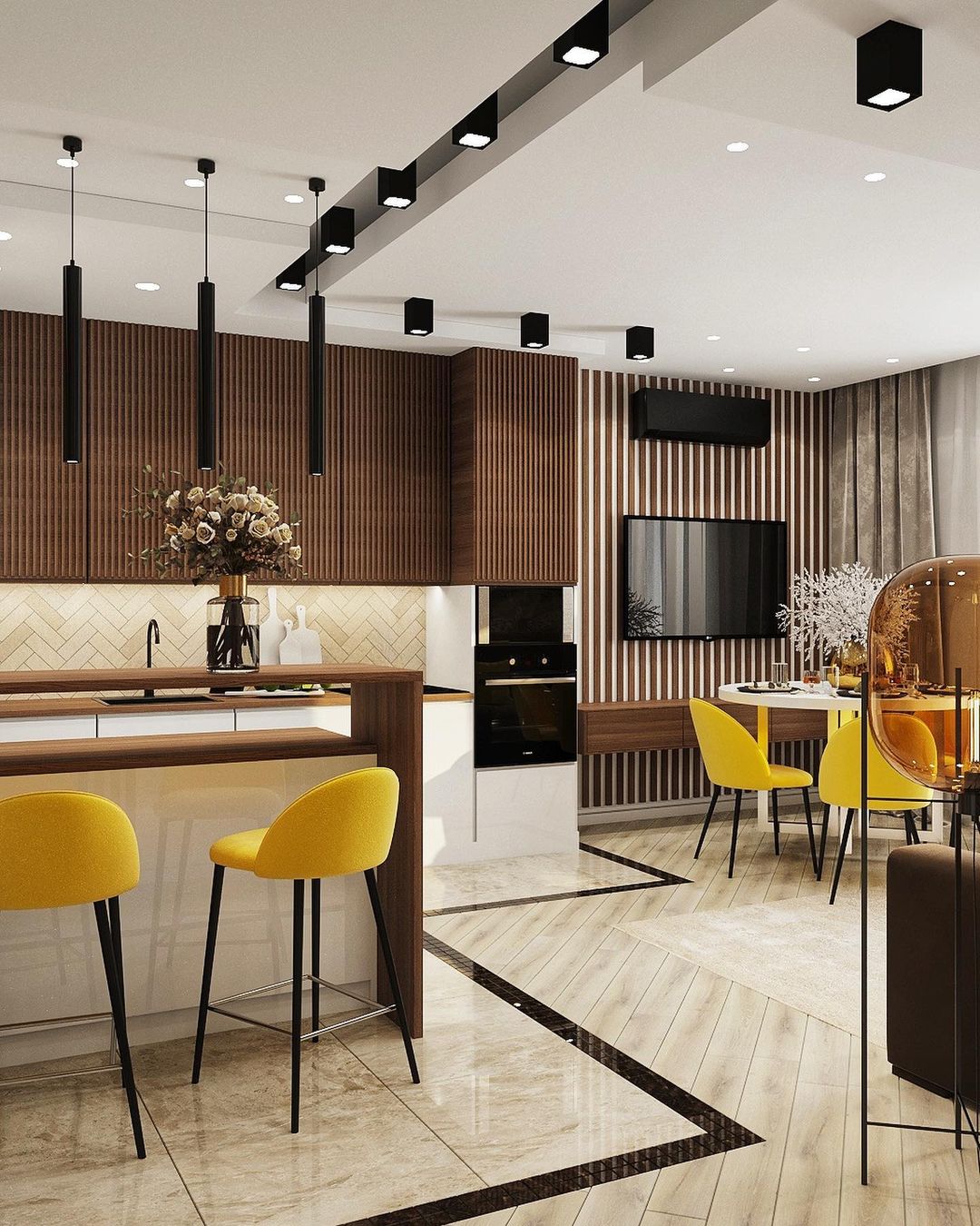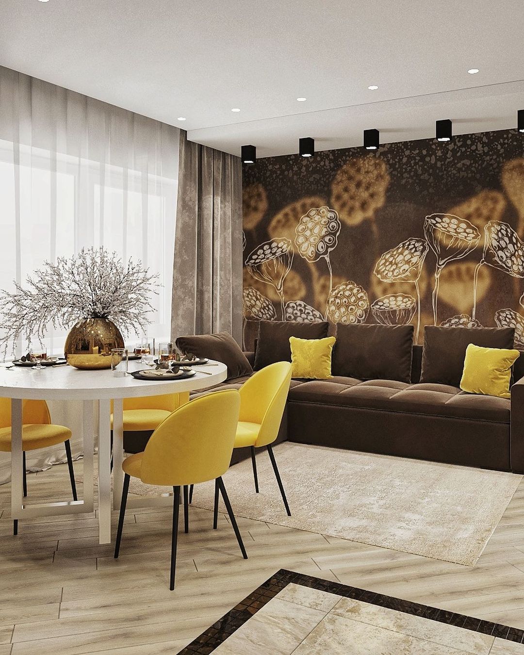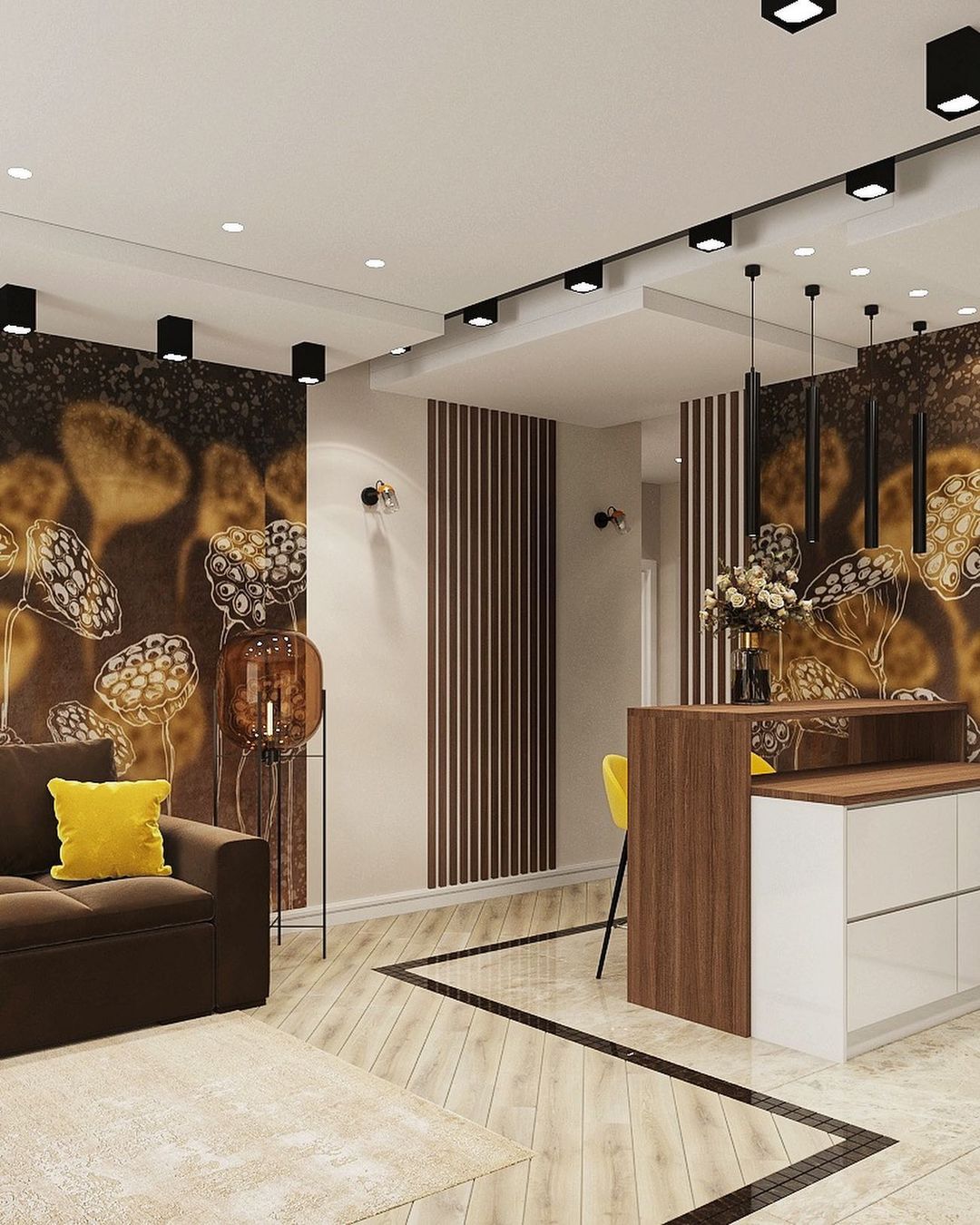 Основной задачей было объединить зону кухни и гостиной. Интерьер должен быть в тёплых тонах, но обязательно иметь индивидуальность, быть ярким и запоминающимся. В проект были выбраны обои из коллекции «Essence». И, кстати, это пространство изначально задумывалось с перспективой расширения семьи.