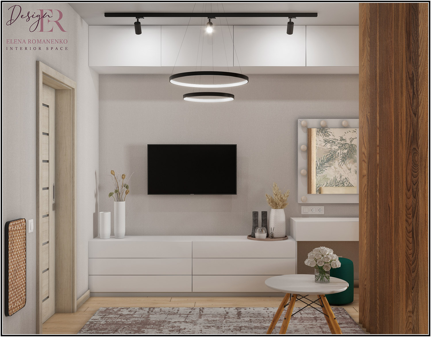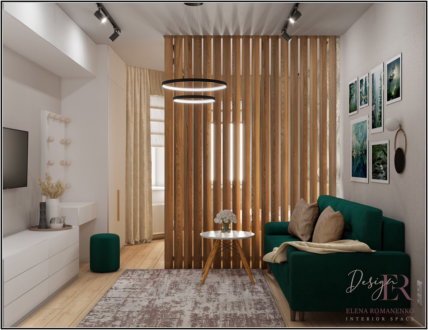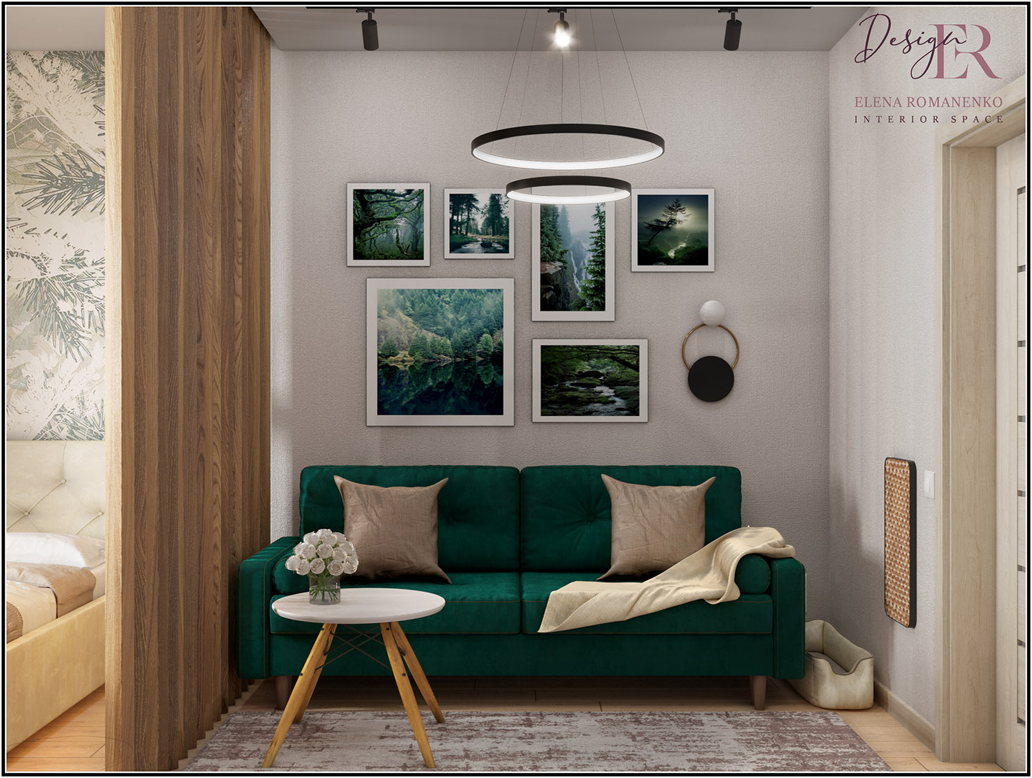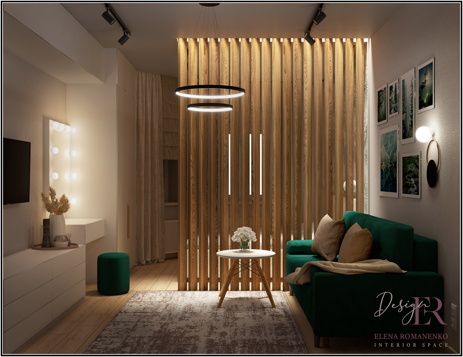 Это проект гостиной в городе Надым — маленьком северном городке, расположенном на полуострове Ямал. Запрос молодой пары был на гостиную площадью около 20 м² с зоной спальни, отделённой чем-то немонолитным, пропускающим воздух и свет.