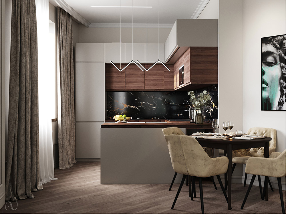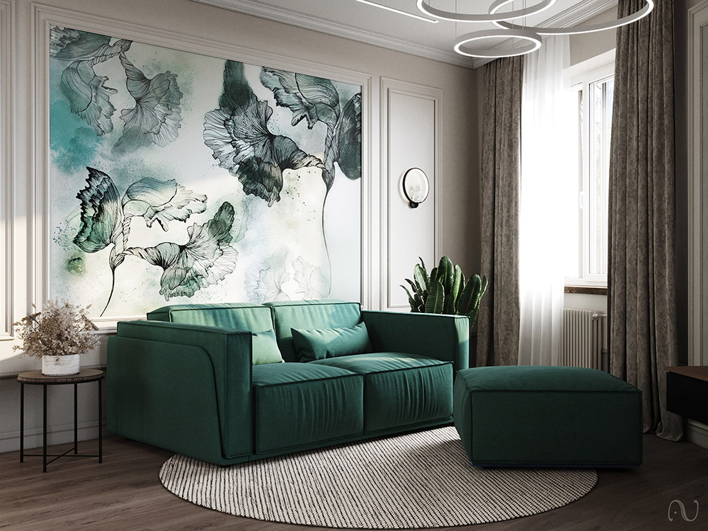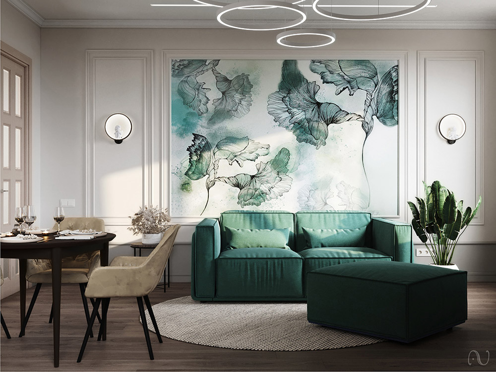 Дизайн кухни-гостиной площадью 26 м² разрабатывался для молодой семьи из Санкт-Петербурга. Пожеланием заказчика было использовать элементы неоклассики, нейтральные цвета, а в качестве акцентного цвета был выбран изумрудный. Получился контрастный интерьер, а яркое панно «La Prima» придало помещению романтический образ.