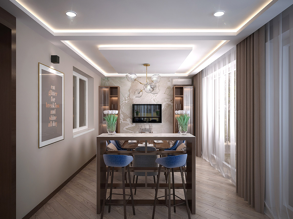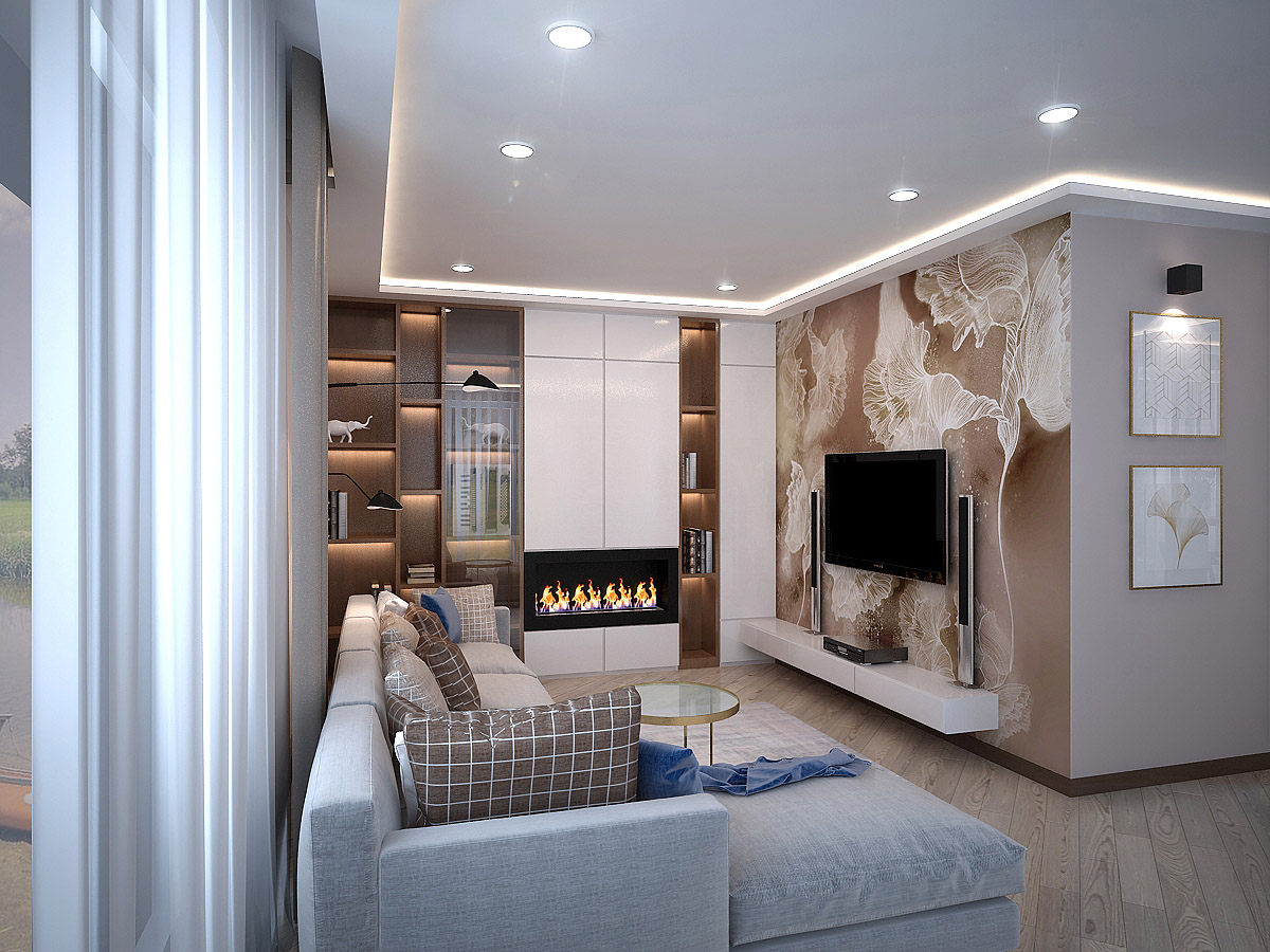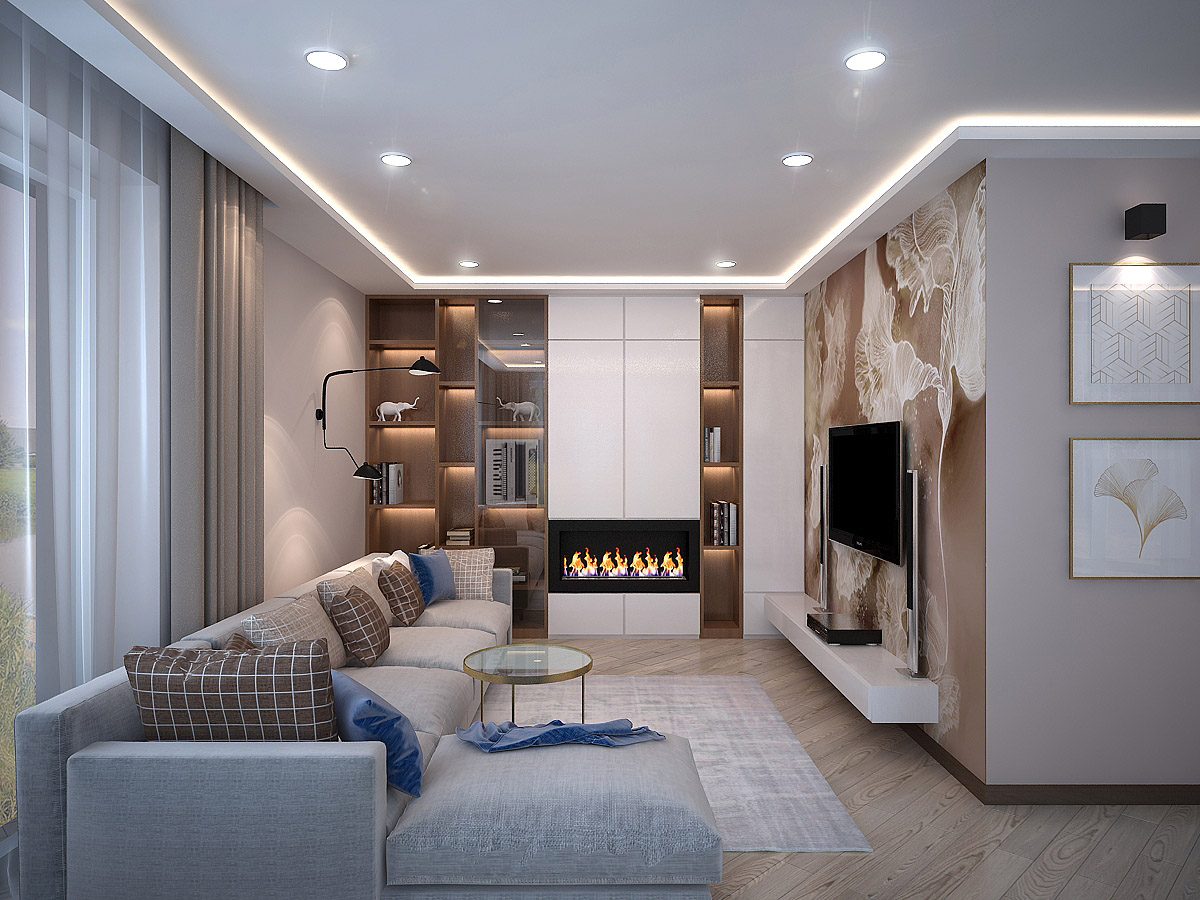 «В этом проекте 2 главные стены оформлены фотообоями из одной коллекции — «La Prima». Уюта добавляют электрокамин и полки с подсветкой. У этого интерьера какая-то особенная энергетика, он прямо-таки заряжен на приятные вечера в кругу семьи», — пишет нам дизайнер этого проекта Елена.