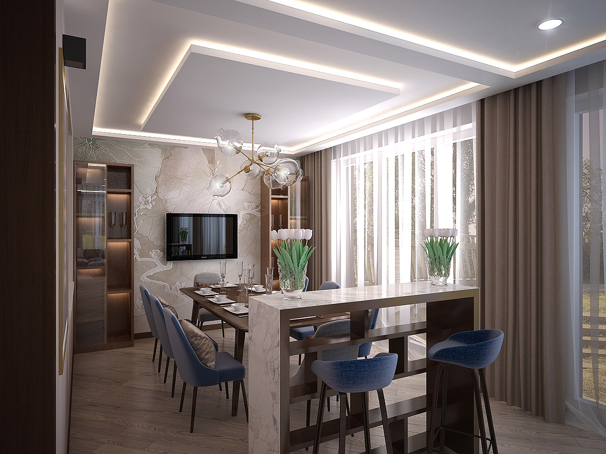 Зона гостиной и столовой в загородном доме