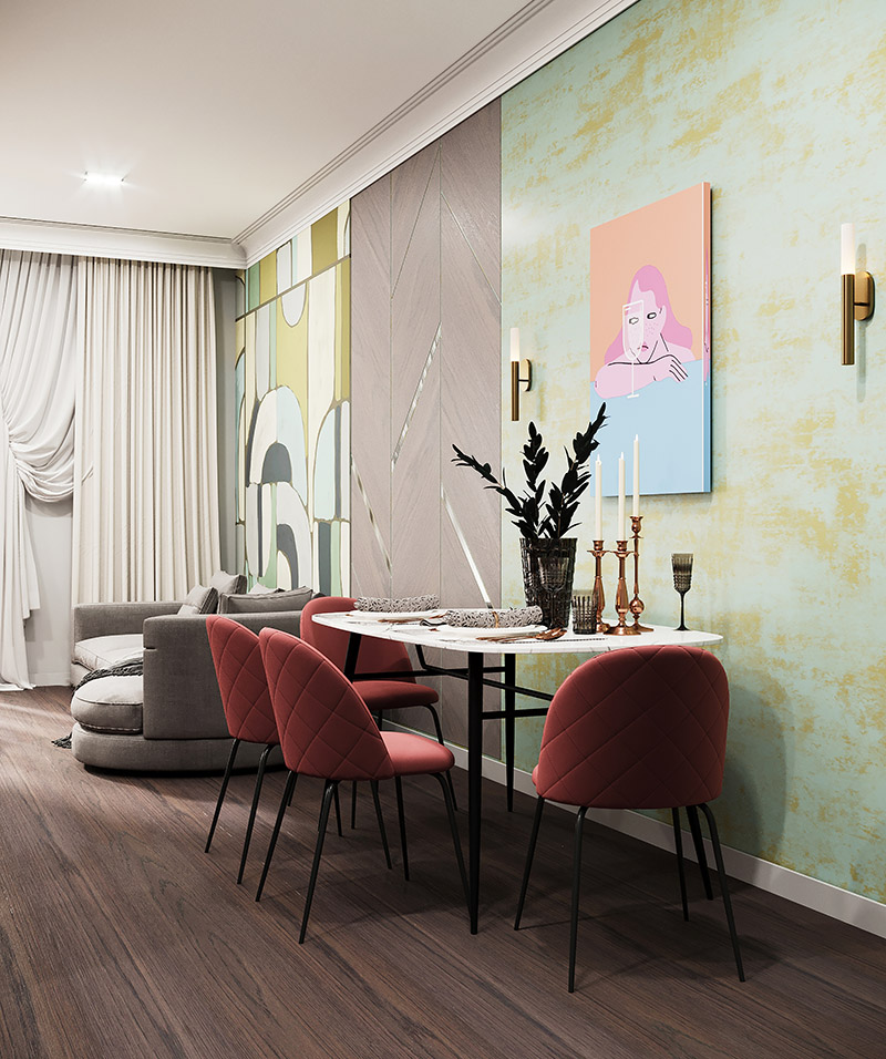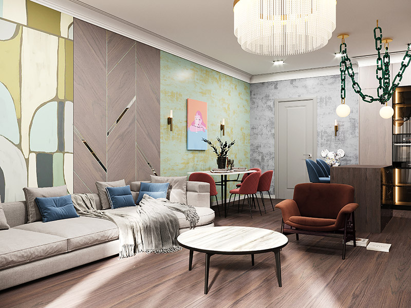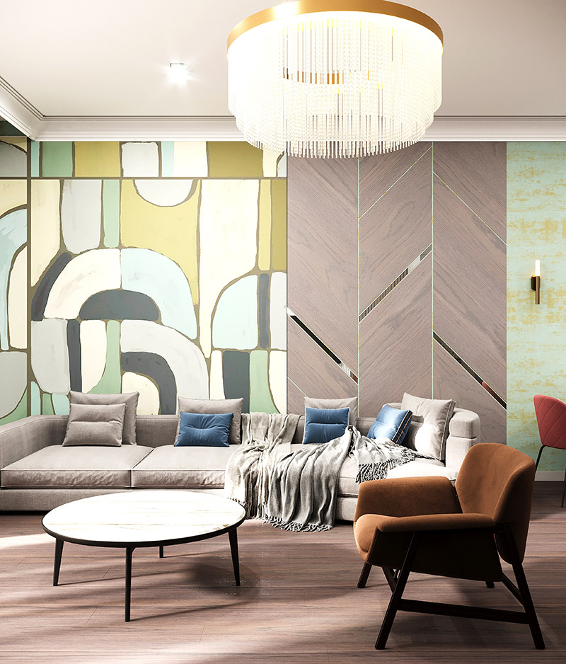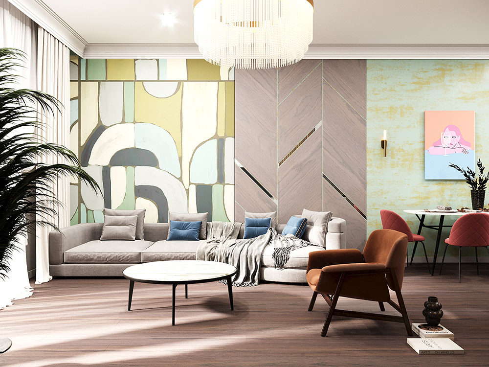 Проект гостиной с использованием обоев из коллекции «Puzzle». Яркость, экспрессия и капелька тайны сложились вместе, чтобы создать радостную атмосферу и художественную эстетику.