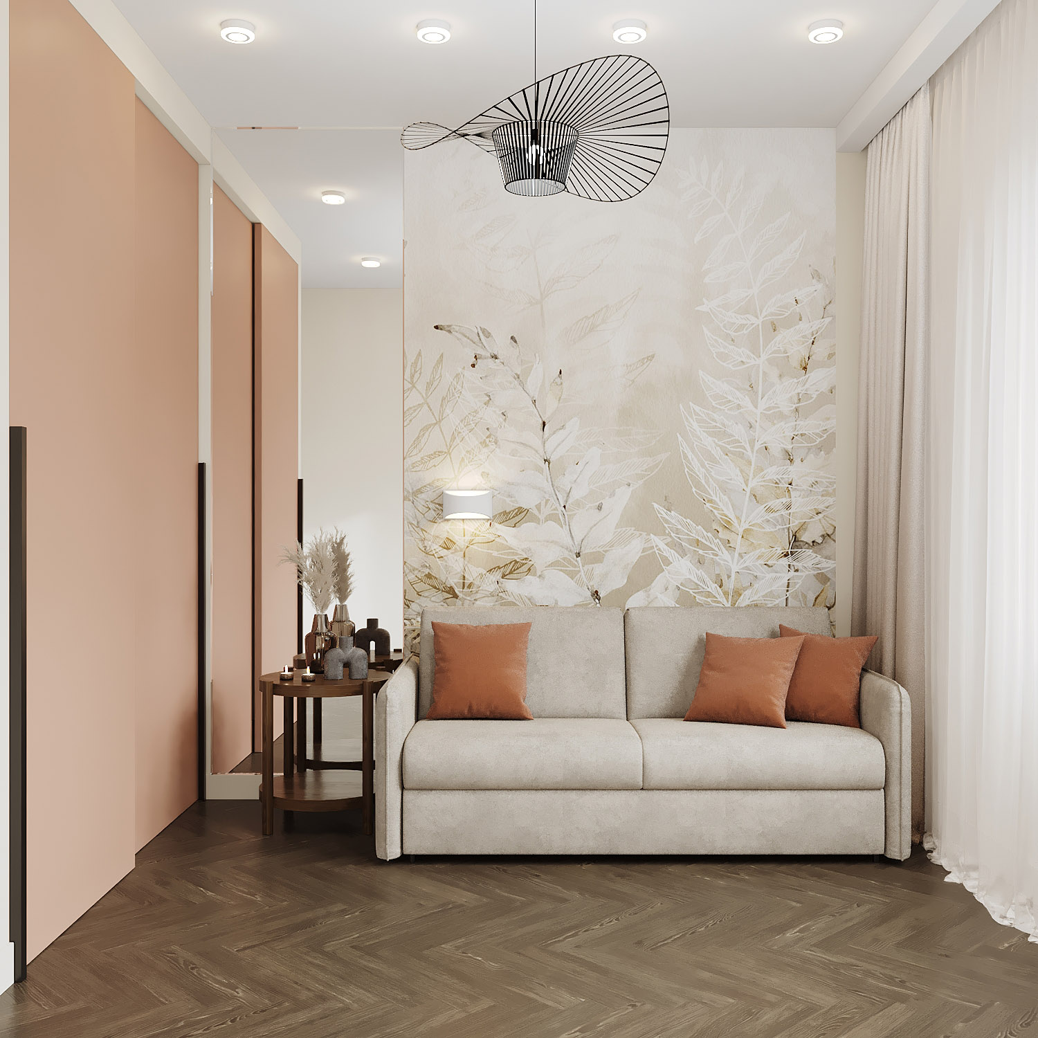 Как декоративные элементы для нашего минималистичного дизайна отлично подошли нежнейшее панно из коллекции «Selva-2019» на стене за диваном и очень необычный воздушный подвесной светильник. Обратите внимание на маленькую хитрость: комната совсем небольшая — всего 11,5 метров, но зеркало в углу между шкафом визуально добавляет воздуха в помещении, будто продолжая комнату какой-то другой зоной. Зеркало — очень забитый и изъезженный приём визуального увеличения площади, и эффективно он работает далеко не всегда. Такой вариант размещения зеркала — не в середине стены, а именно в самом углу — очень рабочий.
