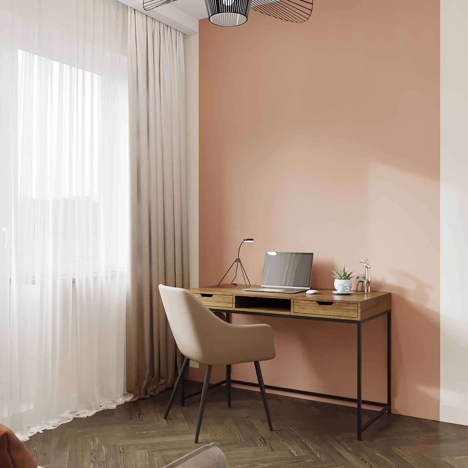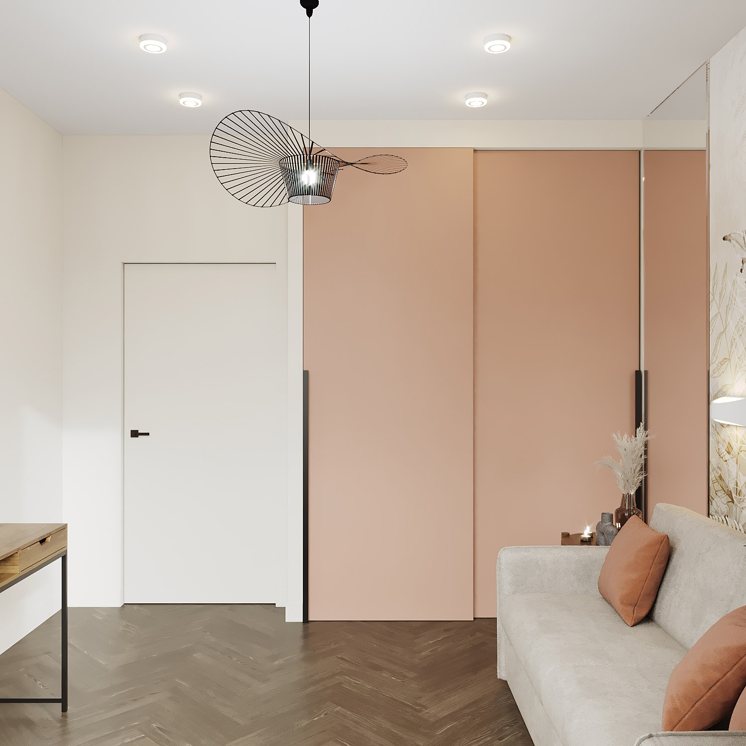 Это проект небольшой гостевой комнаты в Питерской квартире. Концепция оформления всех помещений в квартире — лаконичность и игра мягких цветовых сочетаний, внимание к мелким деталям. В гостевой в качестве цветового акцента мы выбрали пастельно-коралловый цвет — интересный и незаслуженно мало используемый оттенок. Для помещений в нежных красках это достойная и неизбитая альтернатива розовому.