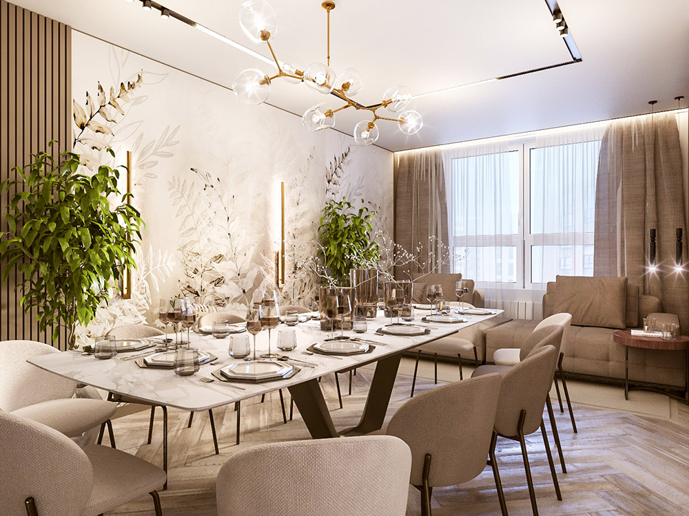 Хотим поделиться разработкой гостиной для очень гостеприимной семьи от дизайнера Натальи Яворской. Главным пунктом при составлении технического задания было размещение в гостиной площадью 20 м² обеденного стола, вмещающего 12 человек. Компании в таком составе часто собираются у хозяев в доме.