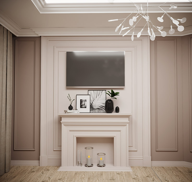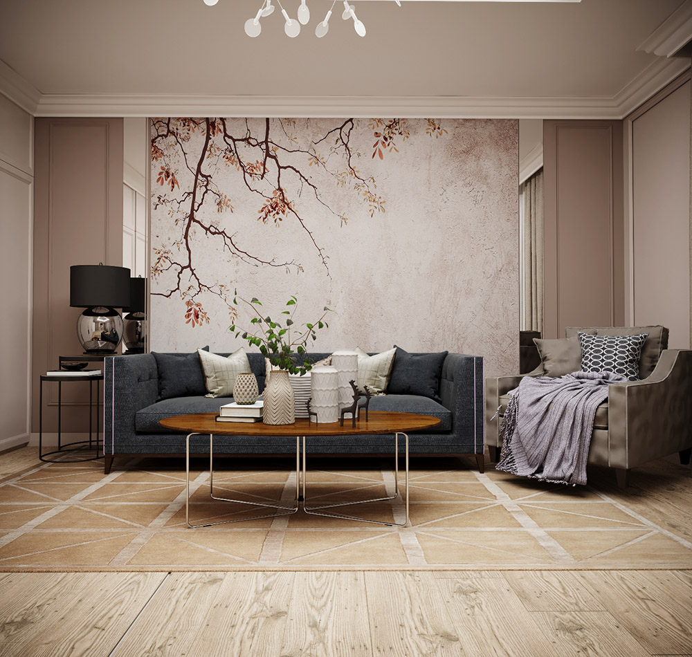Дизайн гостиной для проекта ЖК «Адмирал». Современная классика всегда в моде. Обои из коллекции «Vetve».