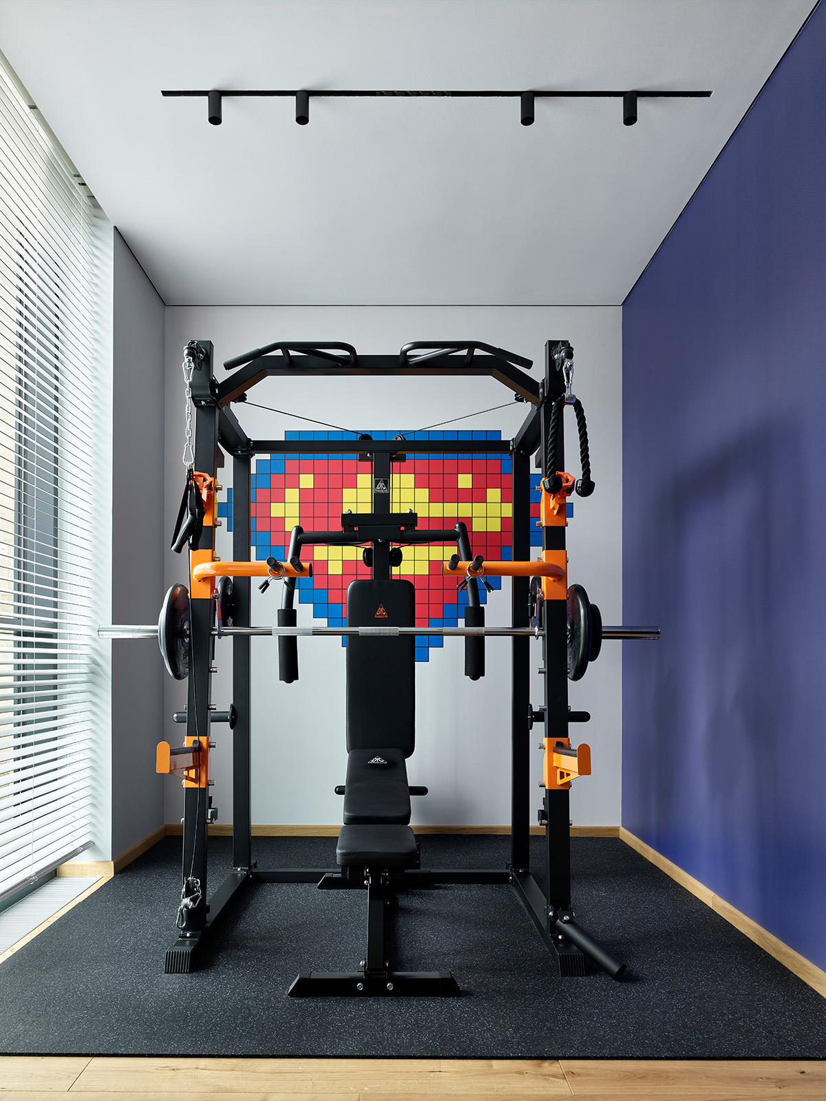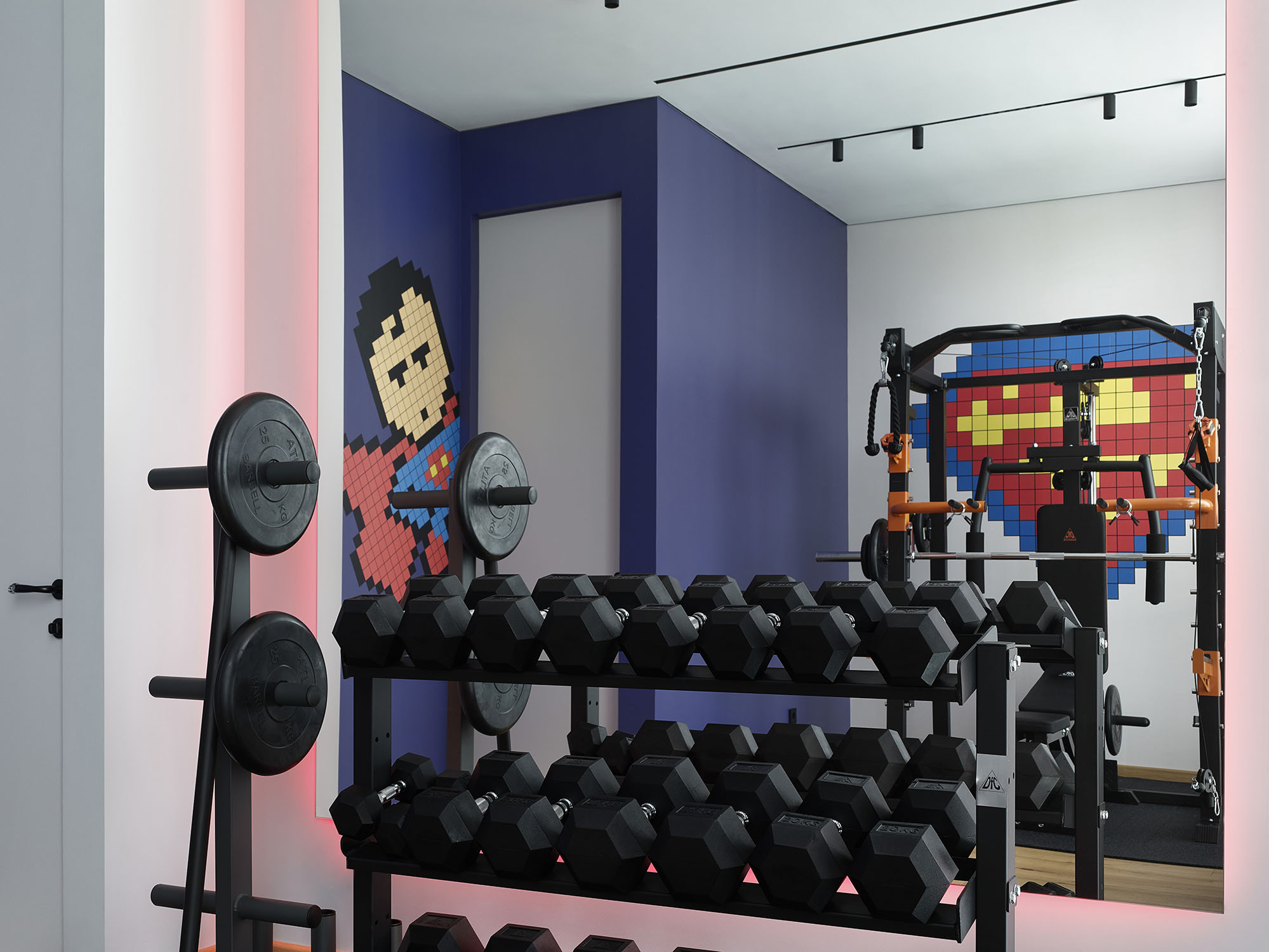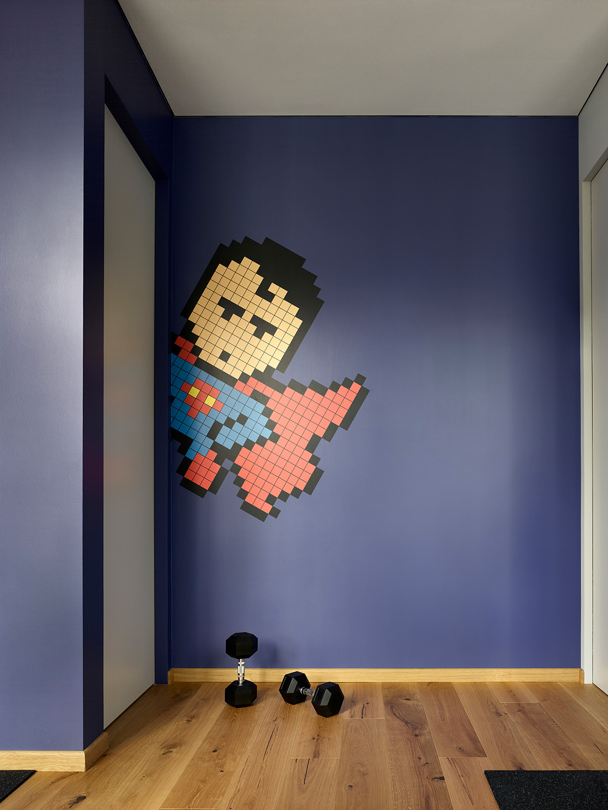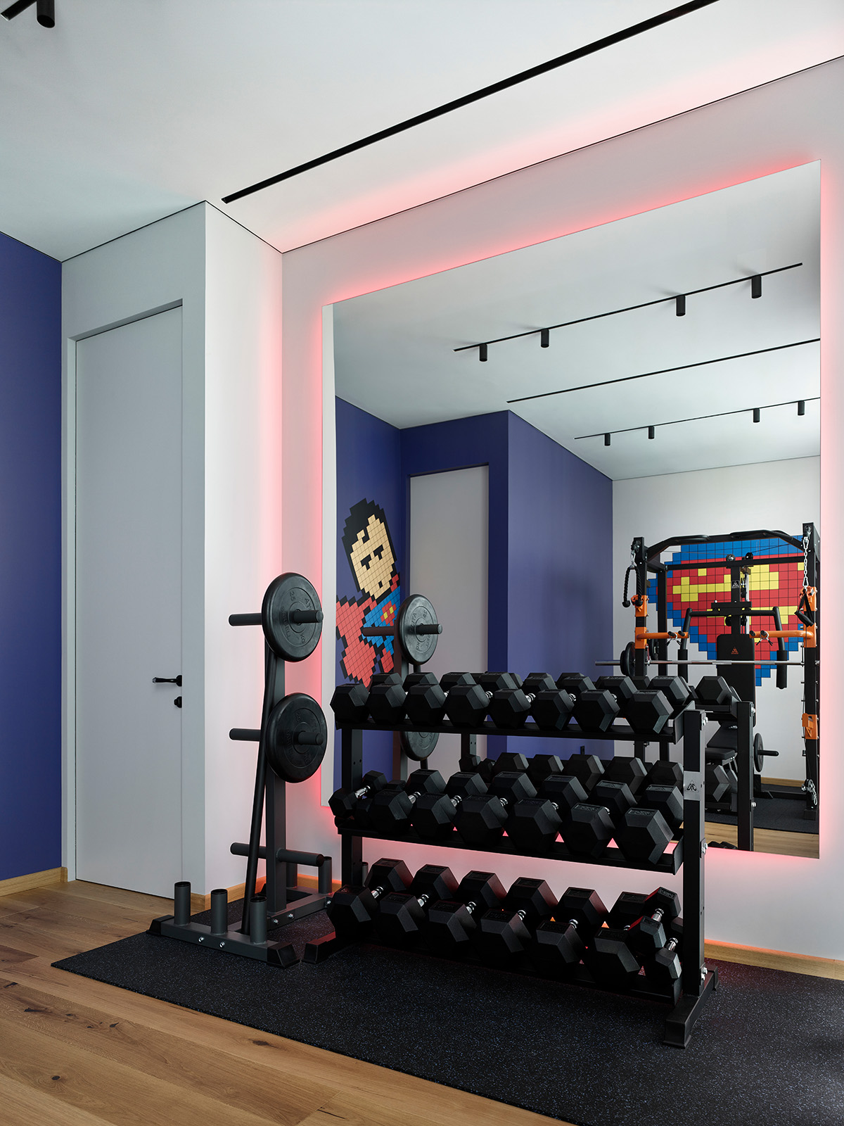 «Вишенкой» в спортзале стали НеОбои с изображением супермена. «Это шутка,» — говорит мой архитектор. По его словам, именно с этим сюжетом у него ассоциируются занятия спортом и мой характер)