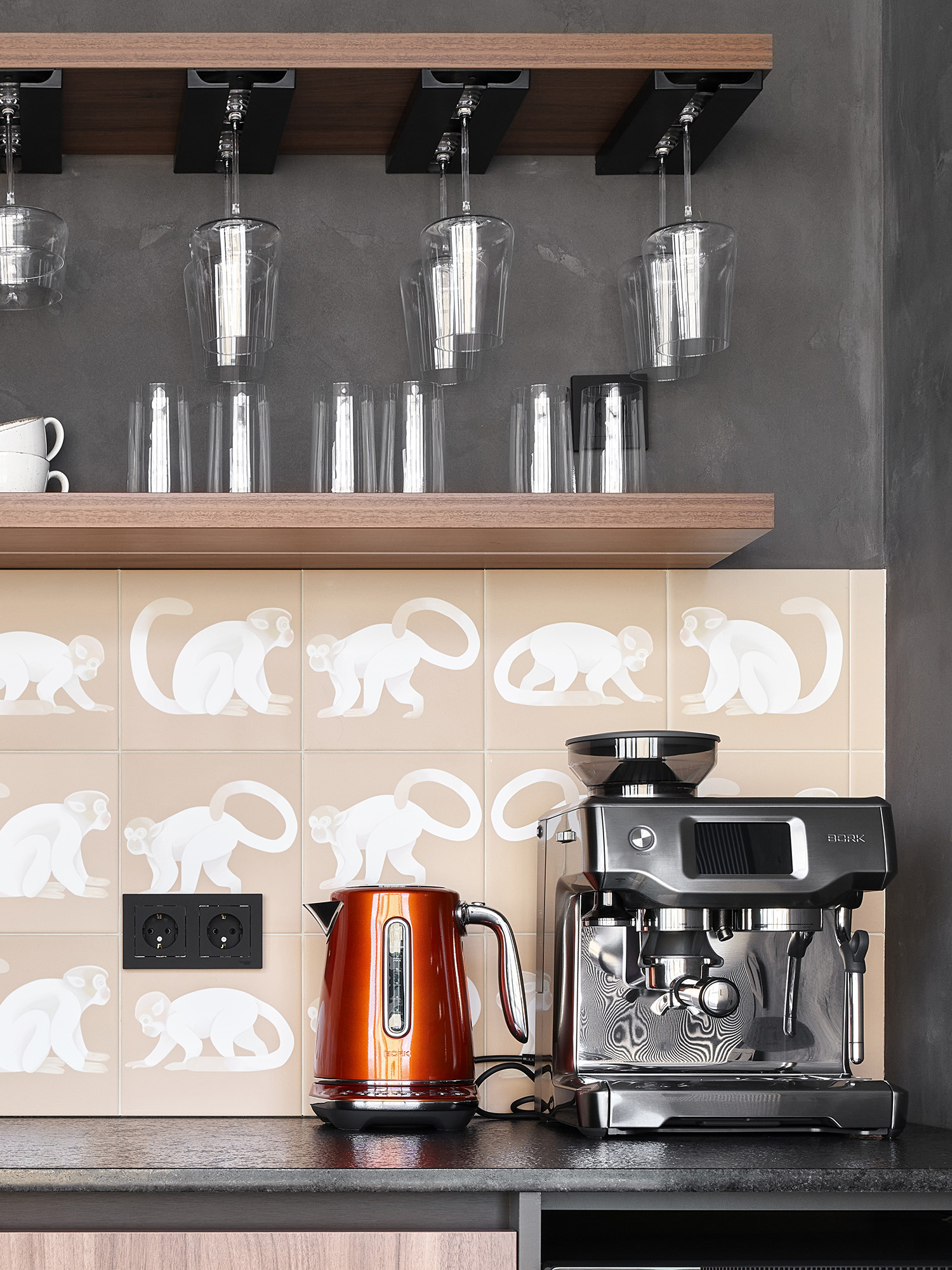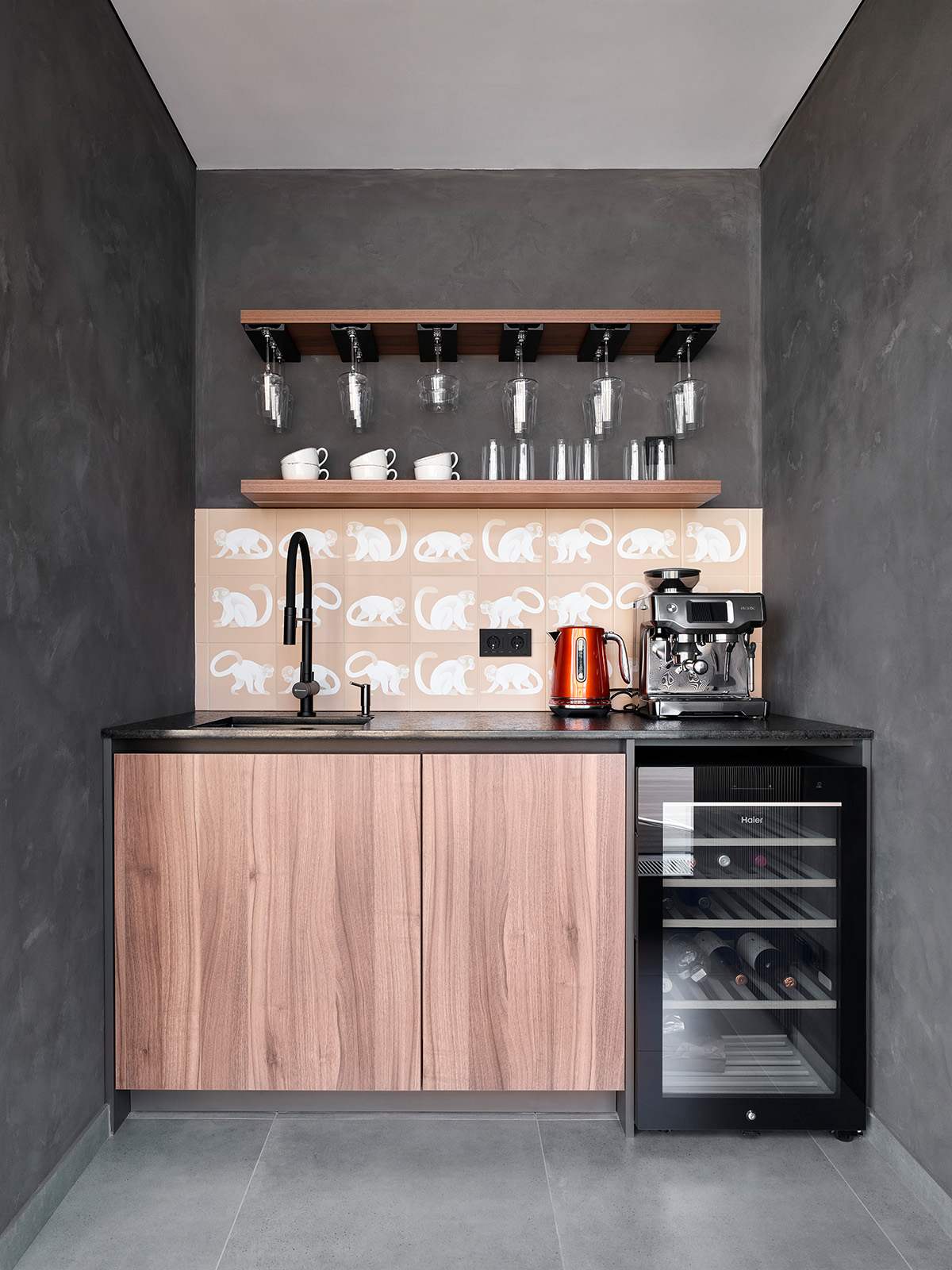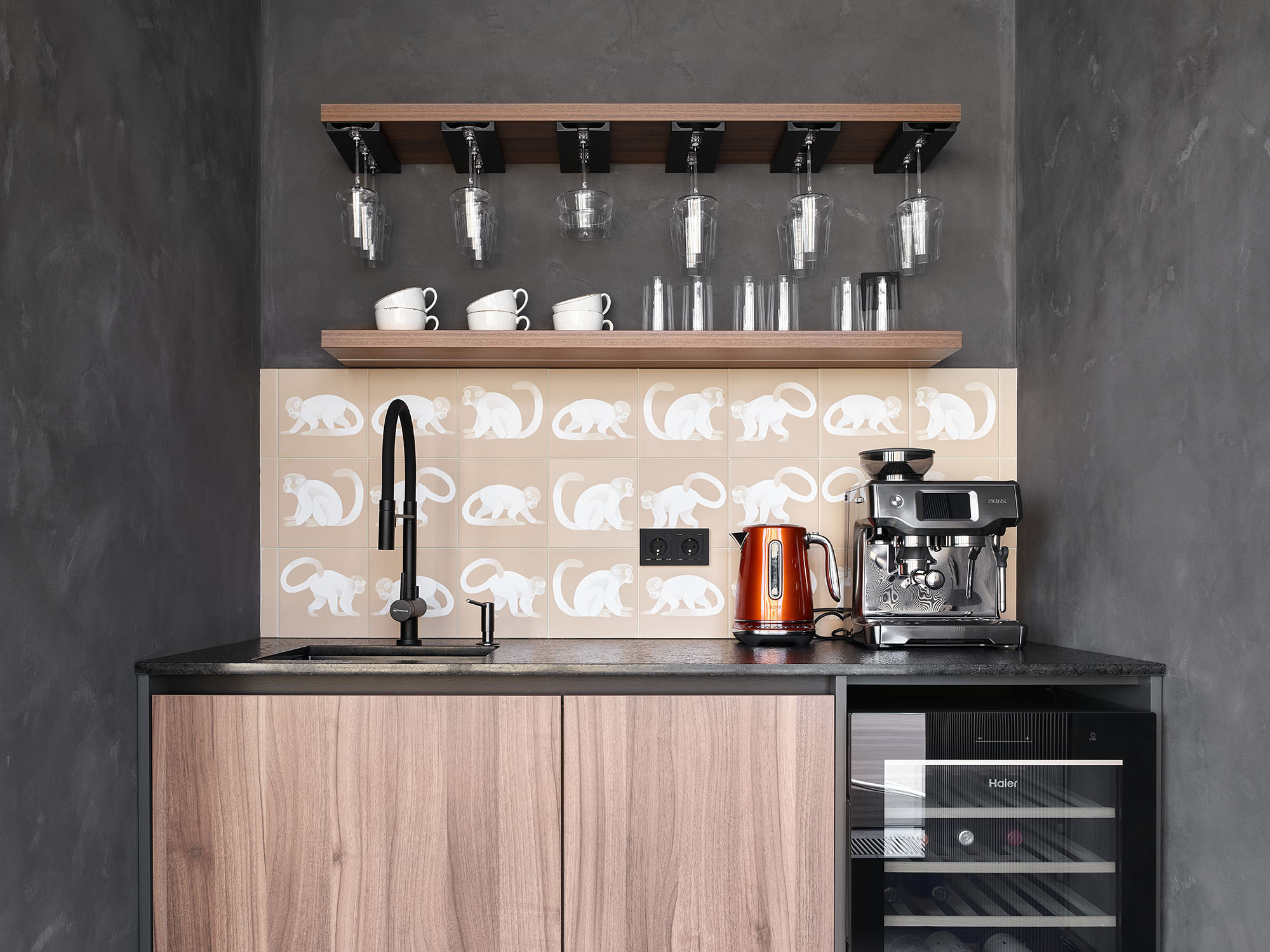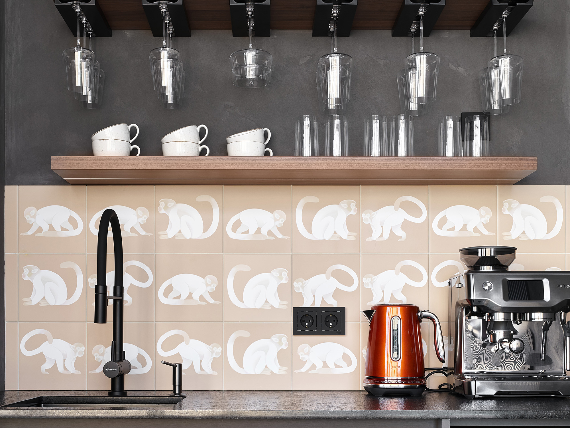 На крыше тауна сделана зона отдыха. Чтобы отдых был еще приятнее, там обустроено место, где можно сварить кофе или налить бокал вина. Вся эта «рабочая зона» оформлена в сером цвете. Чтобы оживить ее и снизить градус серьезности, мы добавили бежевую НеоПлитку с обезьянами.