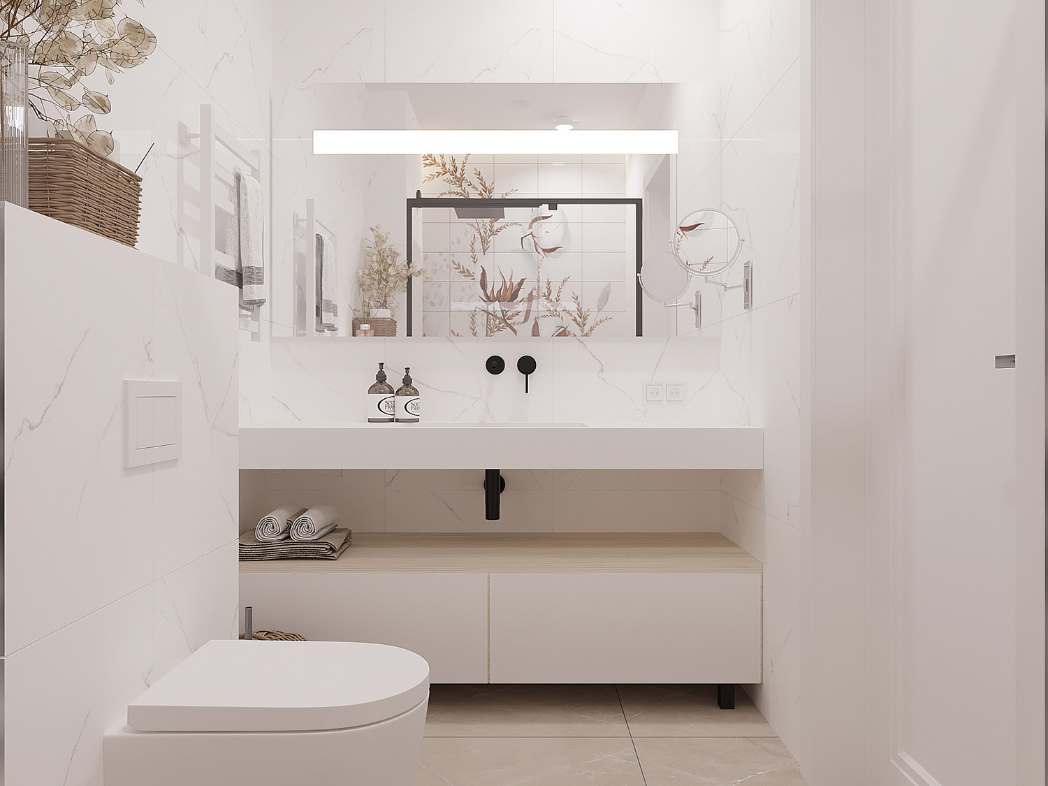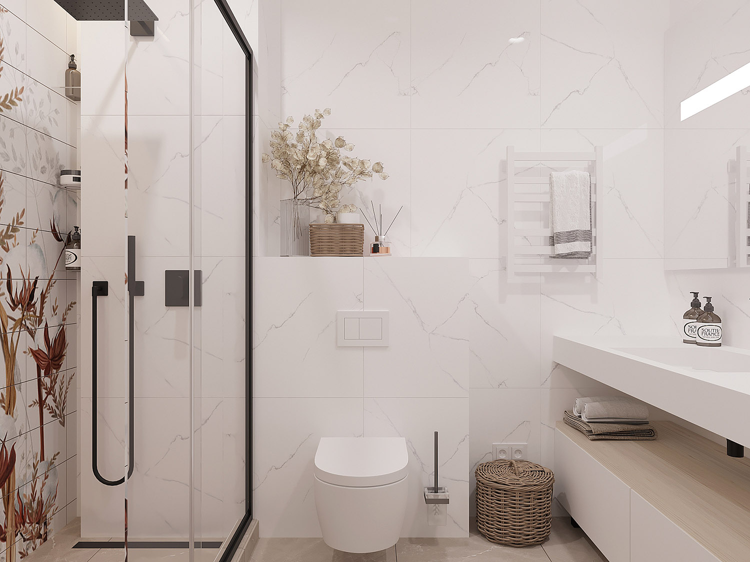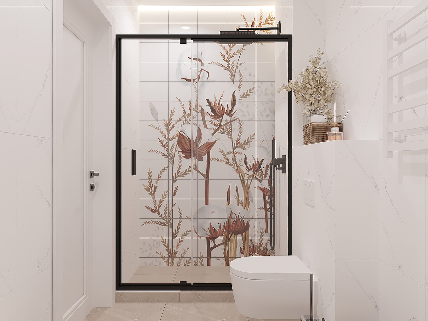Проект санузла площадью 4,5 м² в г. Чебоксары. Это второй санузел в коттедже. Почти весь коттедж оставили в брусе. Для этого санузла заложили плавающий каркас и необычную плитку из коллекции HERBARIUM. Выбирали такое панно, чтобы оно включало в себя теплую цветовую гамму и натуральные элементы: природу, цветы. Санузел получился светлый и интересный, такой, что не потеряет актуальность через многие годы.