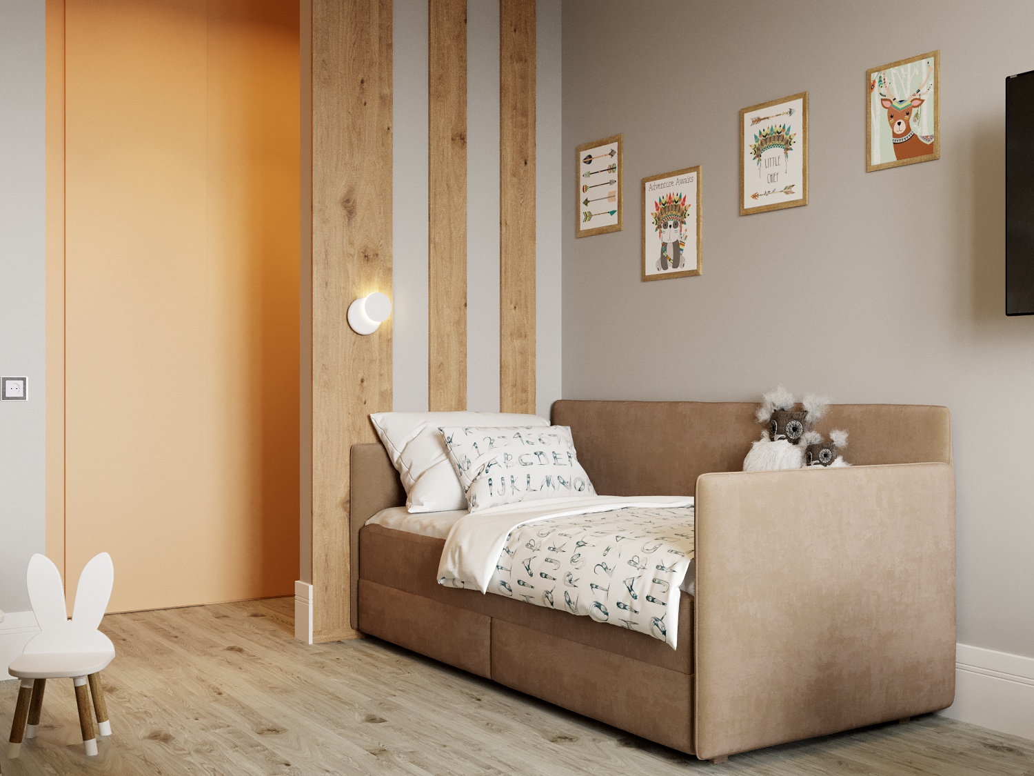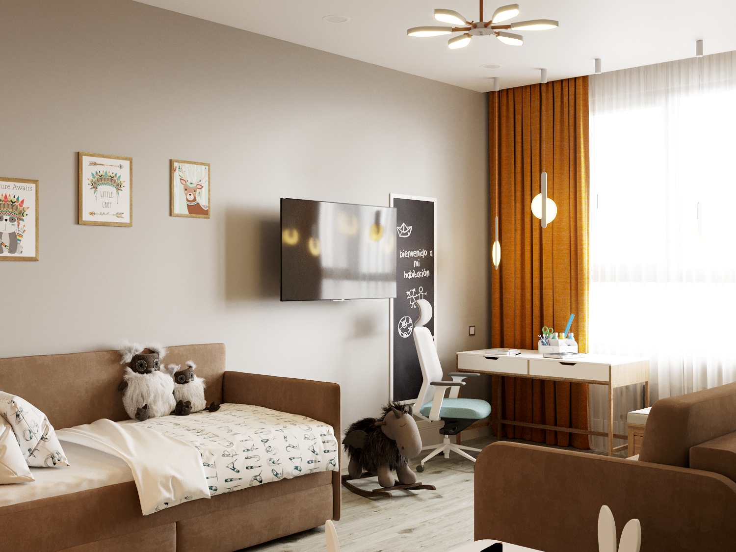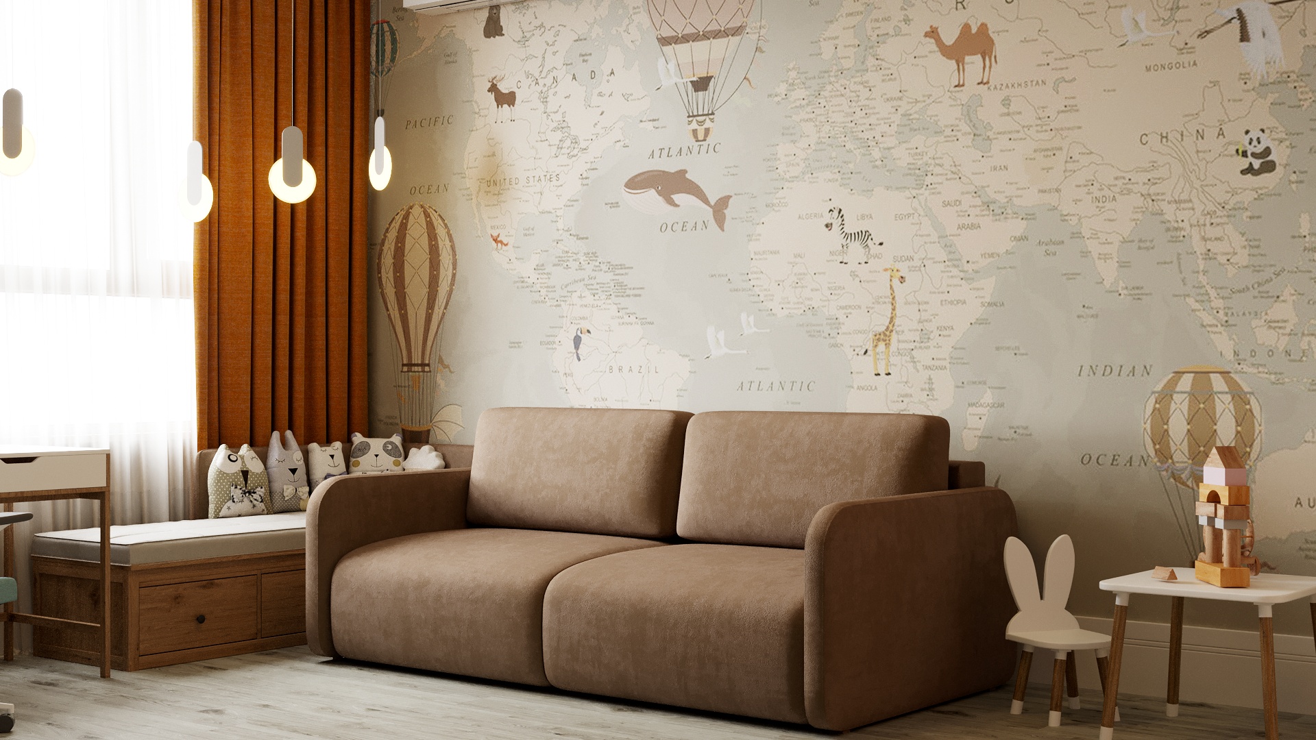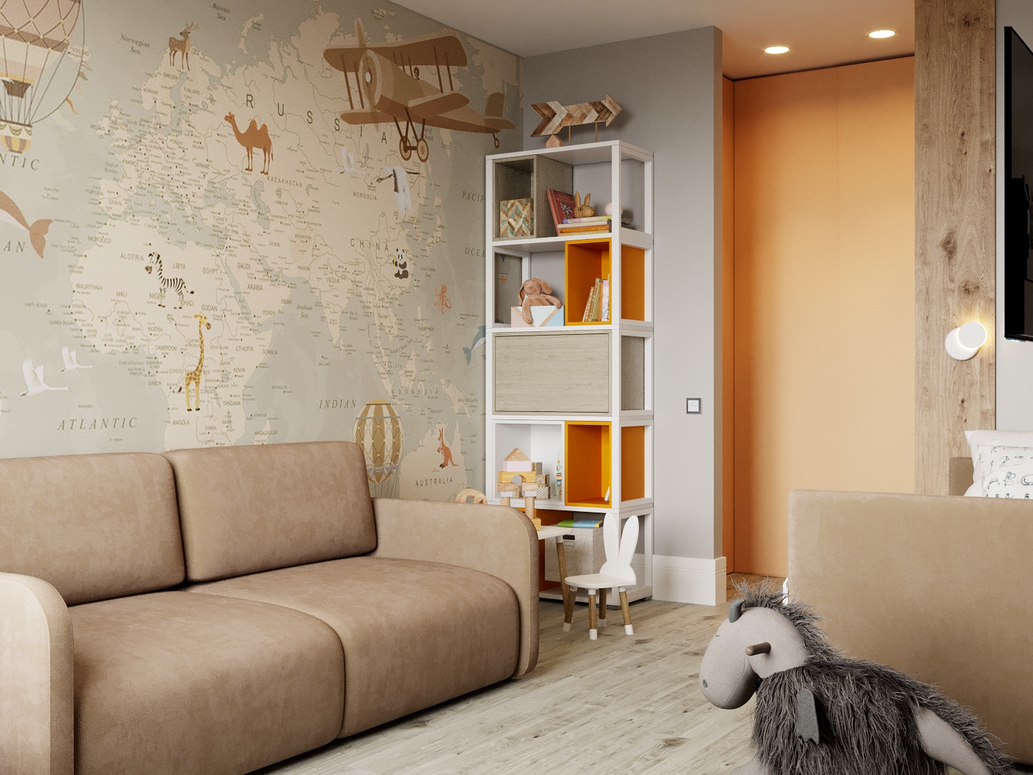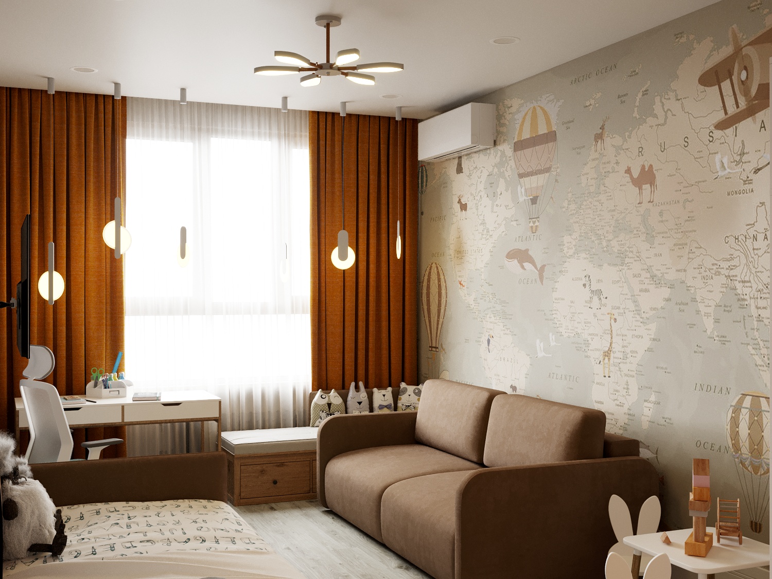 Детская в ЖК Silver площадью 21,5 м². Комната спокойная, светлая, унисекс, с выделенной зоной гардеробной при входе. На момент проектирования детская задумывалась для одного ребенка, мальчика. Но пожеланием было заранее предусмотреть место для второго ребенка в будущем, и самое главное — должна быть карта мира! В этом проекте использовалось авторское изображение. Похожие обои вы можете найти в наших коллекциях BON VOYAGE и TRAVEL KIDS.