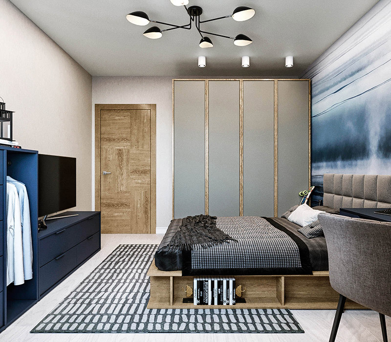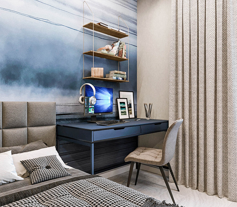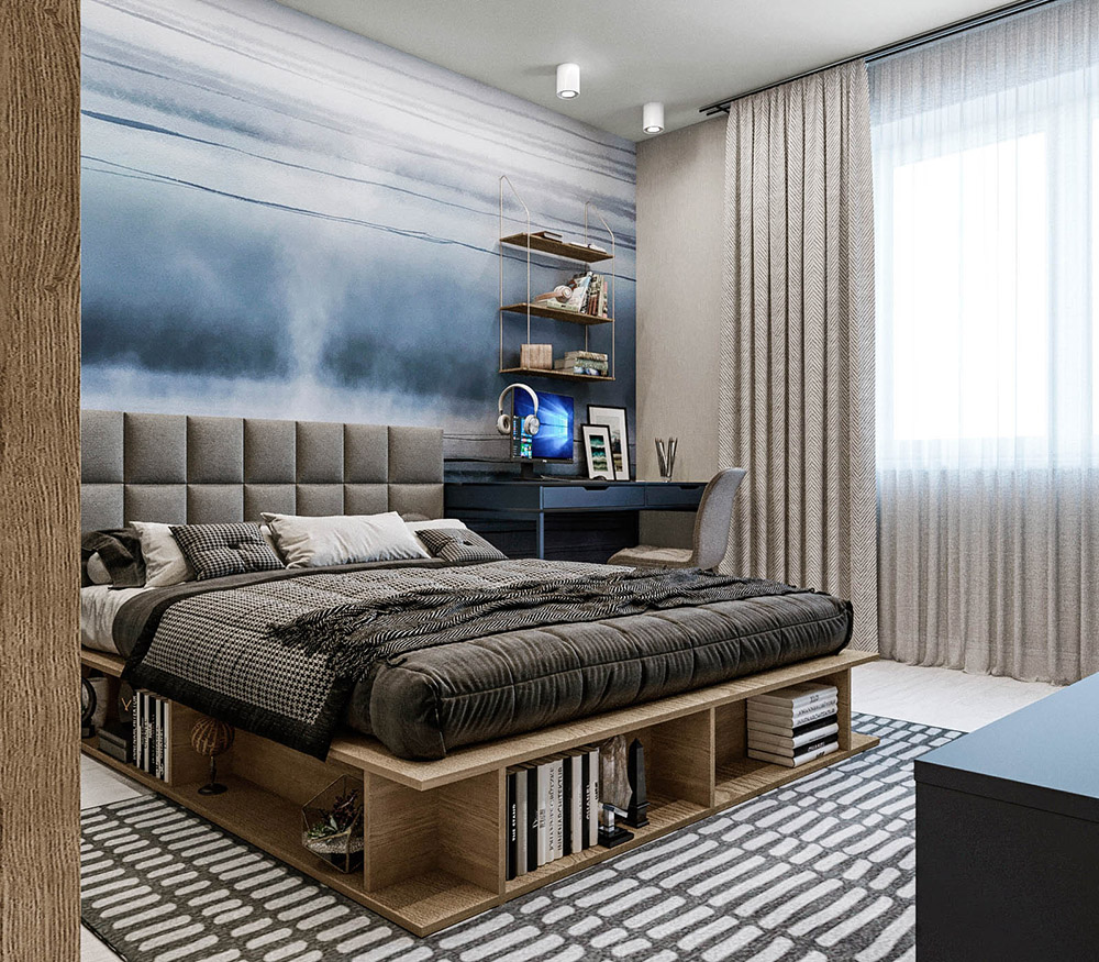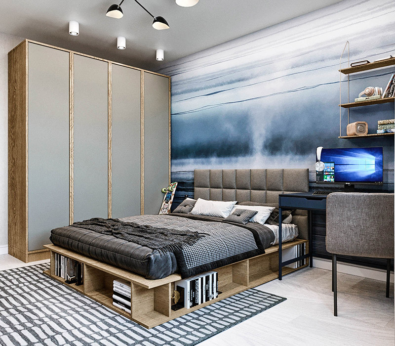 Спальня для подростка площадью 14 м². Город Петропавловск-Камчатский. Коллекция обоев «Euphoria». Заказчики просили детскую для мальчика на вырост. Он уже вступил в подростковый возраст, и комната должна отражать серьезность характера молодого человека.