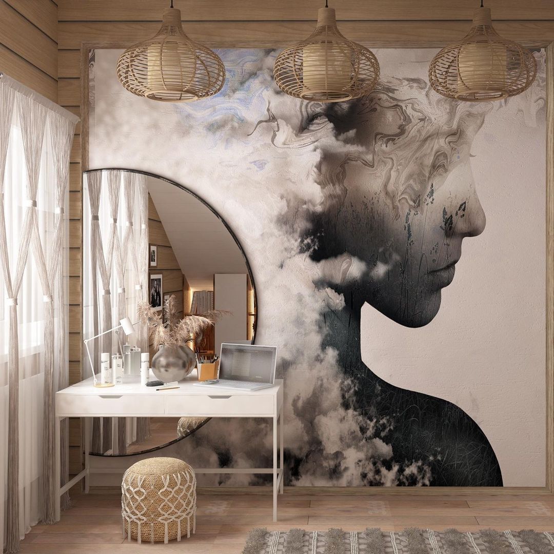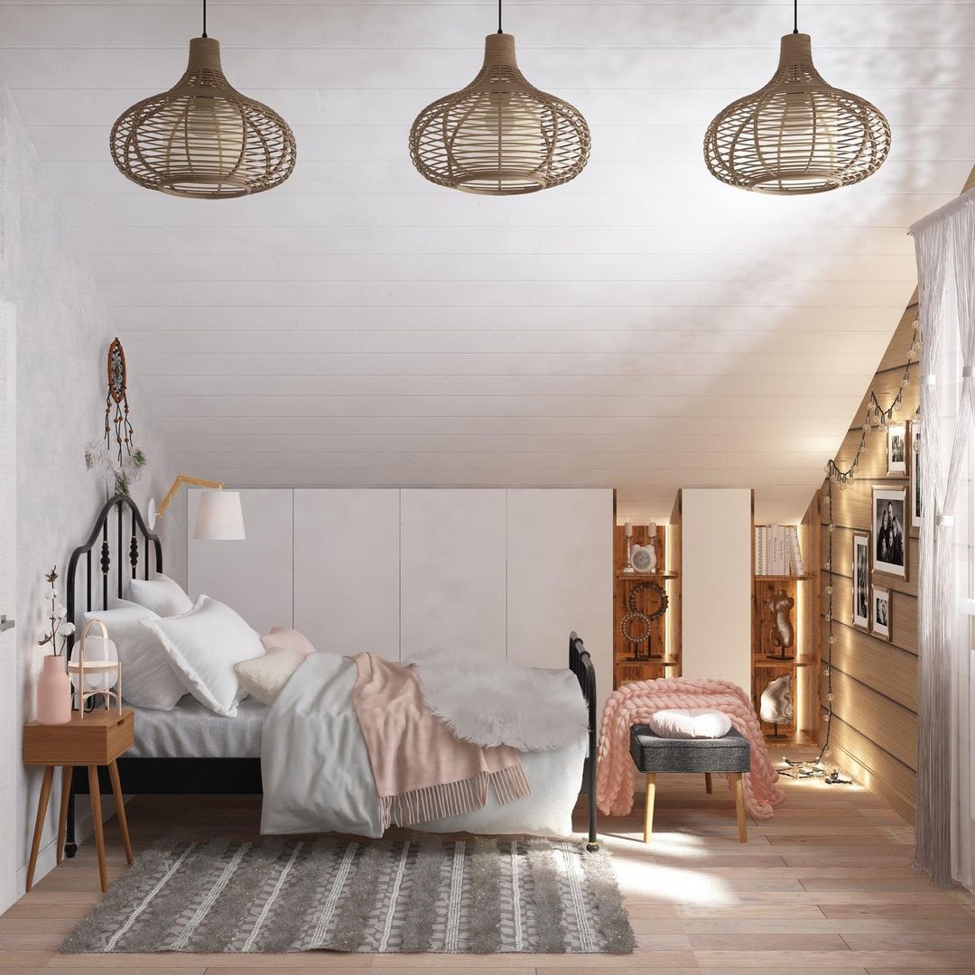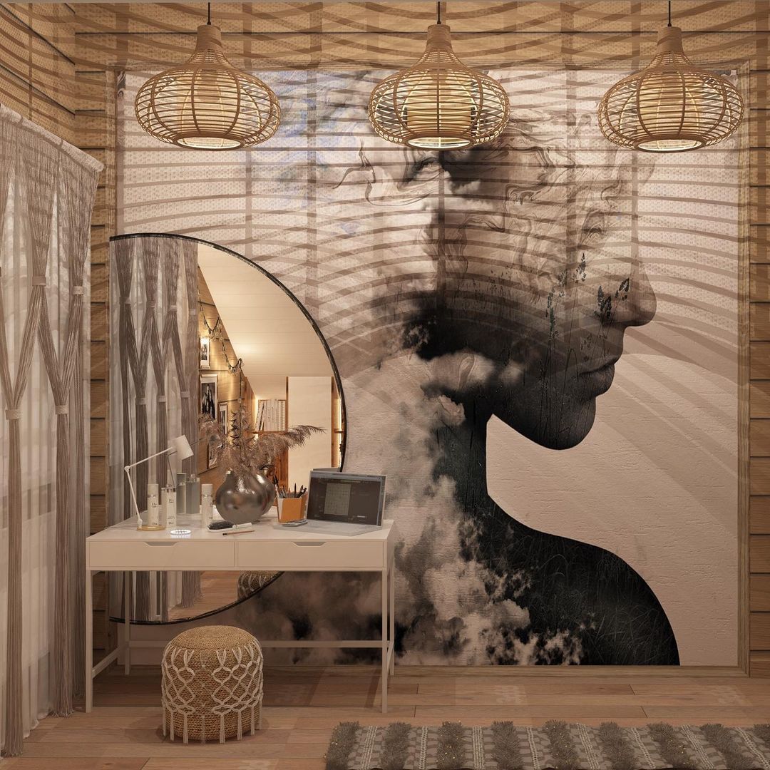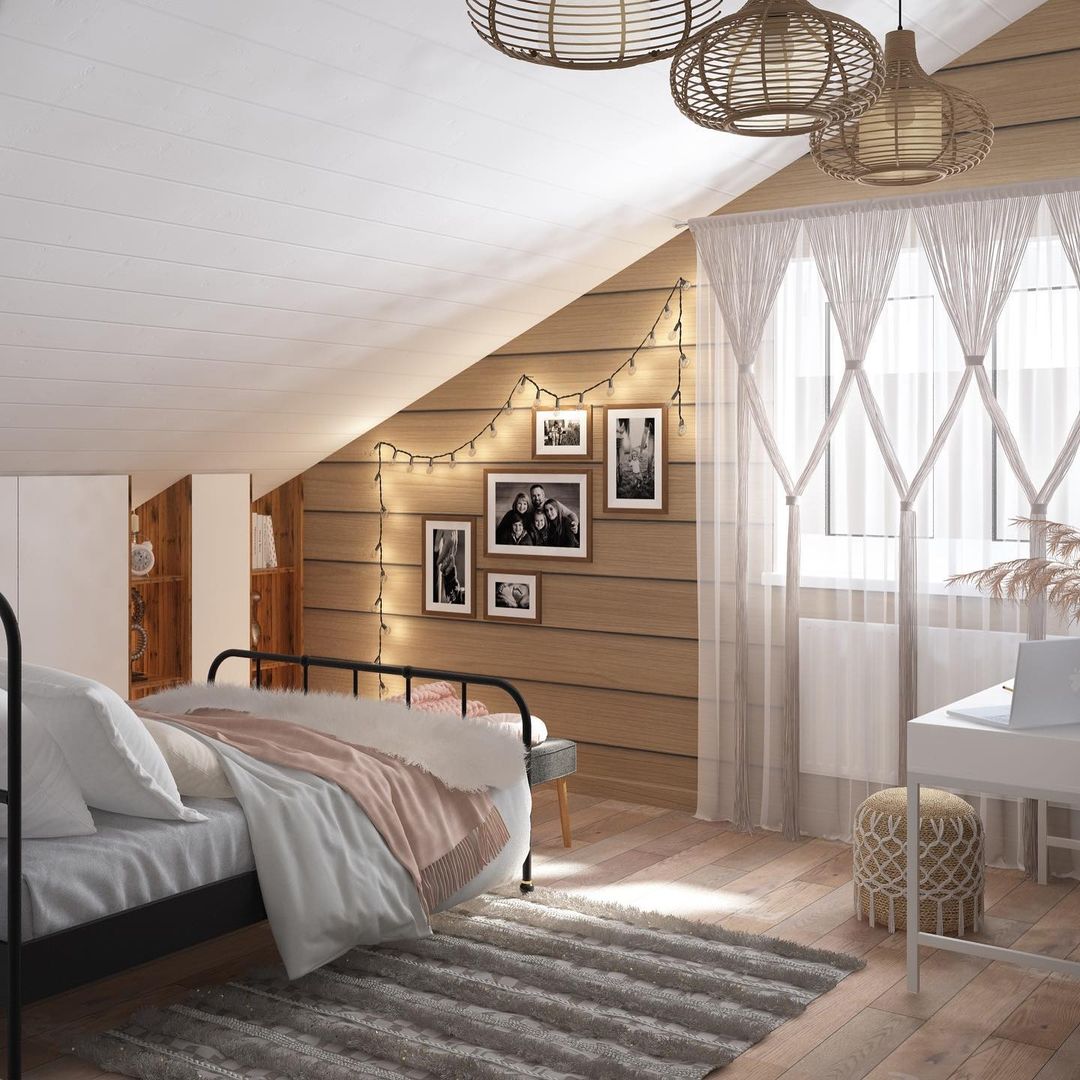 «Увидела их, и как-то сложился весь образ комнаты, — пишет об обоях дизайнер Татьяна, — Интерьер для молоденькой девушки 16 лет в загородном доме из бруса, на мансардном этаже. Юная хозяйка — творческий человек, ведет активную социальную жизнь. Интересов много и меняются. Для неё я выбрала современный стиль с элементами скандинавии и бохо, и попала сразу в яблочко! Комната сразу полюбилась и самой хозяйке, и её маме. Проект принят без правок!»