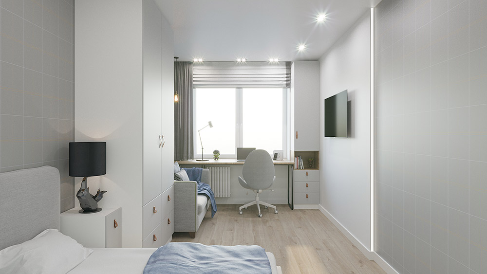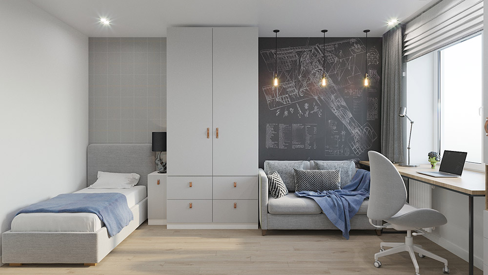 Детская площадью 12,5 м² для мальчика по имени Максим. Комната получилась очень функциональной. Тут есть зона сна, зона для принятия гостей и, конечно же, рабочий стол для выполнения уроков. Обои из коллекции «Induction».