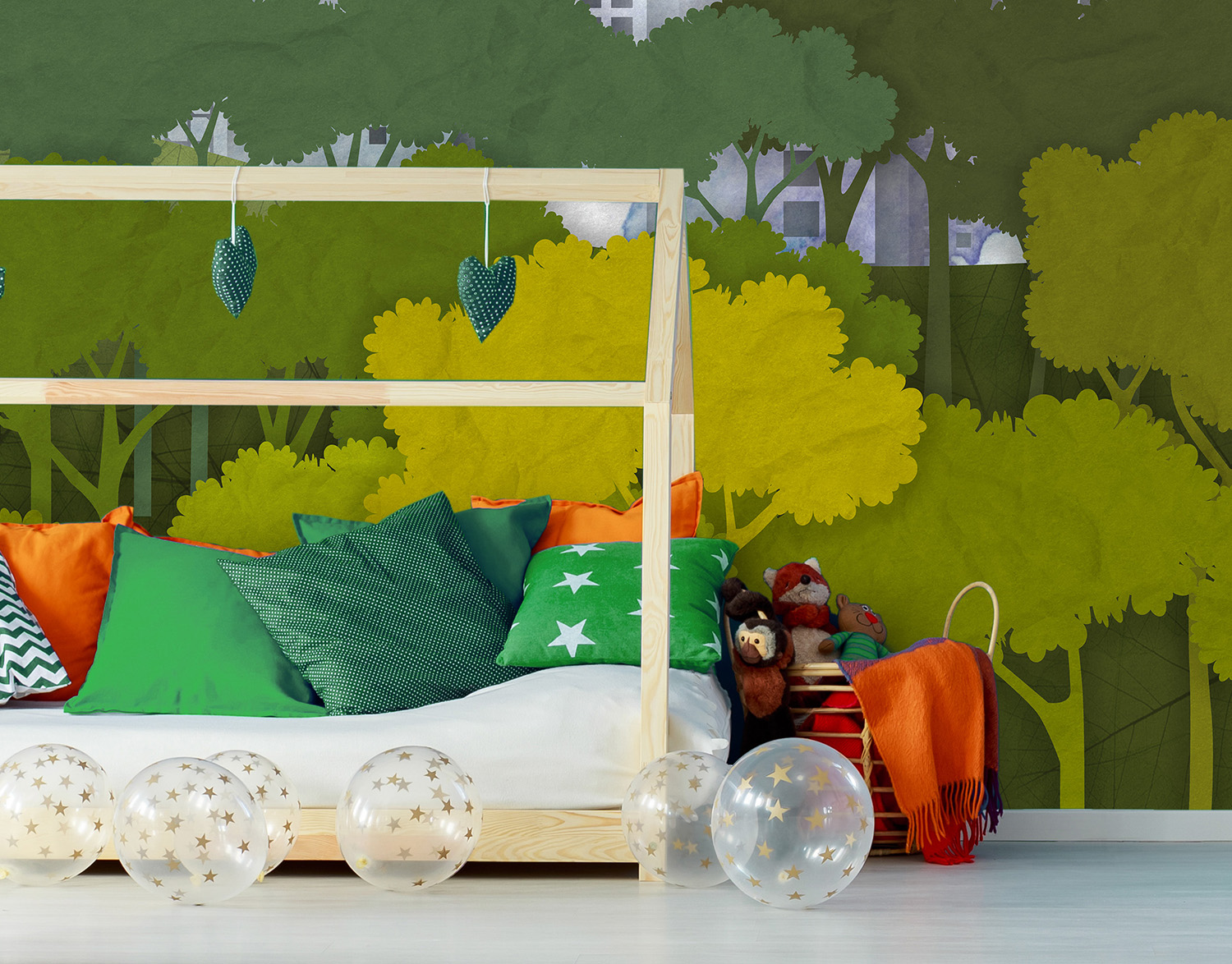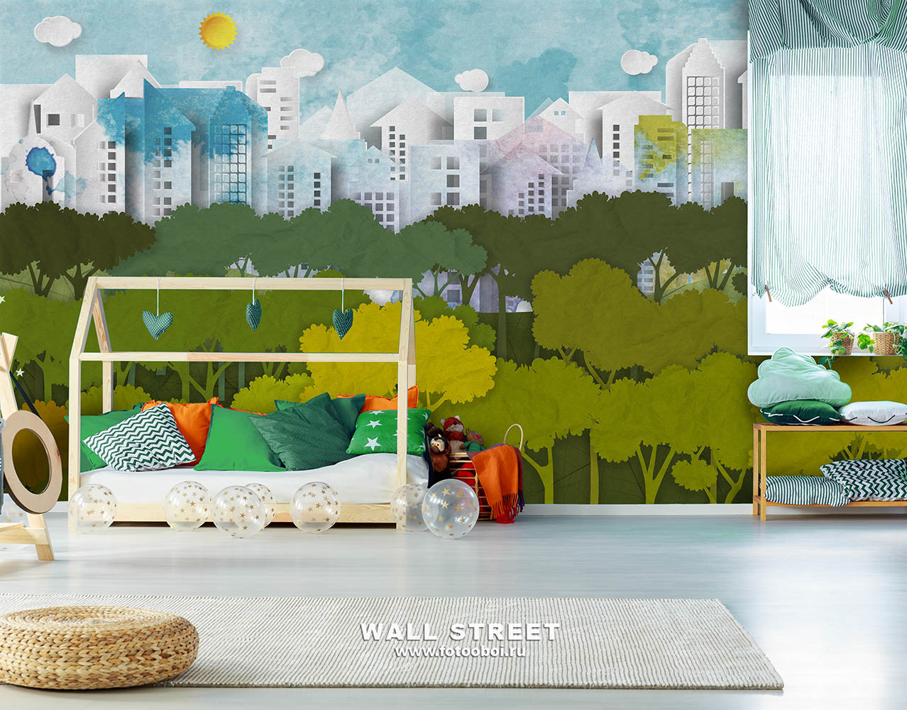 Обои из коллекций Wall Street в трех комнатах: EUPHORIA 22 в гостиной, Zoo в детской комнате, а в спальне Selva