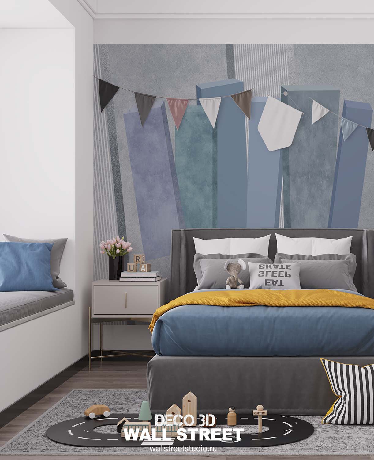 Обои из коллекций Wall Street в трех комнатах: EUPHORIA 22 в гостиной, Zoo в детской комнате, а в спальне Selva