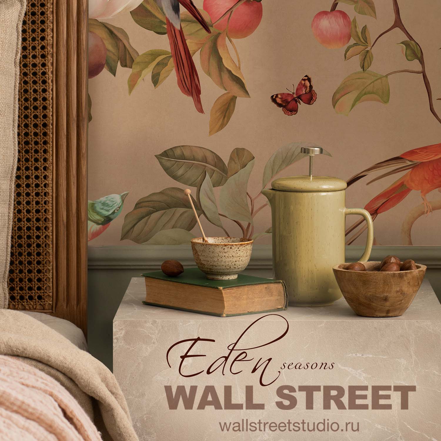 Коллекция обоев «EDEN SEASONS» от компании Wall Street — это стильное решение для оформления интерьера в современном или классическом стиле. Дизайны сочетают гармонию оттенков и текстур, создавая уютную атмосферу и визуальную целостность пространства. Материал устойчив к выгоранию и влаге, легко очищается от бытовых загрязнений без потери внешнего вида. Обои подходят для любых помещений — от жилых до офисных интерьеров, отлично комбинируются между собой и с другими коллекциями. При поклейке рекомендуется использовать качественный клей и стандартную подготовку основания для долговечного результата.