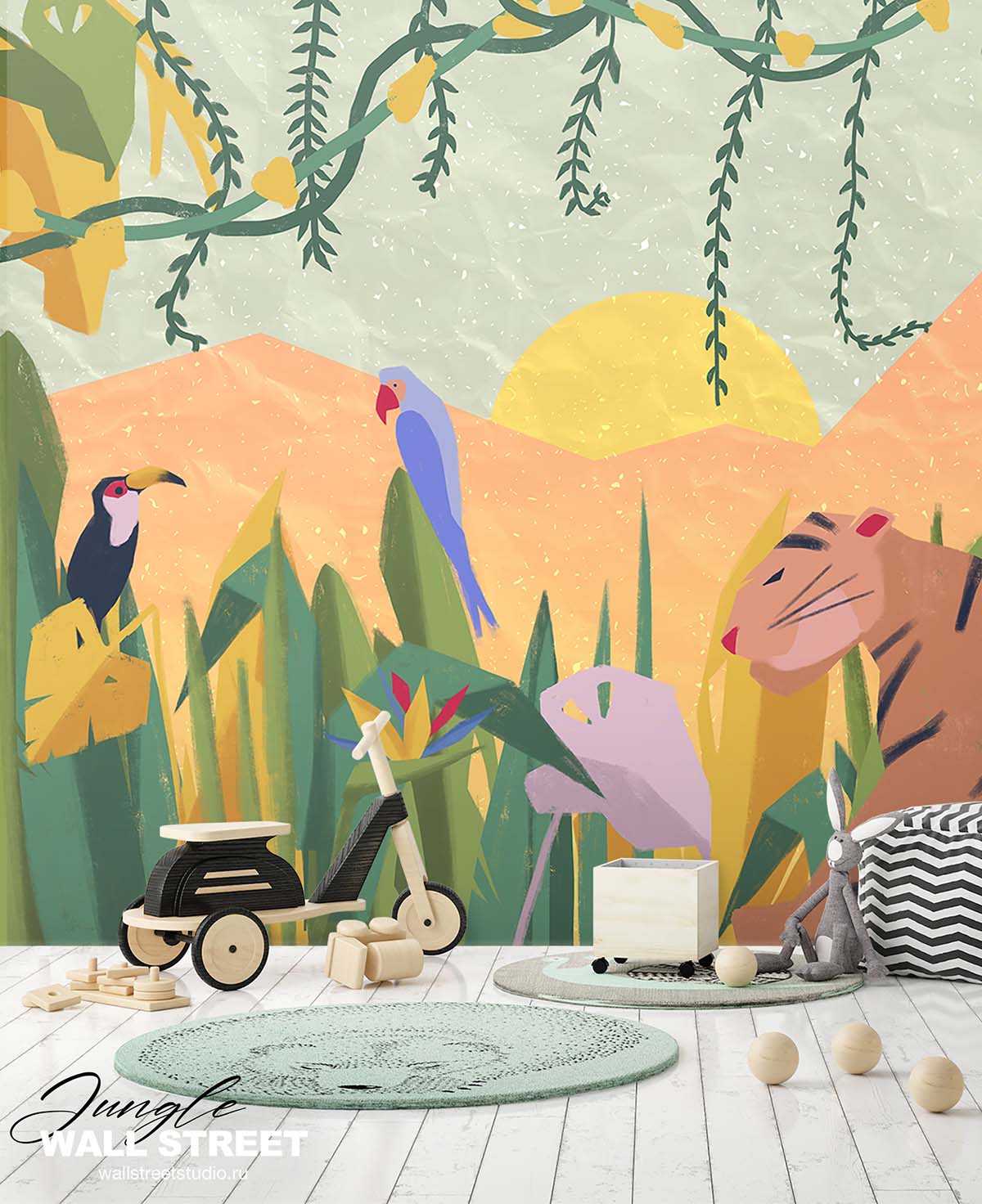 Обои из коллекций Wall Street в трех комнатах: EUPHORIA 22 в гостиной, Zoo в детской комнате, а в спальне Selva
