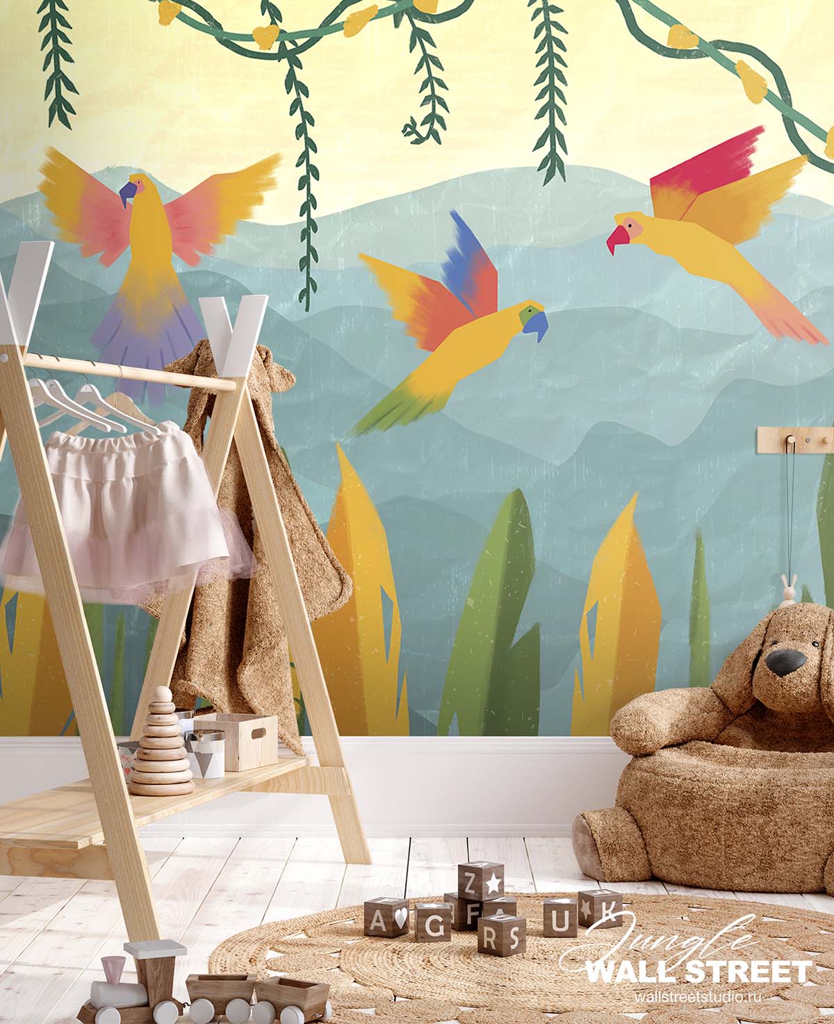 Обои из коллекций Wall Street в трех комнатах: EUPHORIA 22 в гостиной, Zoo в детской комнате, а в спальне Selva