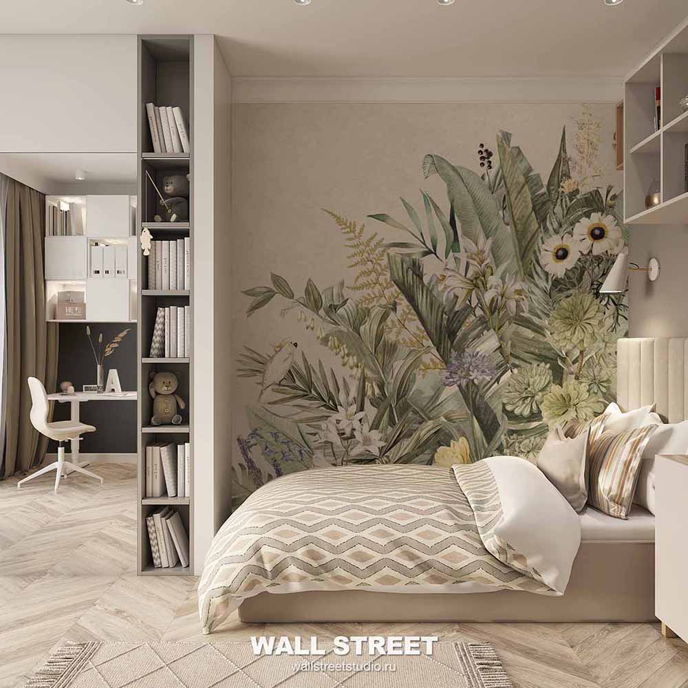 Обои из коллекций Wall Street в трех комнатах: EUPHORIA 22 в гостиной, Zoo в детской комнате, а в спальне Selva