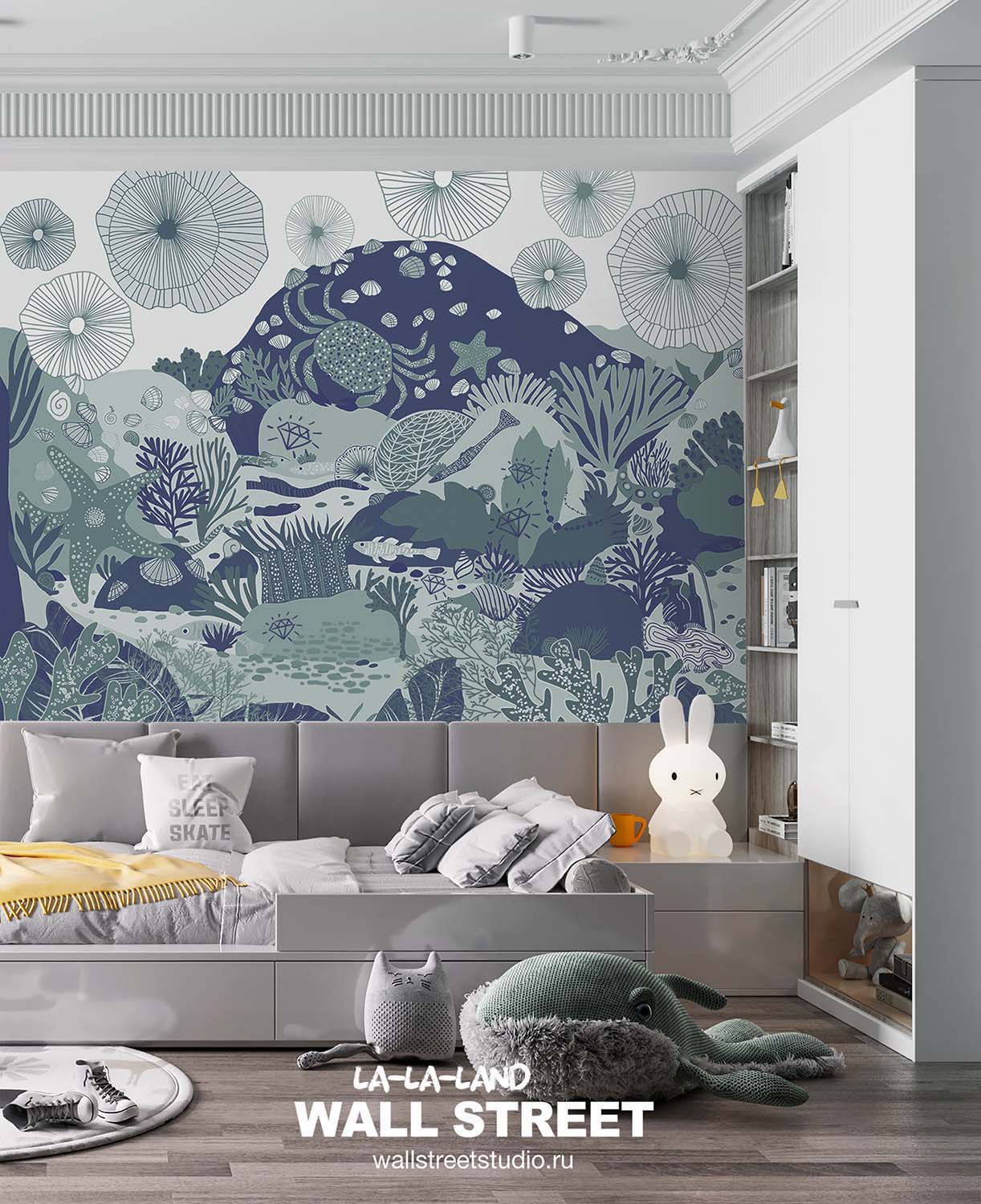 Обои из коллекций Wall Street в трех комнатах: EUPHORIA 22 в гостиной, Zoo в детской комнате, а в спальне Selva