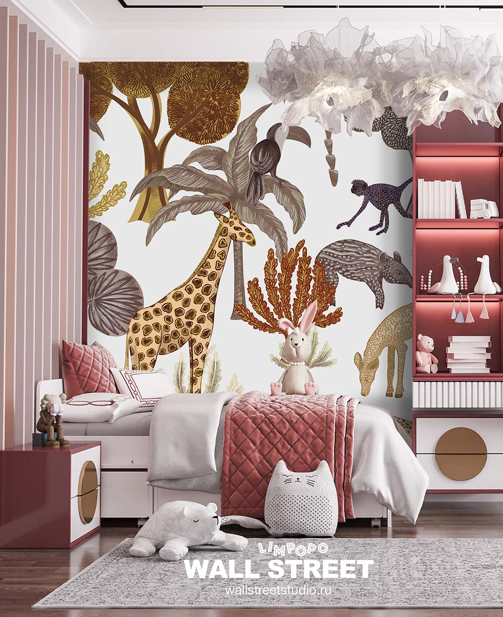 Обои из коллекций Wall Street в трех комнатах: EUPHORIA 22 в гостиной, Zoo в детской комнате, а в спальне Selva