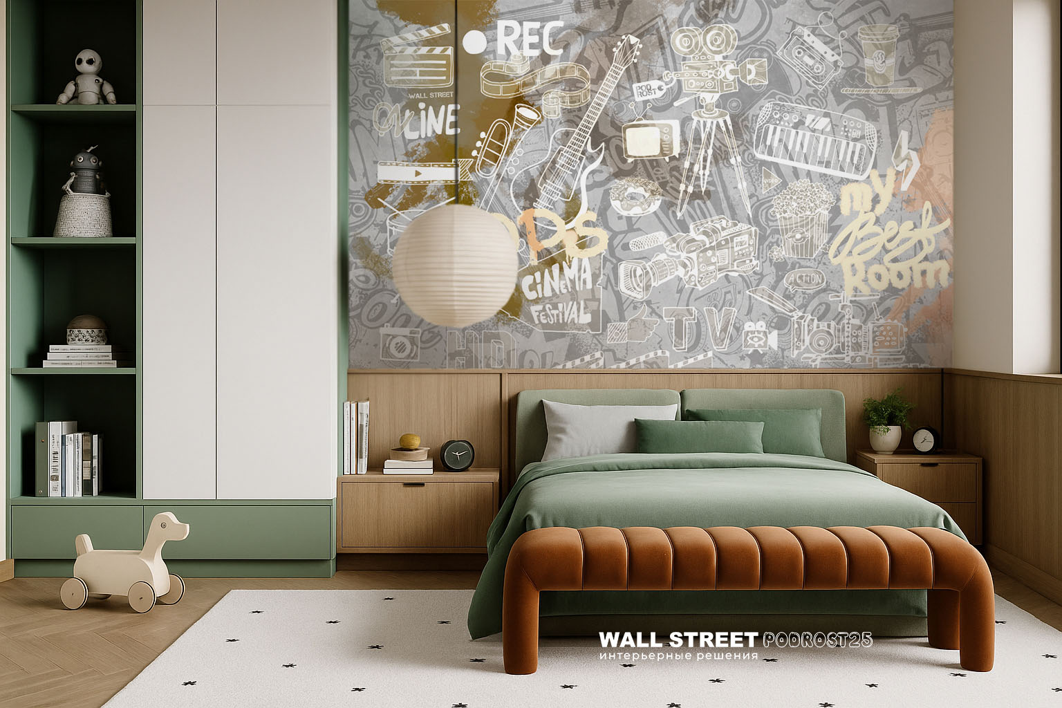 Обои из коллекций Wall Street в трех комнатах: EUPHORIA 22 в гостиной, Zoo в детской комнате, а в спальне Selva